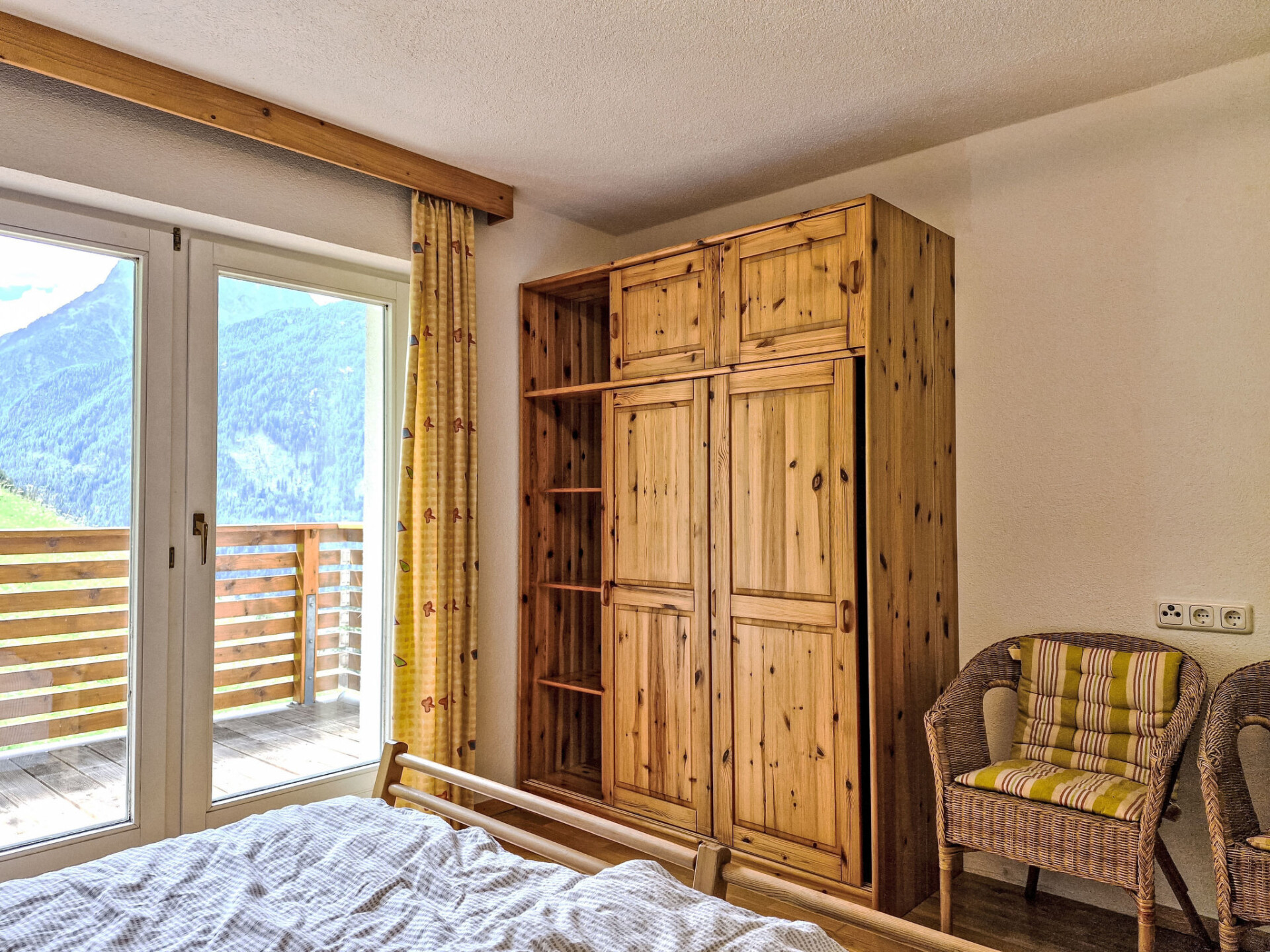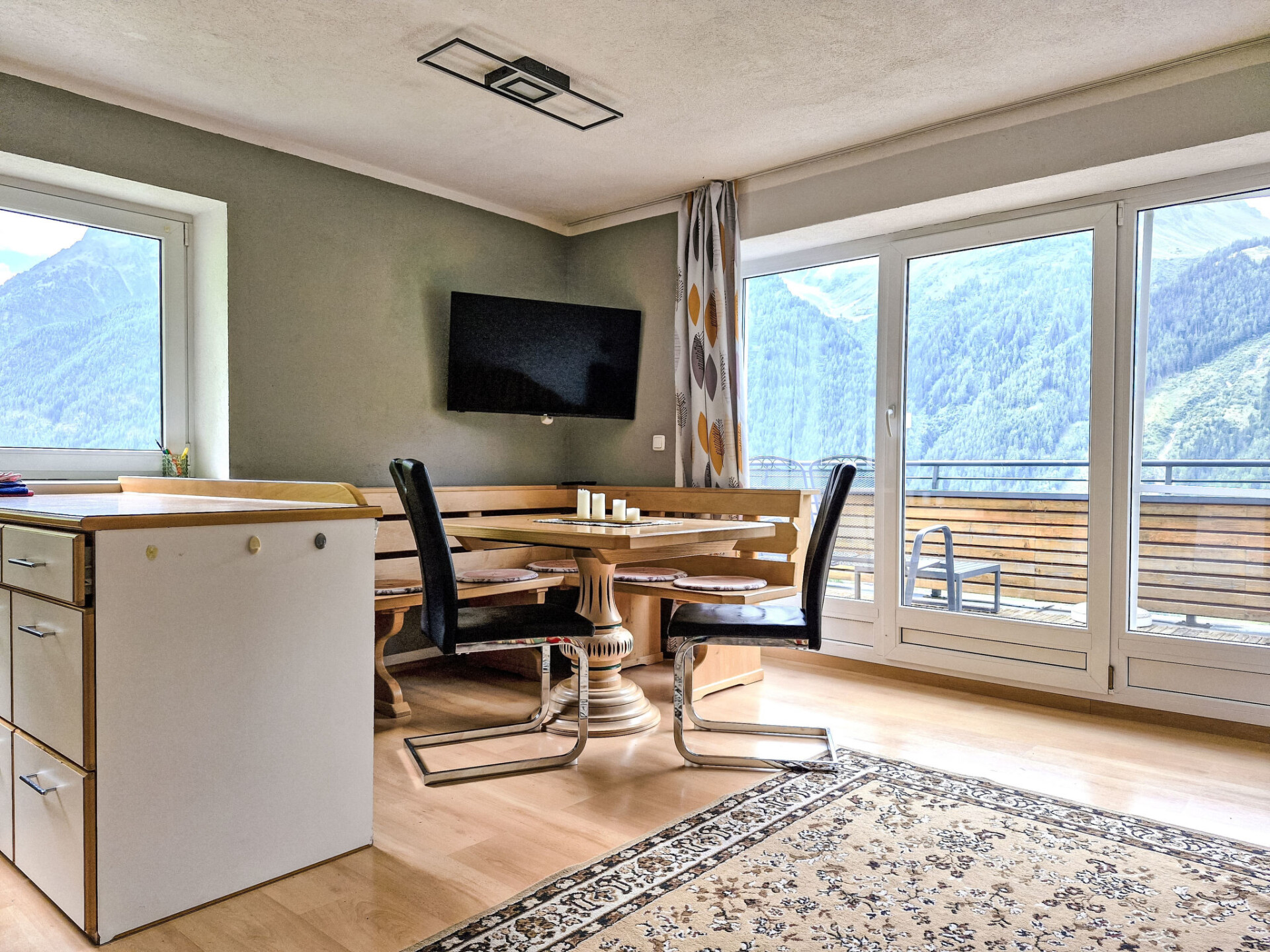 Appartement 3-kamers 75 m2 op de 1e verdieping. Mooi ingericht: 1 2-pers. kamer met 1 2-pers bed en douche/WC. Uitgang naar het balkon. 1 2-pers. kamer met 1 bed, 1 2-pers bed en bad/WC. Uitgang naar het balkon. Groot woonkeuken (oven, afwasmachine, 4 keramische glas kookplaten, waterkoker, magnetron, elektrische koffiemachine) met Sat-TV. Uitgang naar het balkon. Houten vloeren. Panoramazicht op de bergen. Niet rokers woning. Rookmelders.