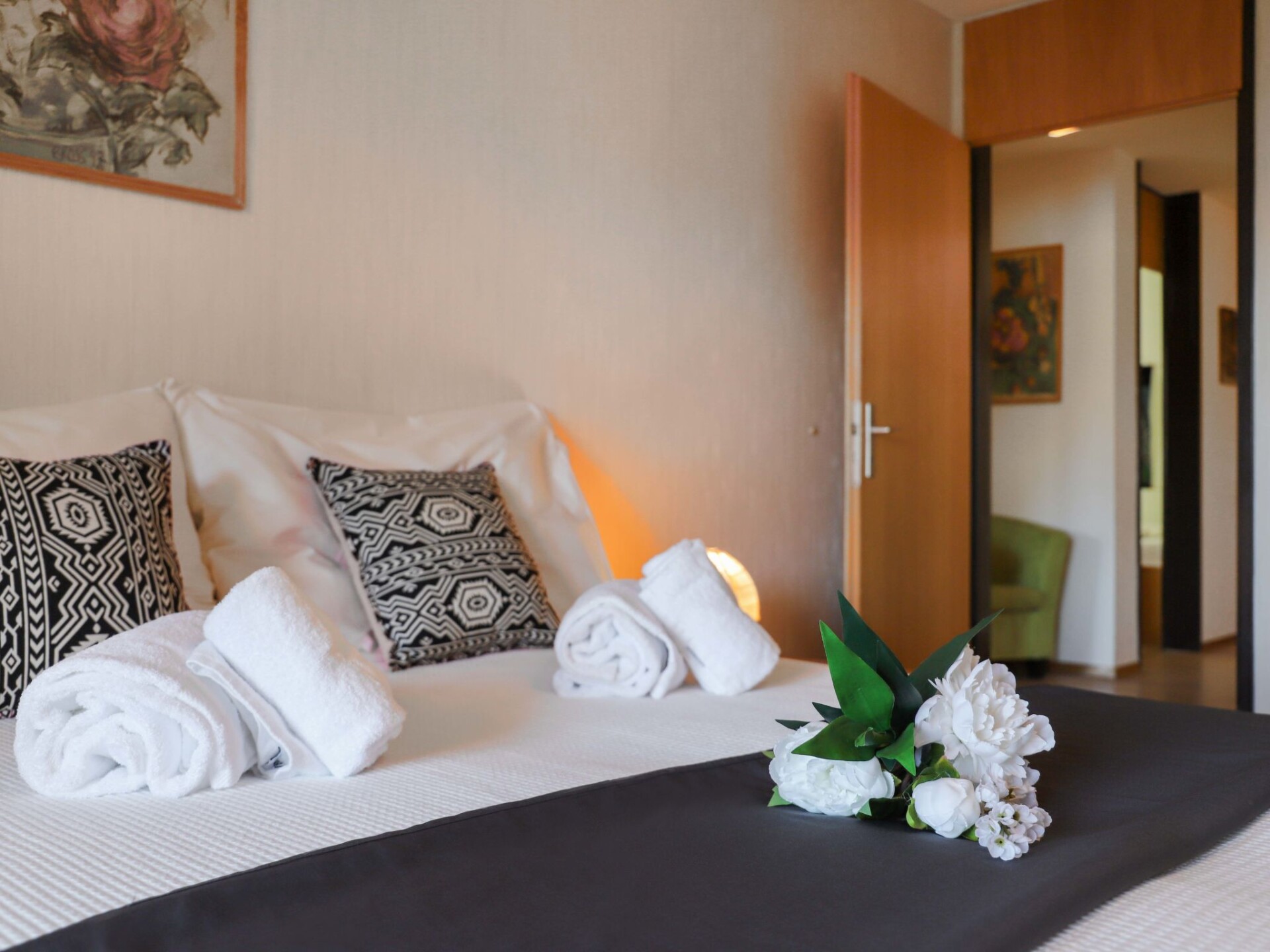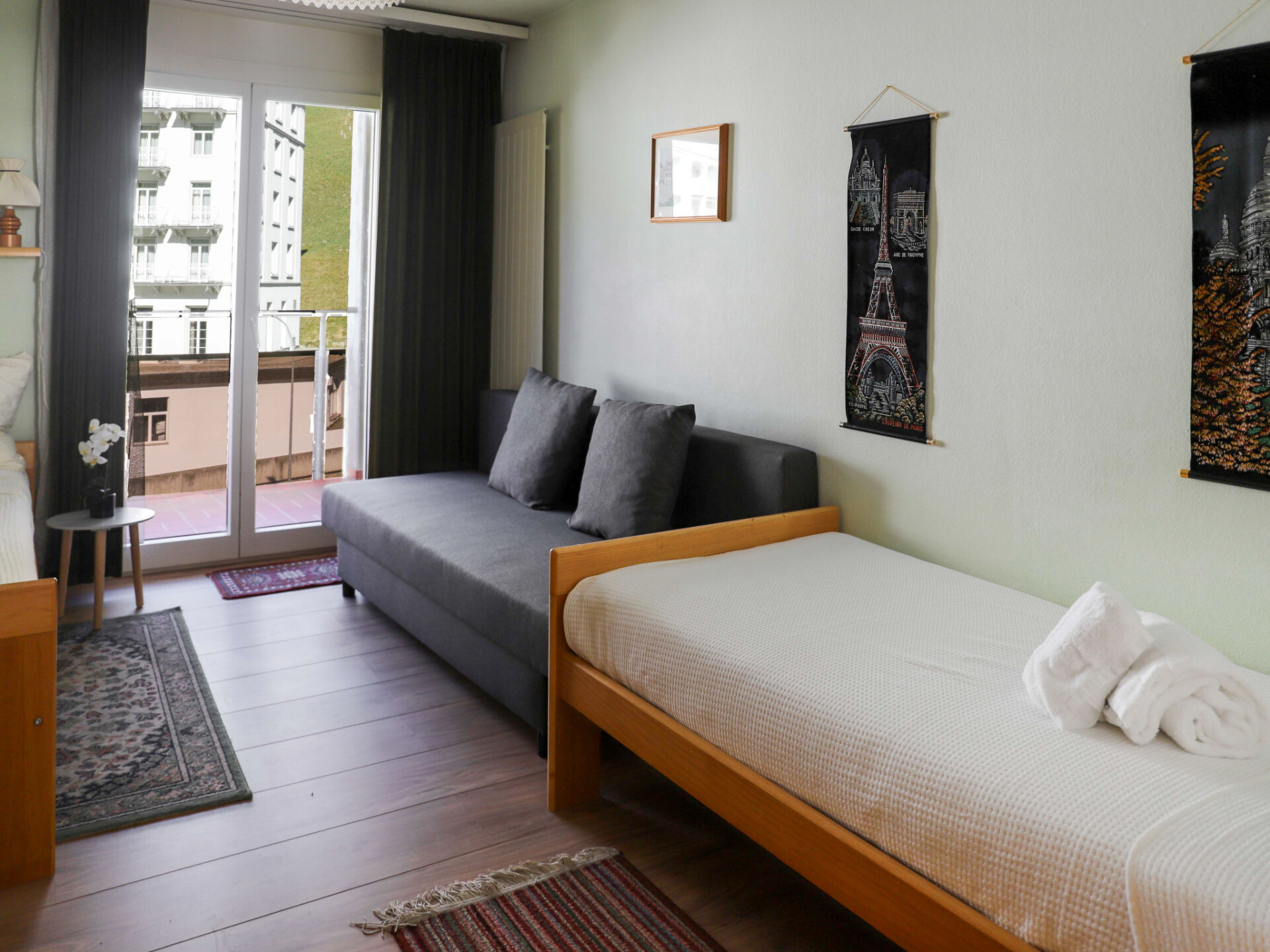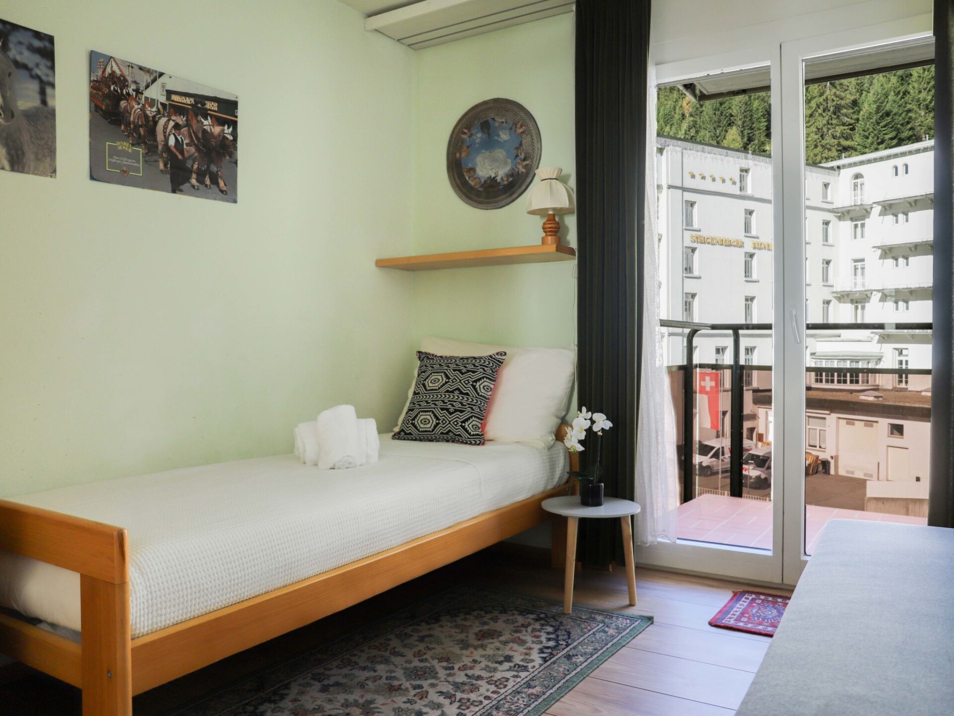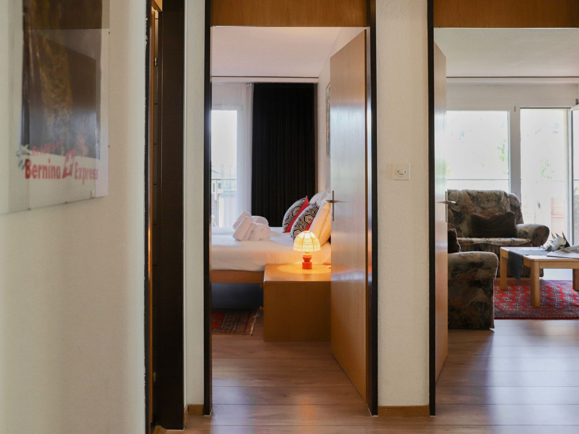 "Allod Park Haus C 605", appartement 3-kamers 80 m2 op de 6e verdieping, op het zuidwesten gelegen. Ruim, gedeeltelijk gerenoveerd in 2018, comfortabel en gezellig ingericht: woon-/eetkamer met Kabel-TV en Flatscreen TV. Uitgang naar het balkon, op het zuiden. 1 kamer met 1 2-pers bed (2 x 90 cm). Uitgang naar het balkon, op het zuiden. 1 kamer met 2 bedden en 1 uitschuifbaar bed. Uitgang naar het balkon, op het westen. Keuken (oven, afwasmachine, 4 keramische glas kookplaten, magnetron, elektrische koffiemachine, pads voor de koffiemachine (Filterkaffee)). Douche/WC. Groot balkon, op het zuiden gelegen, klein balkon, op het westen gelegen. Zeer mooi uitzicht op de bergen en de plaats. Ter beschikking: telefoon. Internet (WiFi, gratis). Parkeerplaats (extra) bij het huis. Niet rokers woning. 12347