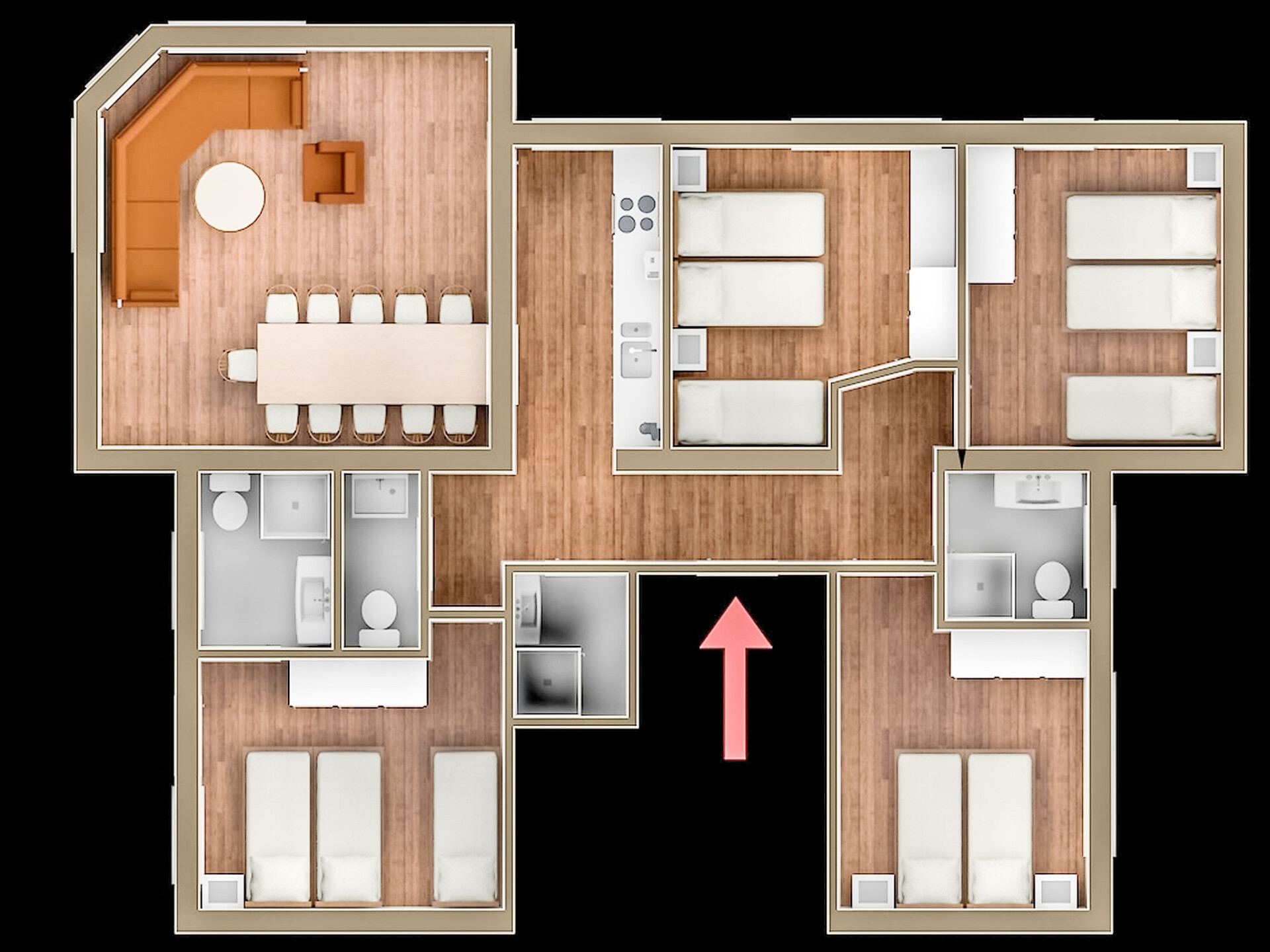 Appartement 5-kamers 117 m2 op de 2e verdieping. Ruim, smaakvol ingericht: 1 2-pers. kamer met Kabel-TV (Flatscreen TV). 3 kamers, elke kamer heeft 1 bed, 1 2-pers bed en Kabel-TV (Flatscreen TV). Woon-/eetkamer met Sat-TV (Flatscreen TV). Open keuken (oven, afwasmachine, 4 keramische glas kookplaten, magnetron, elektrische koffiemachine). 3 douche/WC's, aparte WC, dubbele wastafels. Comfortabele inrichting in landelijke stijl. 2 balkons. Mooi panoramazicht op de bergen en het dal. Ter beschikking: telefoon, kluis, haardroger. Internet (Internet (WiFi), gratis). Parkeerplaats (3 Auto's). Niet rokers woning. Rookmelders. Boxspringbedden kunnen gebruikt worden als een tweepersoonsbed of twee eenpersoonsbedden. Als er minder dan het maximale aantal gasten in de accommodatie verblijft, zijn niet alle wooneenheden beschikbaar voor gebruik.