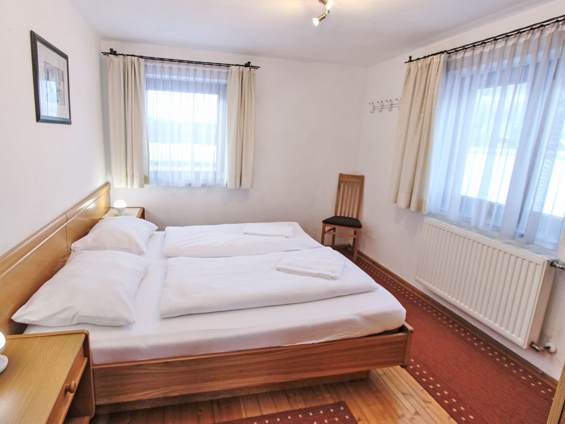 "Aparthaus Bruck", huis 6-kamers 180 m2. Gezellig ingericht: hal. Eetkamer met eethoek en Sat-TV (Flatscreen TV). 1 2-pers. kamer. 1 kamer met 2 bedden (90 cm, lengte 200 cm). Groot keuken (oven, afwasmachine, 4 inductiekookplaten, broodrooster, waterkoker, magnetron, elektrische koffiemachine). Badkamer, aparte WC. Bovenverdieping: woonkamer met Sat-TV. 3 2-pers. kamers. Douche, aparte WC. 50602-000375-2026