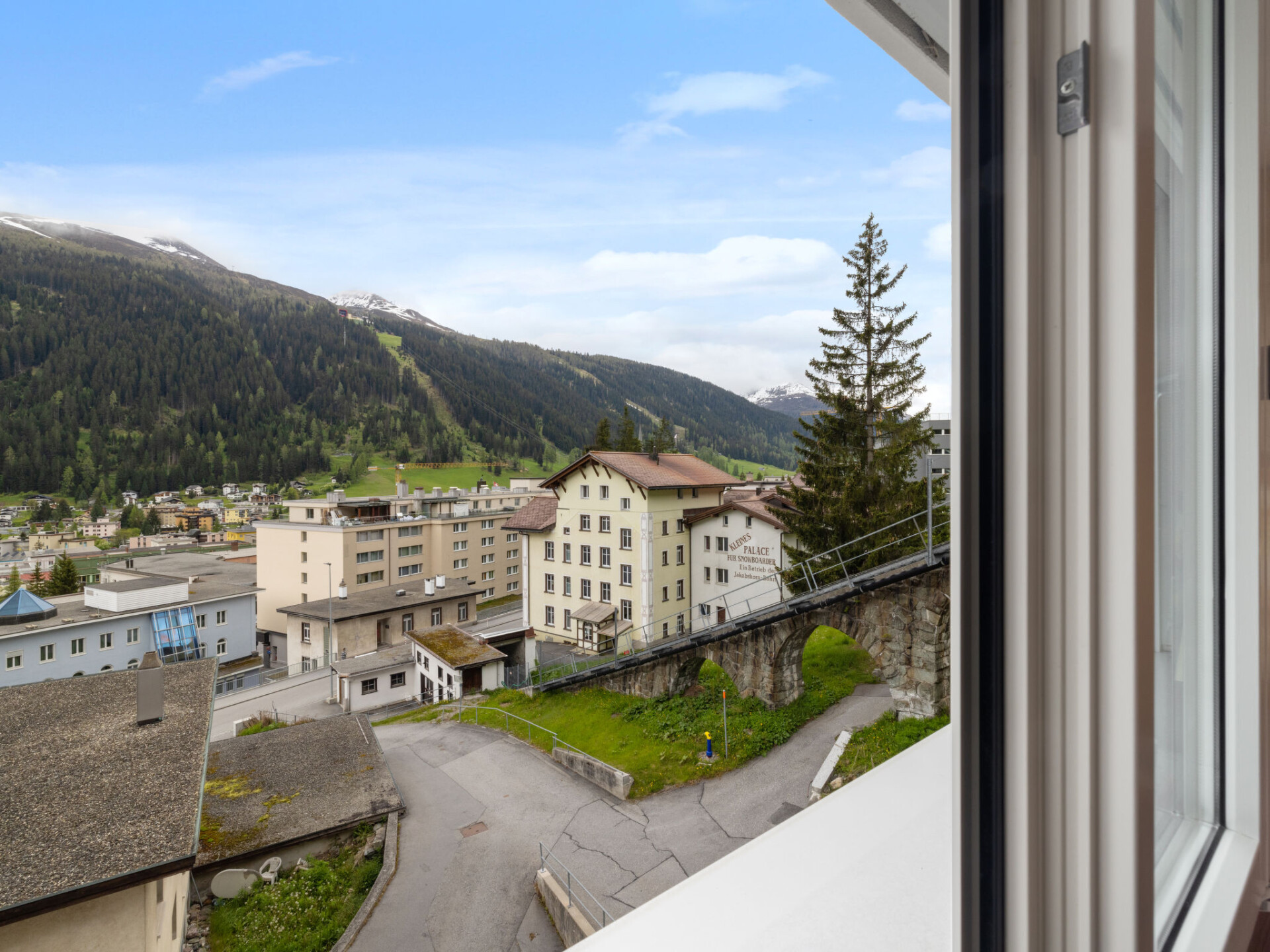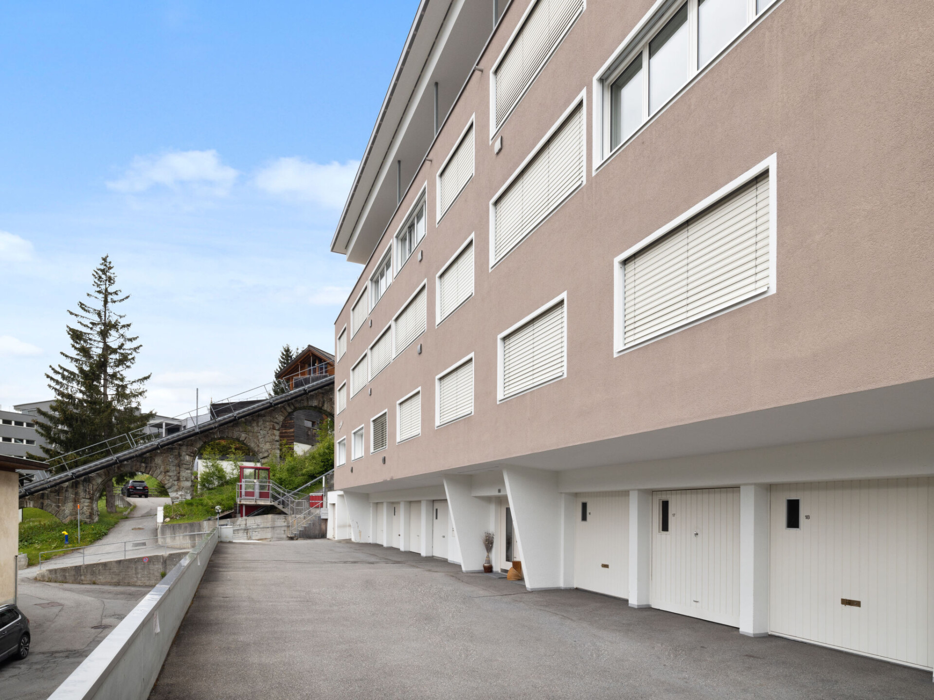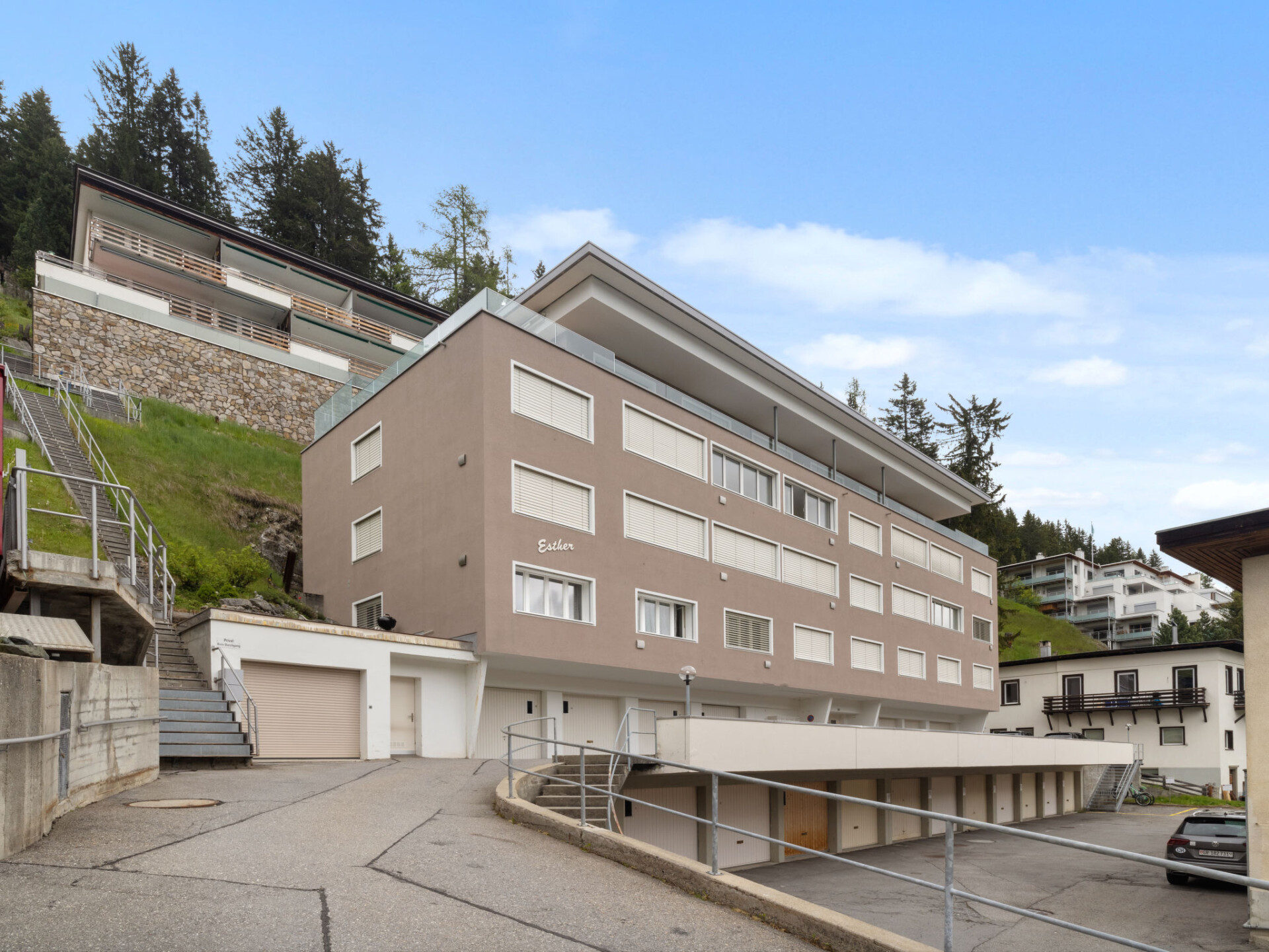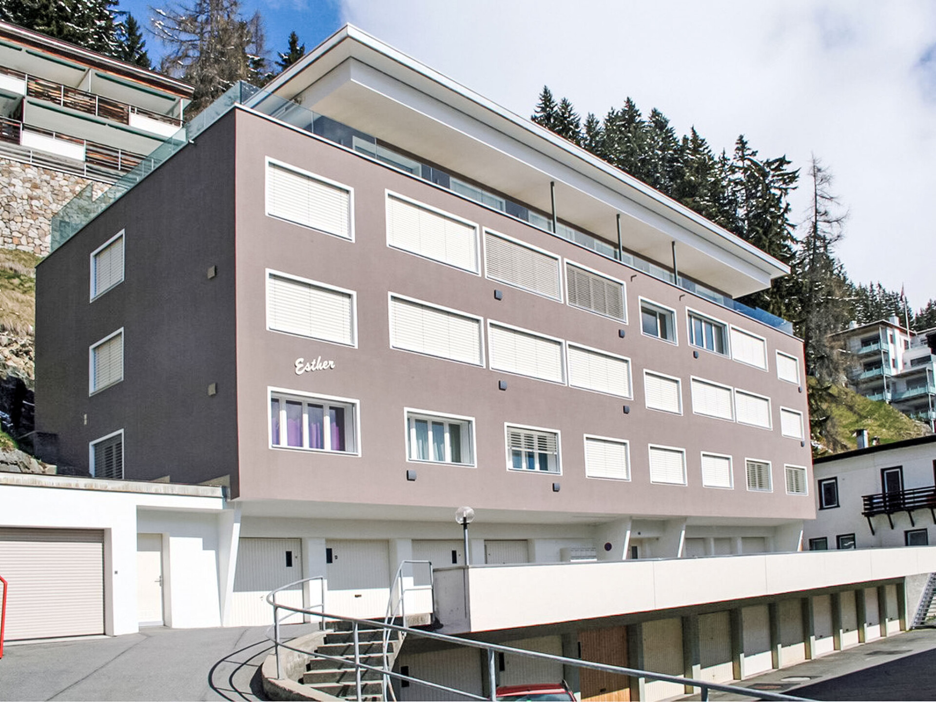 Flatgebouw "Esther". In het centrum, 250 m van het centrum van Davos Platz, centrale ligging tegen een helling, 20 m van het skigebied, op het zuiden. In het huis: lift, wasmachine, droger (voor medegebruik). 20 m lange steile toegangsweg tot aan het huis. Eigen garage nr. 6. Parkeerplaats of garage alleen voor een kleine/middelgrote auto. Afmetingen: hoogte 192 cm breedte 210 cm. Winkel 100 m, supermarkt 400 m, restaurant, bar, bakkerij 100 m, bushalte "Davos Schatzalpbahn" 200 m, meer Davoser See 2.5 km. Golfterrein (18 holes) 800 m, sportcentrum 400 m, kabelbaan 500 m, bergtrein 30 m, ski faciliteiten 15 m, skibushalte 50 m.