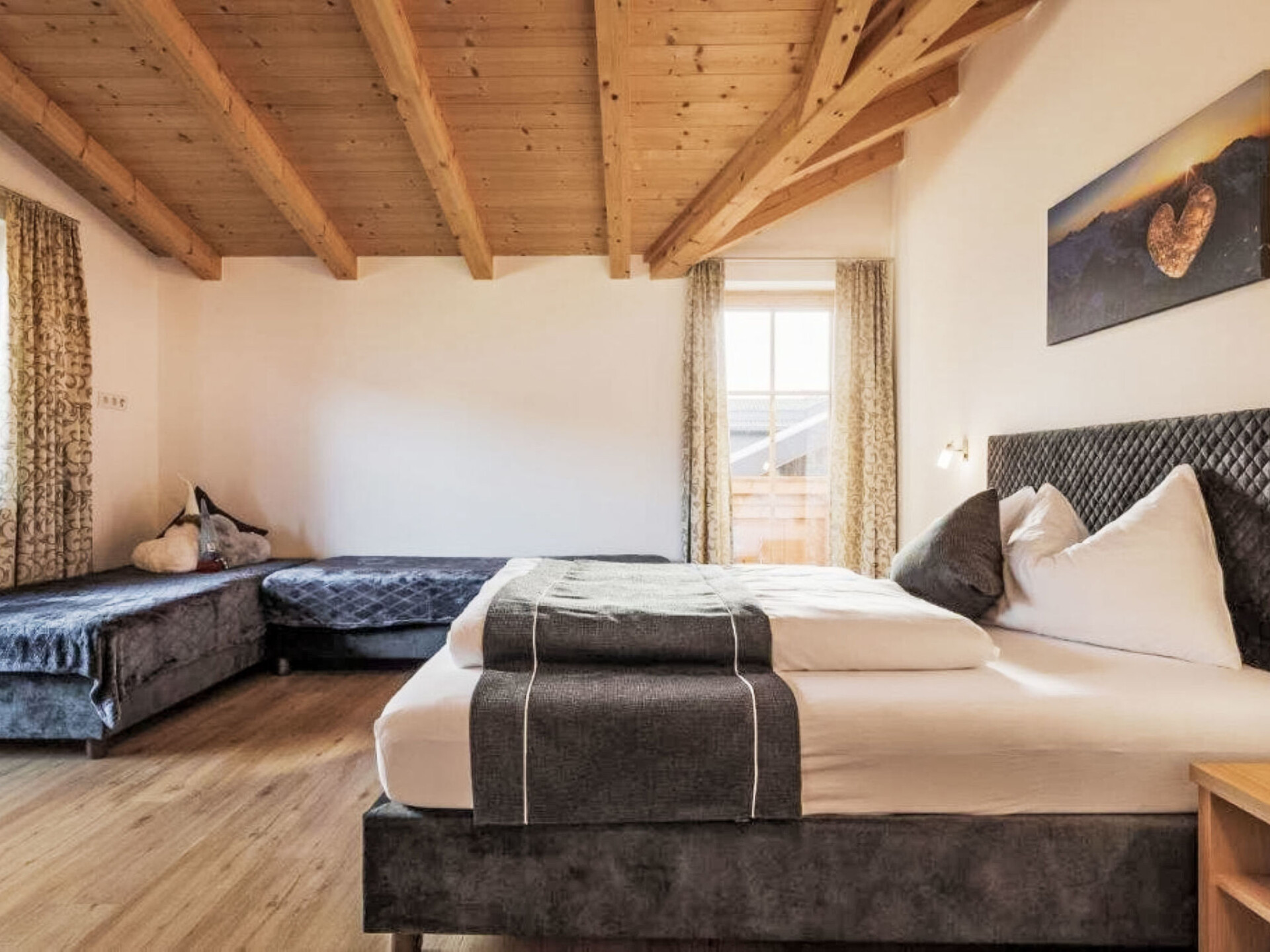 "Schau ins Tal", appartement 2-kamers 55 m2 op de 2e verdieping. Zeer mooi en gezellig ingericht: 1 kamer met 2 bedden en 1 2-pers bed. Woonkeuken (oven, afwasmachine, 4 keramische glas kookplaten, broodrooster, waterkoker, magnetron, elektrische koffiemachine) met TV (Flatscreen TV). Douche/WC. Vloerverwarming. Balkon. Balkonmeubilair. Mooi panoramazicht op de bergen. Ter beschikking: Internet (WiFi, gratis). Maximaal 1 huisdier/hond toegestaan.