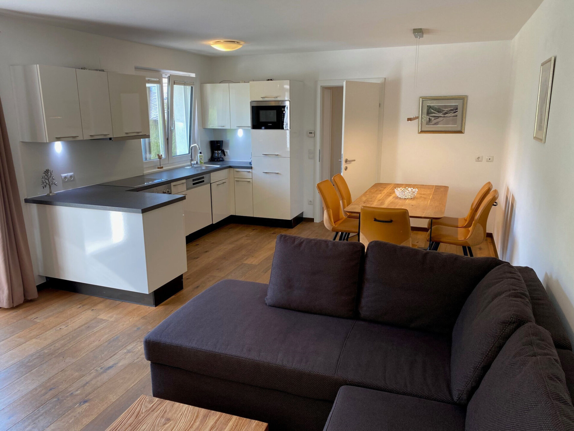 "4_Zell - FöhrenNest Zell am See", appartement 3-kamers 68 m2, op de begane grond. Het objekt is geschikt voor 6 volwassenen. Woonkamer met 1 divanbed, 1 uitschuifbaar bed en TV. 1 kamer met 1 2-pers bed en TV. 1 kamer met 2 bedden en TV. Open keuken (oven, afwasmachine, 4 keramische glas kookplaten, broodrooster, waterkoker, magnetron, diepvriezer, elektrische koffiemachine). Douche/WC. Terras 30 m2. Uitzicht op de bergen. Ter beschikking: wasmachine, strijkijzer, haardroger. Internet (WiFi, gratis). Parkeerplaats (2 Auto's). Niet rokers woning. 2 huisdieren/honden toegestaan.