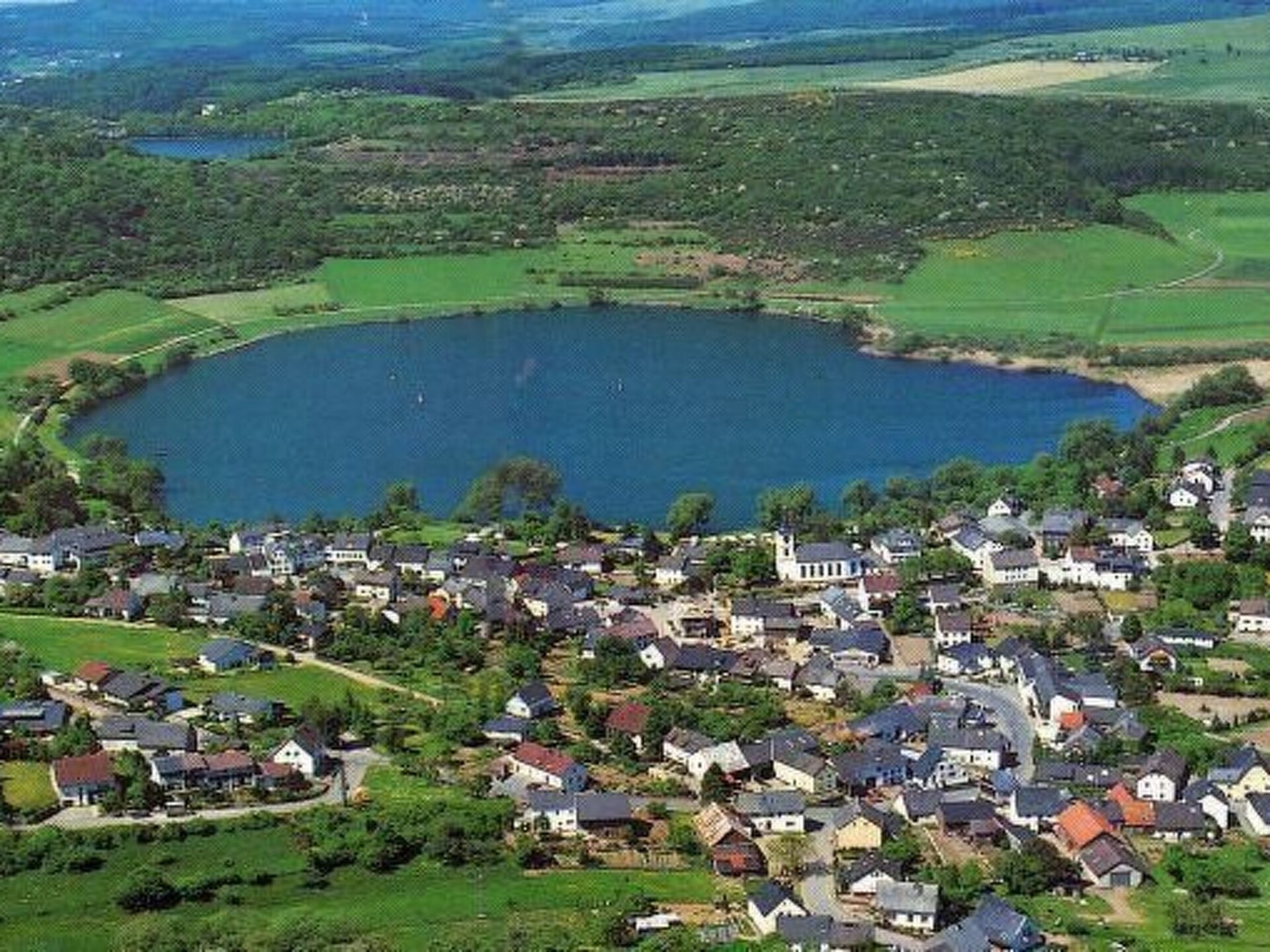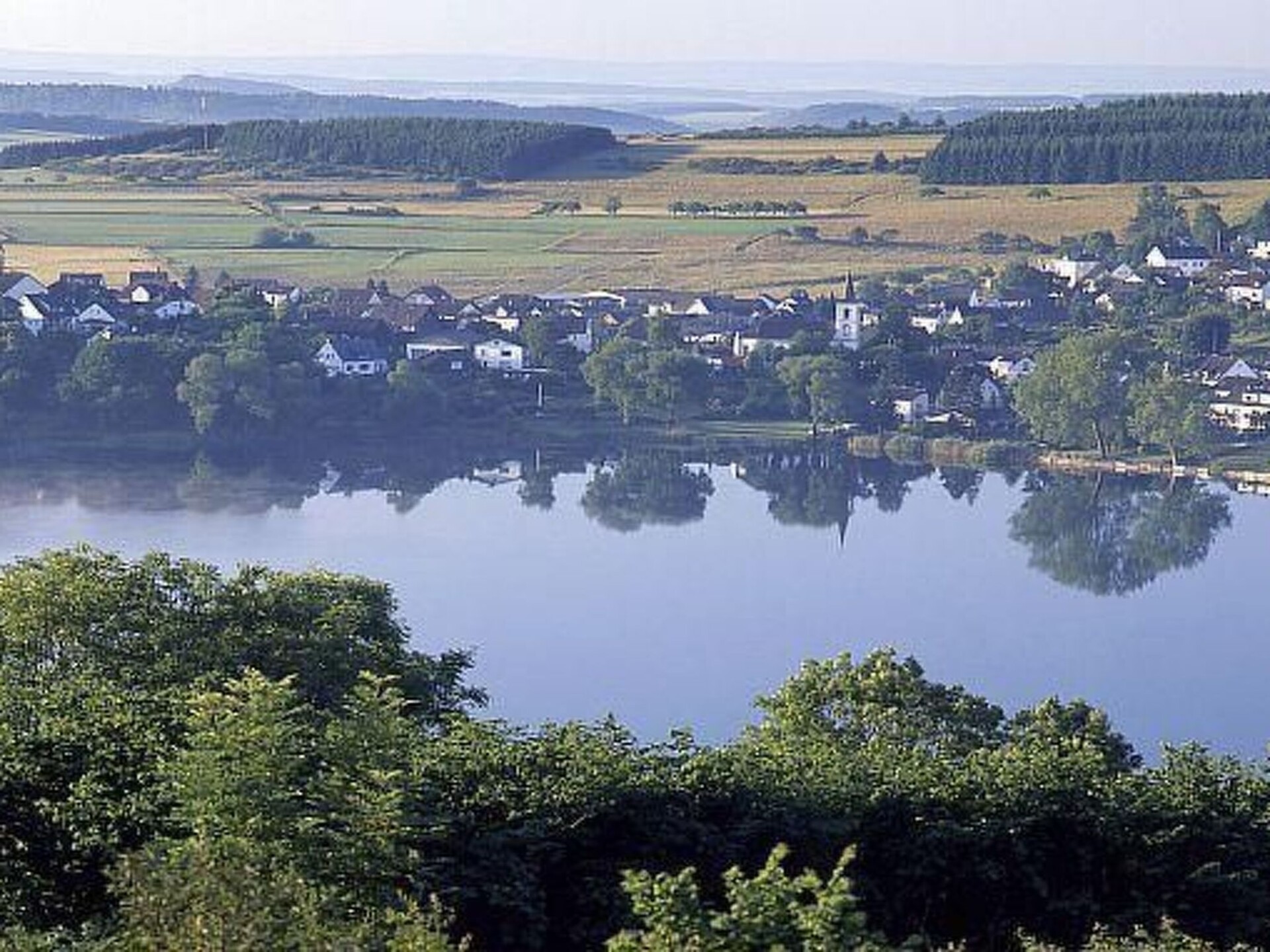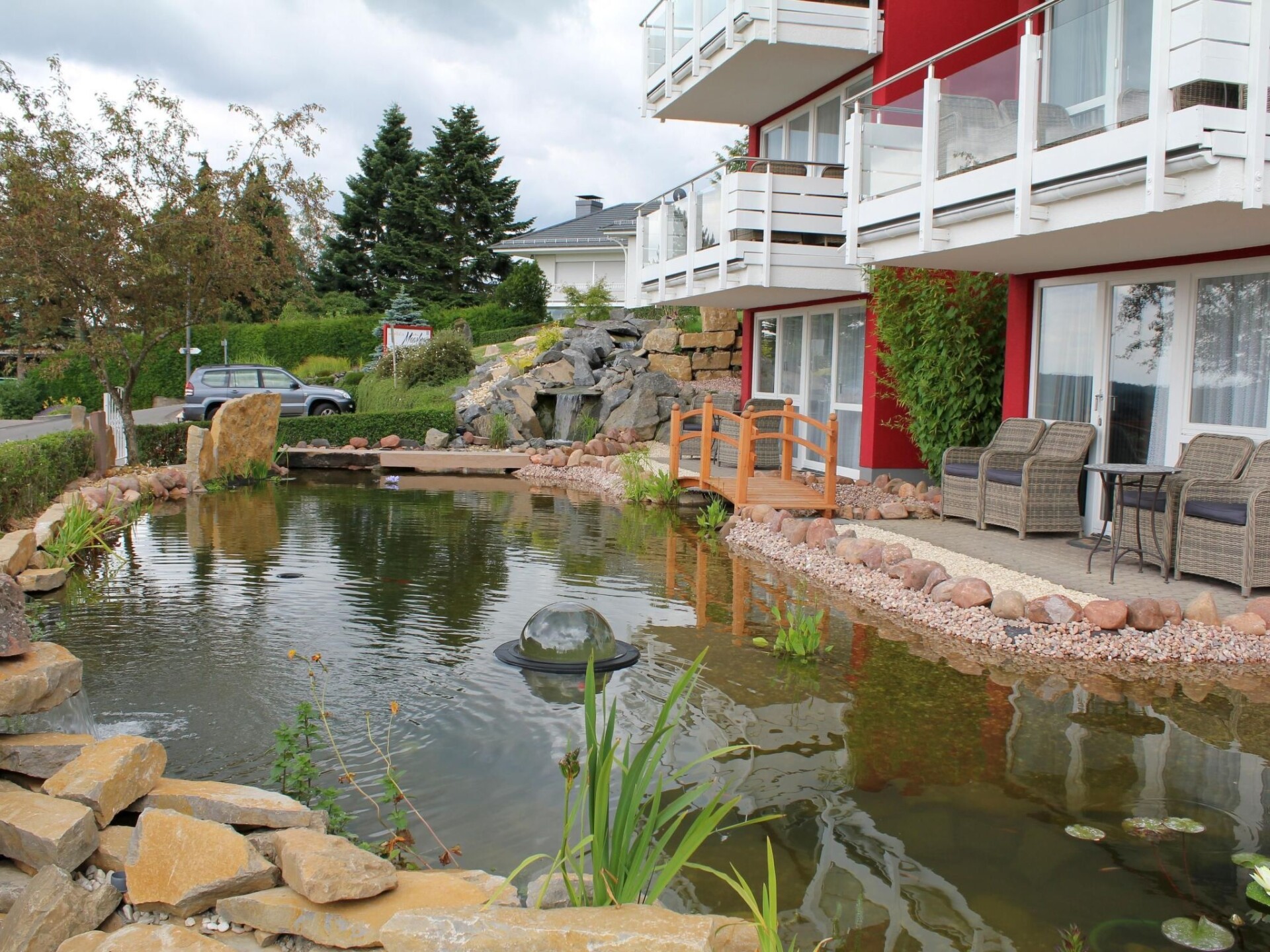 Maximaal 3 huisdieren/honden toegestaan. The house with the holiday apartment is beautifully situated on the outskirts of Schalkenmehren am See. It is a quiet location on a slope and bordering a forest. It is only about 400 metres to the lake and the town centre.The elegant, completely newly furnished holiday apartment for two to six people, with about 54m² of living space, has a balcony facing the lake and the decorative pond. The Maarhöhe apartment is on the upper floor, up stairs, and affords a beautiful view of the lake, the lovely landscape and a well-maintained decorative pond. The living room provides a new sofa suite that can be converted into a bed and a big 127cm HD/3D TV of the new generation. You can choose between about 3000 different TV and radio channels in many languages from four different satellites. There are alsoa 3D BluRay player and a DVD player, a stereo system with a radio, CD player etc. Wireless Internet access is available. The light and inviting apartment has a natural flair with plenty of wood and stone. The electric fireplace and the elegant ceiling fan ensure a pleasant atmosphere, even on cold or wet days. It is non-smoking apartment. Smokers can use the balcony or the outdoor area. The new built-in kitchen is equipped with a four-ring ceramic hob and oven, a dishwasher, a fridge with a freezer compartment, a microwave, two coffee machines (filter and pads, Bosch-Tassimo), a toaster, a kettle, pots and pans, crockery and cutlery for the maximum number of people. A junior bed and a highchair can be provided free of charge. The dining corner is suitable for four people. The apartment has two separate bedrooms with quality box spring beds (180 x 200cm and 140 x 200cm), so you can get a good night’s sleep. The second bedroom has a French double bed 140cm wide. The larger bedroom looks out towards the lake. Both bedrooms have a full-length mirror. The living room has a new double sofa bed. The light bathroom is fitted with a whirlpool, so you can treat yourself. The bathroom also has satellite TV with a DVD player, a radio and USB port. There is a shower integrated into the whirlpool, along with LEDs and massage jets. Special bath salts for the whirlpool are available free of charge. The LEDs on the floor throughout the bathroom, with blue light, provide a great atmosphere. There is a big, illuminated LED mirror and there are scales and a modern towel radiator. Large sliding windows towards the lake and landscape to the balcony await you. The apartment has central heating and of course its own separate entrance.The apartment features a beautiful balcony with lounge chairs, hammock chair with a view towards the lake and a cocktail and coffee table. If you would like to dine on the balcony, you can use the folding table as a dining table, which you can set up anywhere. There is a wonderful and elaborately laid out decorative pond with Koi carp and other fish, two waterfalls and a stream. You can sit and enjoy a coffee or cocktail on the balcony or on the terrace and watch the fish, or look out into the valley and towards the lake. Outside there is ample parking space and there is space for storing bicycles. There is a grill area with a view of the lake behind the house.In the house: lobby with reception, seating and games (are ready for use). Sauna (free of charge) and solarium can be found in the basement of the "Maarberg Resort". You can also use the newly designed sauna alone (lockable). A new jacuzzi for two people can also be used free of charge. There is also a room in the basement with a washing machine, dryer, iron and ironing board. In addition to hiking maps and picture postcards, the reception hall also provides free information material on the many excursion destinations and leisure opportunities in the region. In addition, there is a drinks refrigerator in the lobby with drinks to be taken away on a trust basis.There are good restaurants, cafés and a shop locally. In the town of Daun five kilometres away there are many other shops and supermarkets.