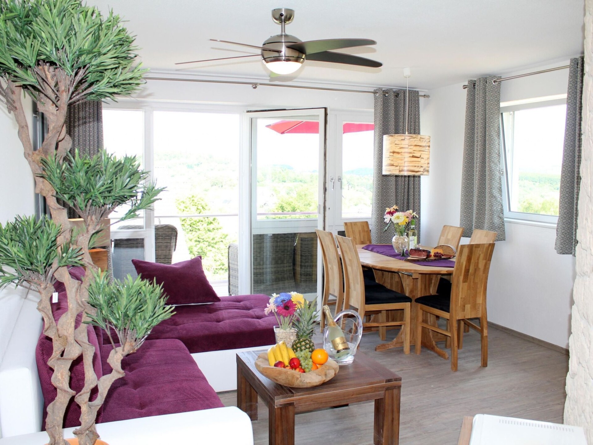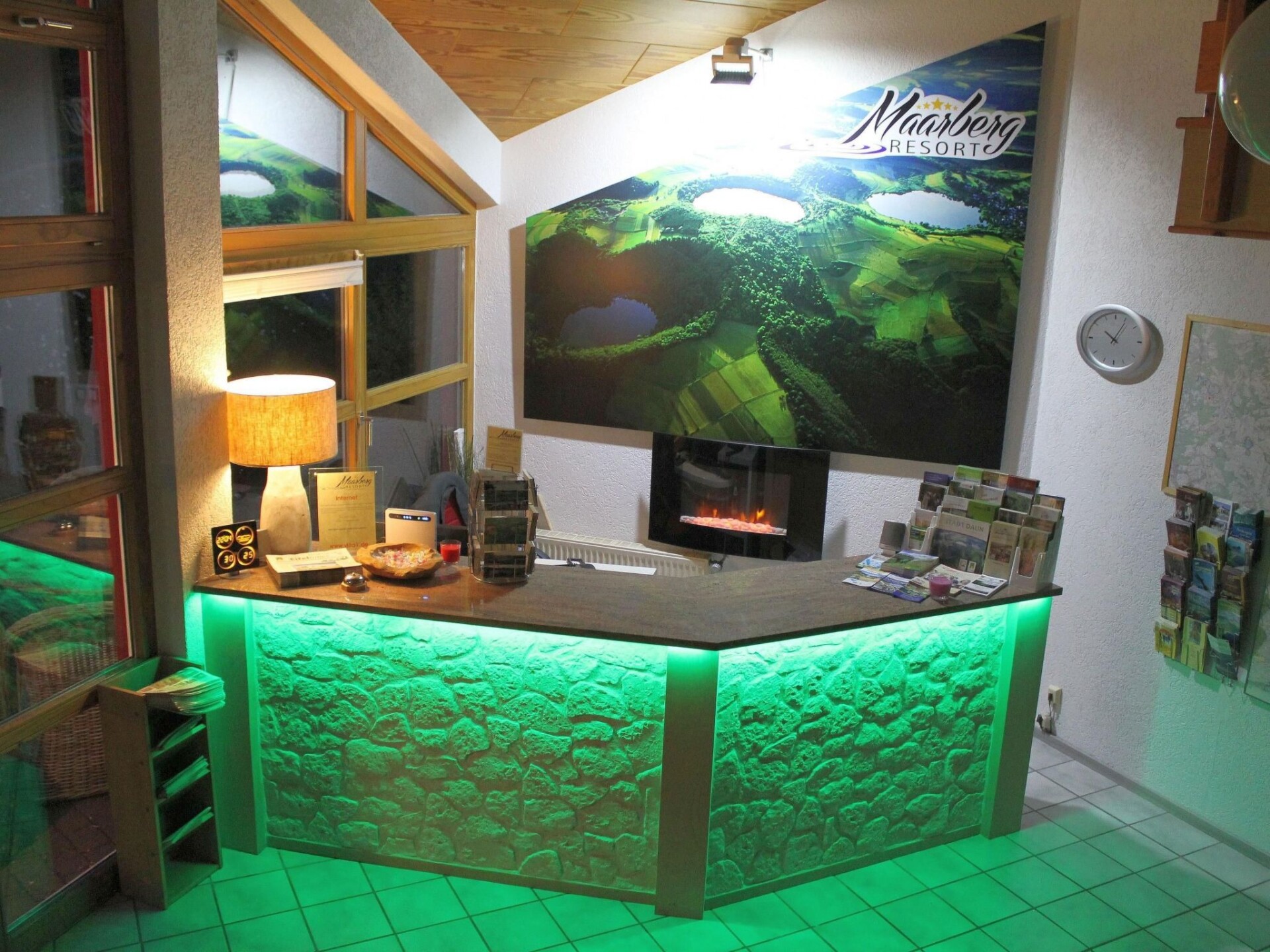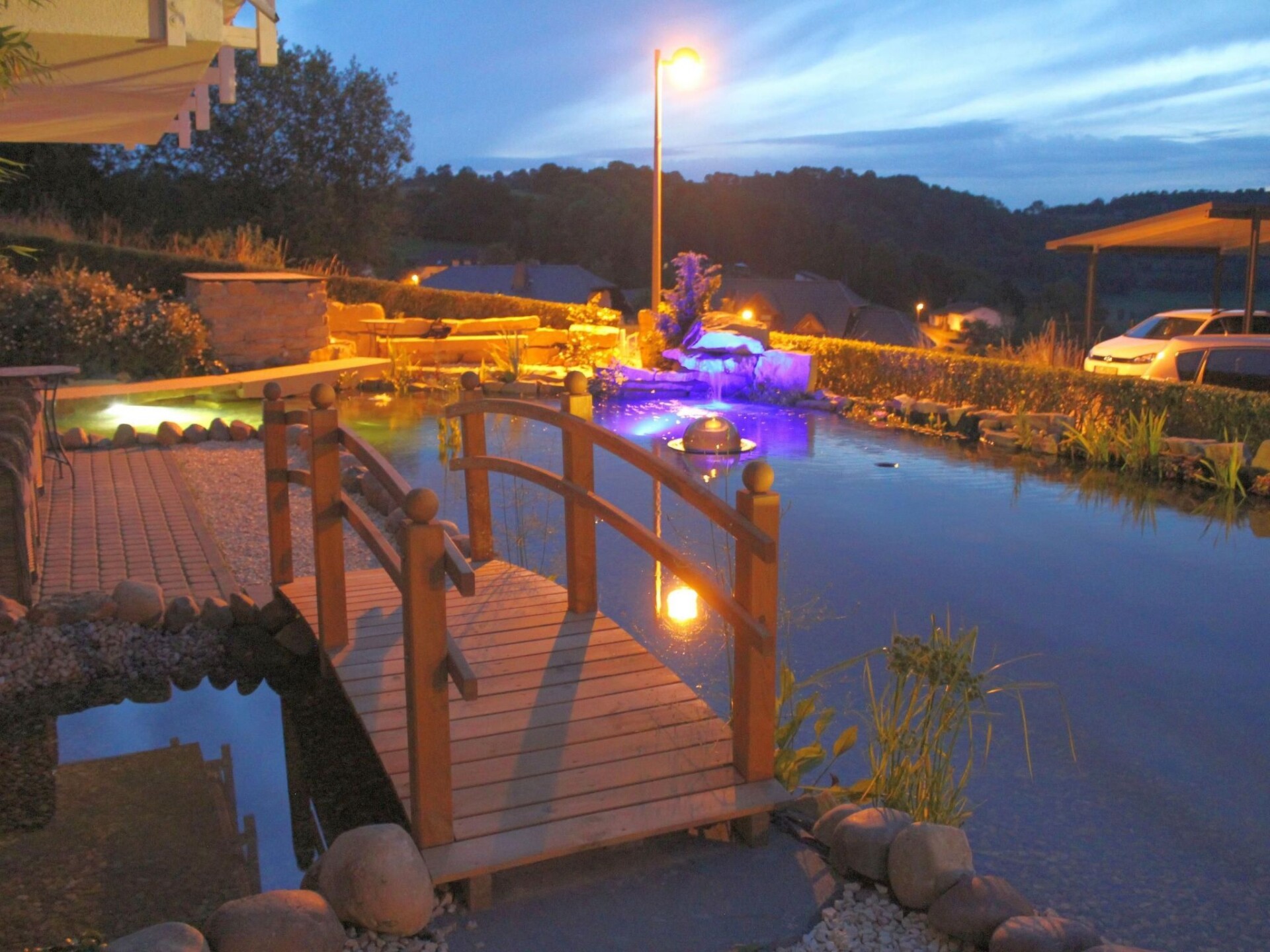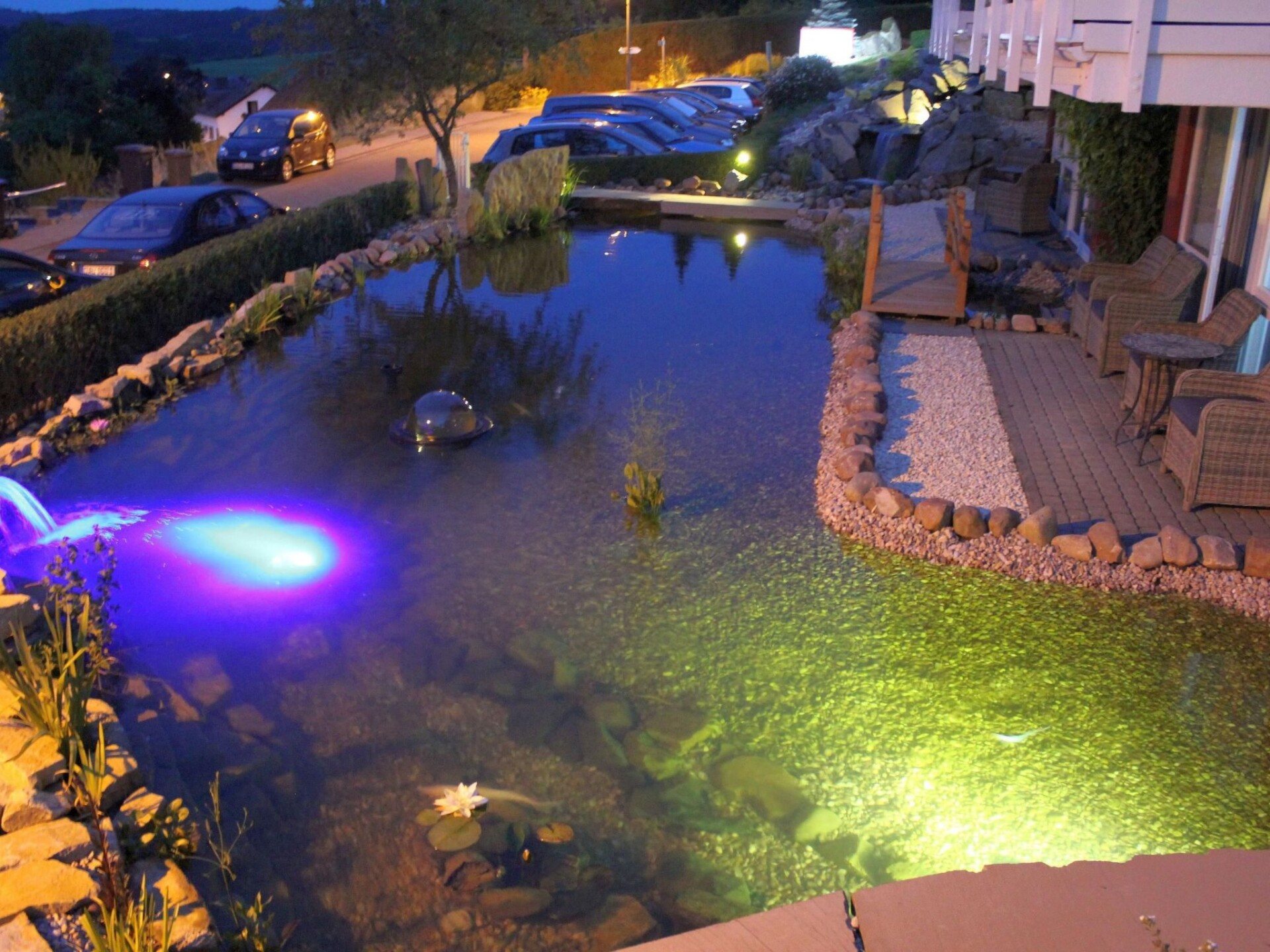 Maximaal 3 huisdieren/honden toegestaan. The house with the holiday apartment is beautifully situated on the outskirts of Schalkenmehren am See. It is a quiet location on a slope and bordering a forest. It is only about 400 metres to the lake and the town centre.The elegant, completely newly furnished holiday apartment for two to six people, with about 54m² of living space, has a balcony facing the lake and the decorative pond. The Maarhöhe apartment is on the upper floor, up stairs, and affords a beautiful view of the lake, the lovely landscape and a well-maintained decorative pond. The living room provides a new sofa suite that can be converted into a bed and a big 127cm HD/3D TV of the new generation. You can choose between about 3000 different TV and radio channels in many languages from four different satellites. There are alsoa 3D BluRay player and a DVD player, a stereo system with a radio, CD player etc. Wireless Internet access is available. The light and inviting apartment has a natural flair with plenty of wood and stone. The electric fireplace and the elegant ceiling fan ensure a pleasant atmosphere, even on cold or wet days. It is non-smoking apartment. Smokers can use the balcony or the outdoor area. The new built-in kitchen is equipped with a four-ring ceramic hob and oven, a dishwasher, a fridge with a freezer compartment, a microwave, two coffee machines (filter and pads, Bosch-Tassimo), a toaster, a kettle, pots and pans, crockery and cutlery for the maximum number of people. A junior bed and a highchair can be provided free of charge. The dining corner is suitable for four people. The apartment has two separate bedrooms with quality box spring beds (180 x 200cm and 140 x 200cm), so you can get a good night’s sleep. The second bedroom has a French double bed 140cm wide. The larger bedroom looks out towards the lake. Both bedrooms have a full-length mirror. The living room has a new double sofa bed. The light bathroom is fitted with a whirlpool, so you can treat yourself. The bathroom also has satellite TV with a DVD player, a radio and USB port. There is a shower integrated into the whirlpool, along with LEDs and massage jets. Special bath salts for the whirlpool are available free of charge. The LEDs on the floor throughout the bathroom, with blue light, provide a great atmosphere. There is a big, illuminated LED mirror and there are scales and a modern towel radiator. Large sliding windows towards the lake and landscape to the balcony await you. The apartment has central heating and of course its own separate entrance.The apartment features a beautiful balcony with lounge chairs, hammock chair with a view towards the lake and a cocktail and coffee table. If you would like to dine on the balcony, you can use the folding table as a dining table, which you can set up anywhere. There is a wonderful and elaborately laid out decorative pond with Koi carp and other fish, two waterfalls and a stream. You can sit and enjoy a coffee or cocktail on the balcony or on the terrace and watch the fish, or look out into the valley and towards the lake. Outside there is ample parking space and there is space for storing bicycles. There is a grill area with a view of the lake behind the house.In the house: lobby with reception, seating and games (are ready for use). Sauna (free of charge) and solarium can be found in the basement of the "Maarberg Resort". You can also use the newly designed sauna alone (lockable). A new jacuzzi for two people can also be used free of charge. There is also a room in the basement with a washing machine, dryer, iron and ironing board. In addition to hiking maps and picture postcards, the reception hall also provides free information material on the many excursion destinations and leisure opportunities in the region. In addition, there is a drinks refrigerator in the lobby with drinks to be taken away on a trust basis.There are good restaurants, cafés and a shop locally. In the town of Daun five kilometres away there are many other shops and supermarkets.