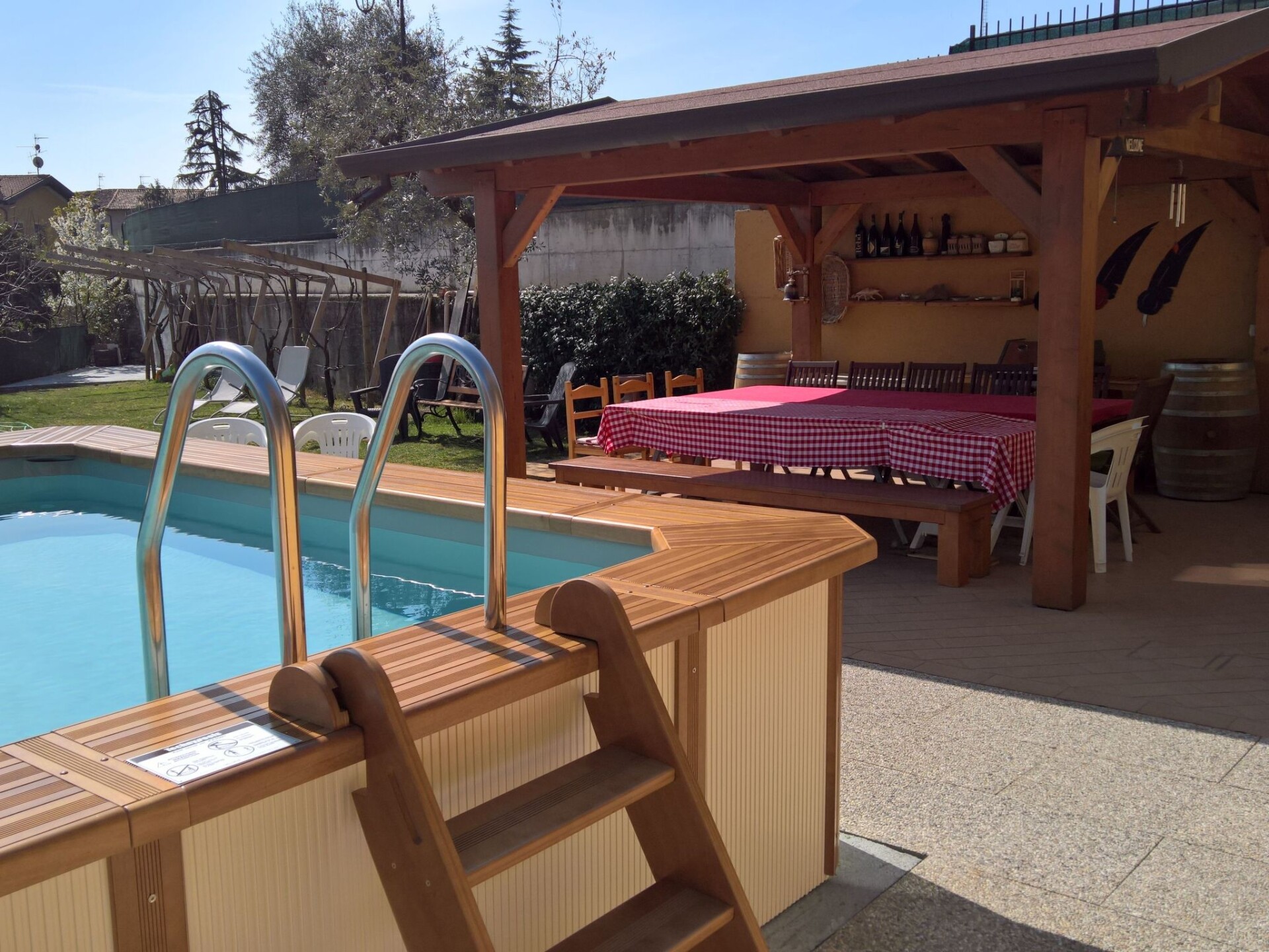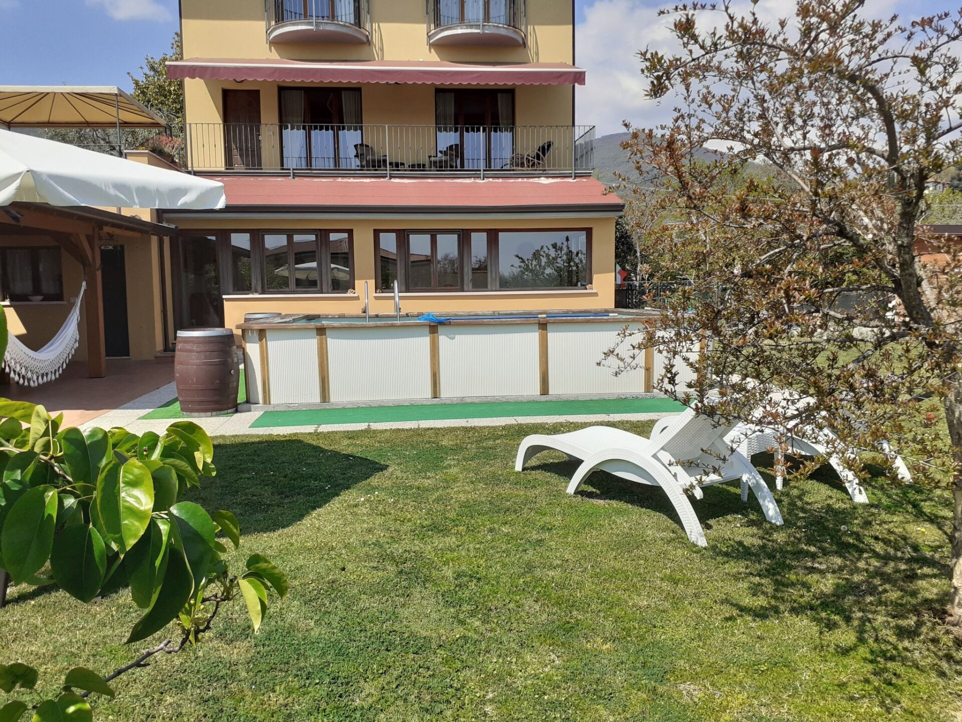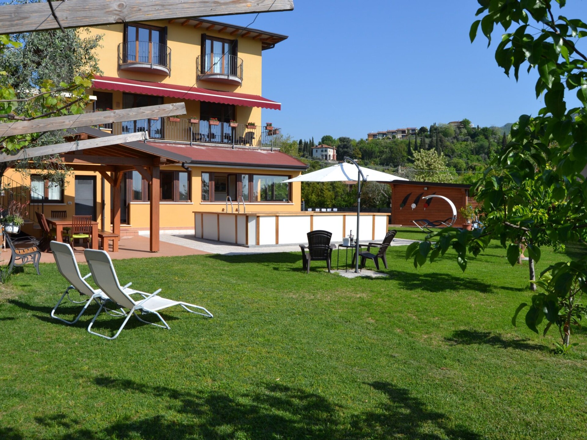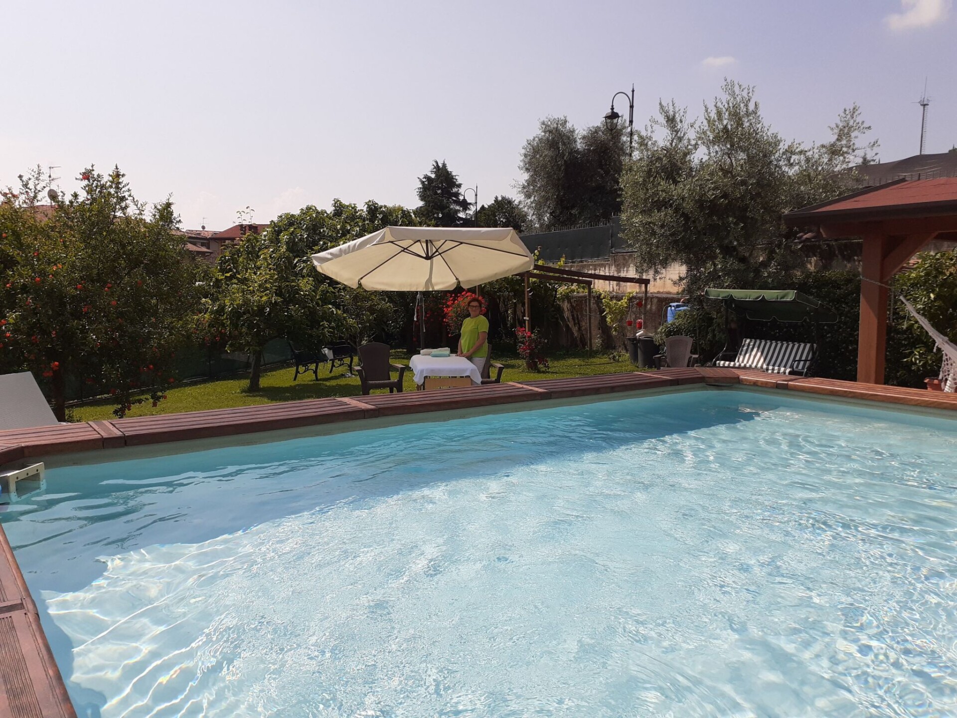 Villa La Veranda - holiday flat in Salò - Lake Garda Villa La Veranda is located in the panoramic area of Salò; it has two floors with a large garden with lawn and fruit trees. Your holiday flat is situated on the ground floor and covers an area of more than 120 square metres, with a large veranda. Outside there is a large garden of 600 square metres, a large swimming pool, a porch with a large 3-metre table and a gas BBQ and a private parking space.Outside you can enjoy a large swimming pool, a large garden of approx. 600 square metres, entirely lawned and a dozen or so fruit trees, including cherries, peaches, pears, apples and plums. A large tiled and covered 4x4 m porch is at your disposal with a large 4 m table with benches and chairs for more than 12 persons. A modern gas BBQ is at the flat's disposal. A large laundry room, which includes a sink and washing machine, can be used on request.SANITIZATION with OZONE (MD5 Motor Data). The flat covers an area of more than 120 square metres and includes: a large swimming pool, a large living veranda, a 20 square metre kitchen, a double bedroom with a large bed, a bathroom with shower, a large children's room of almost 30 square metres with three single beds and the possibility of adding a fourth extra bed. It also has a cot for small children that can be accommodated in the double bedroom and in the second bedroom. The flat is entirely on the ground floor, with no architectural barriers, only one step to the entrance and has underfloor heating throughout. The large kitchen is equipped with a refrigerator and freezer, a gas cooker and an electric oven, as well as a microwave oven and a water boiler. it includes everything you need for cooking and dining, such as plates, glasses, cutlery, crockery, pots, pans, cups and tablecloths. it has a large table with chairs for 8 people and antique furniture-credentials. Bed linen and towels are provided in the flat. In the large veranda of approx. 40 square metres there are sofas for 10 persons, a table with rustic bench where 8 persons can sit and eat comfortably, a large 42" flat screen HD television complete with satellite decoder to pick up TV from various satellites including Astra and Hotbird. Internet is available free of charge with ADSL Wi-Fi throughout the area.In the immediate vicinity you can find the sports area, with football, five-a-side football and tennis courts, and a large public indoor and outdoor swimming pool, open all year round. The public beach at the lake is only 800 metres away and can be used without payment. A large golf course is available in the surrounding area for golf enthusiasts, as well as numerous other beaches and tourist facilities. From the house there is easy access to a promenade of over 4 km on foot, which encircles the entire panorama route, and another, at the edge of the lake, of over 2 km.La Veranda is approx. 30 m from the main road, away from the hustle and bustle of traffic and the access road continues traffic-free through the village of Campoverde, to the centre of Salò, with no traffic problems and entirely walkable without the hassle of having to cross car traffic roads and easily reach the lake and the nearby sports centre. IT017170C277A97JEL