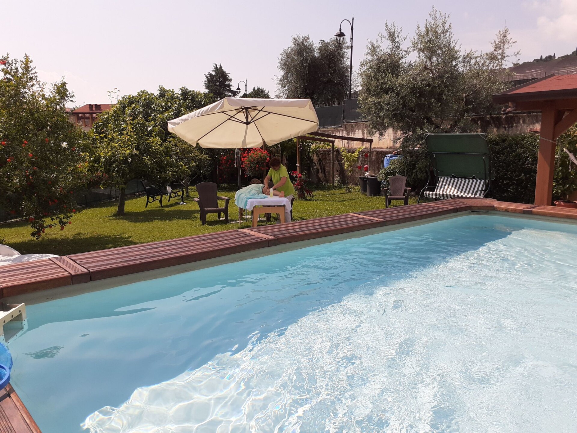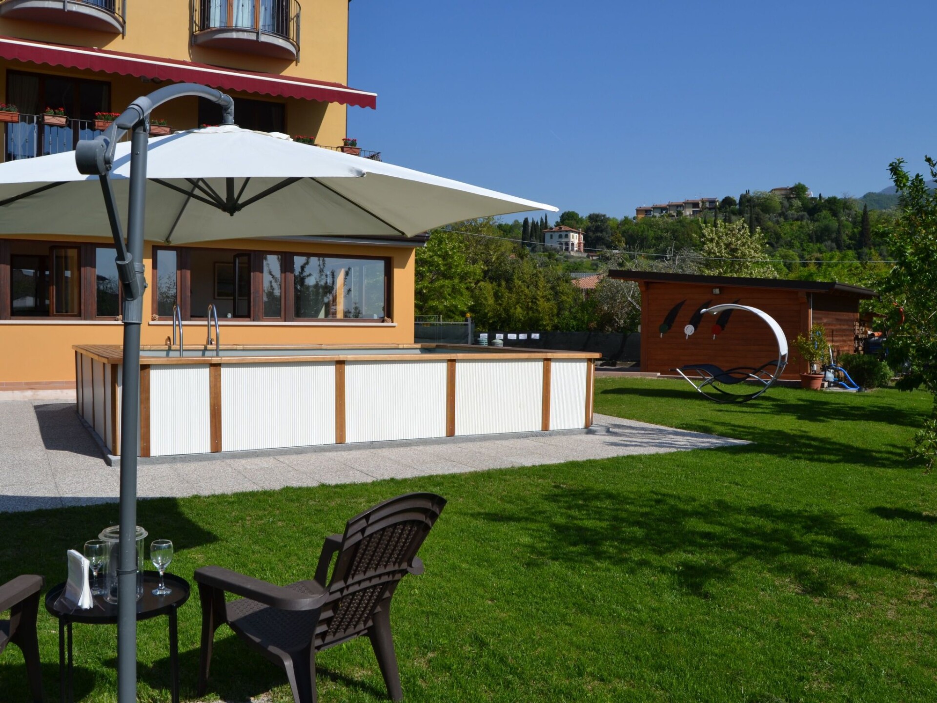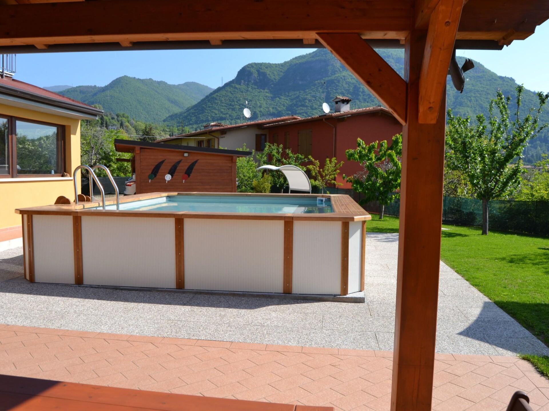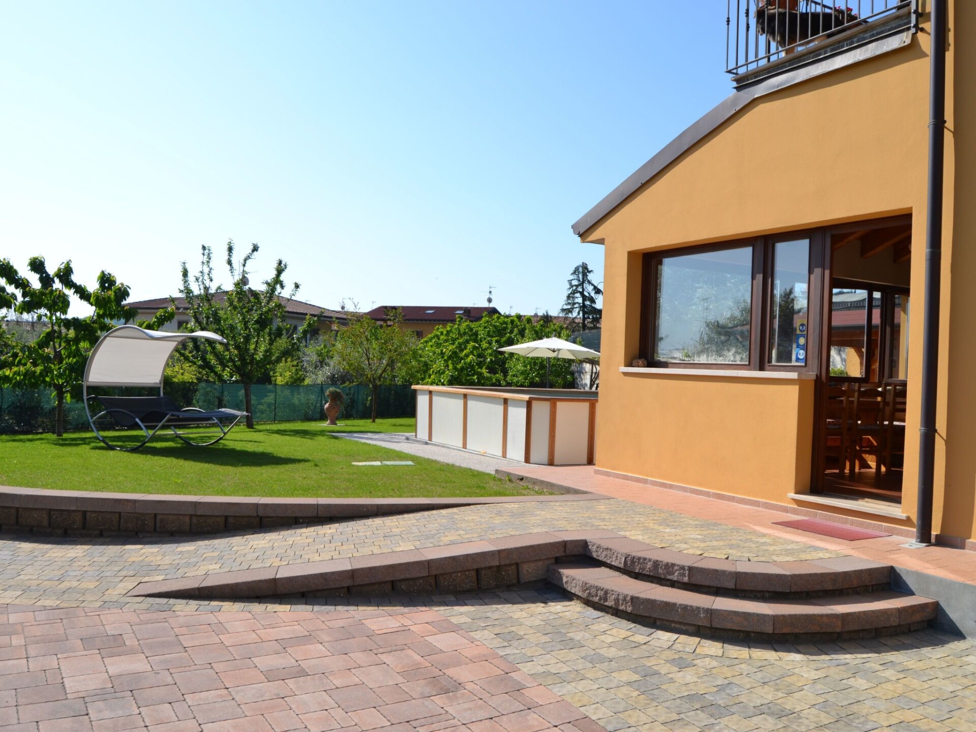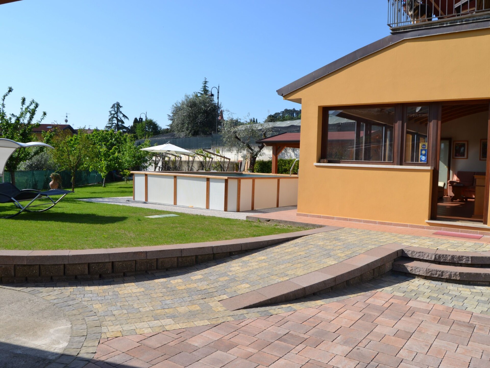 Villa La Veranda - holiday flat in Salò - Lake Garda Villa La Veranda is located in the panoramic area of Salò; it has two floors with a large garden with lawn and fruit trees. Your holiday flat is situated on the ground floor and covers an area of more than 120 square metres, with a large veranda. Outside there is a large garden of 600 square metres, a large swimming pool, a porch with a large 3-metre table and a gas BBQ and a private parking space.Outside you can enjoy a large swimming pool, a large garden of approx. 600 square metres, entirely lawned and a dozen or so fruit trees, including cherries, peaches, pears, apples and plums. A large tiled and covered 4x4 m porch is at your disposal with a large 4 m table with benches and chairs for more than 12 persons. A modern gas BBQ is at the flat's disposal. A large laundry room, which includes a sink and washing machine, can be used on request.SANITIZATION with OZONE (MD5 Motor Data). The flat covers an area of more than 120 square metres and includes: a large swimming pool, a large living veranda, a 20 square metre kitchen, a double bedroom with a large bed, a bathroom with shower, a large children's room of almost 30 square metres with three single beds and the possibility of adding a fourth extra bed. It also has a cot for small children that can be accommodated in the double bedroom and in the second bedroom. The flat is entirely on the ground floor, with no architectural barriers, only one step to the entrance and has underfloor heating throughout. The large kitchen is equipped with a refrigerator and freezer, a gas cooker and an electric oven, as well as a microwave oven and a water boiler. it includes everything you need for cooking and dining, such as plates, glasses, cutlery, crockery, pots, pans, cups and tablecloths. it has a large table with chairs for 8 people and antique furniture-credentials. Bed linen and towels are provided in the flat. In the large veranda of approx. 40 square metres there are sofas for 10 persons, a table with rustic bench where 8 persons can sit and eat comfortably, a large 42" flat screen HD television complete with satellite decoder to pick up TV from various satellites including Astra and Hotbird. Internet is available free of charge with ADSL Wi-Fi throughout the area.In the immediate vicinity you can find the sports area, with football, five-a-side football and tennis courts, and a large public indoor and outdoor swimming pool, open all year round. The public beach at the lake is only 800 metres away and can be used without payment. A large golf course is available in the surrounding area for golf enthusiasts, as well as numerous other beaches and tourist facilities. From the house there is easy access to a promenade of over 4 km on foot, which encircles the entire panorama route, and another, at the edge of the lake, of over 2 km.La Veranda is approx. 30 m from the main road, away from the hustle and bustle of traffic and the access road continues traffic-free through the village of Campoverde, to the centre of Salò, with no traffic problems and entirely walkable without the hassle of having to cross car traffic roads and easily reach the lake and the nearby sports centre. IT017170C277A97JEL