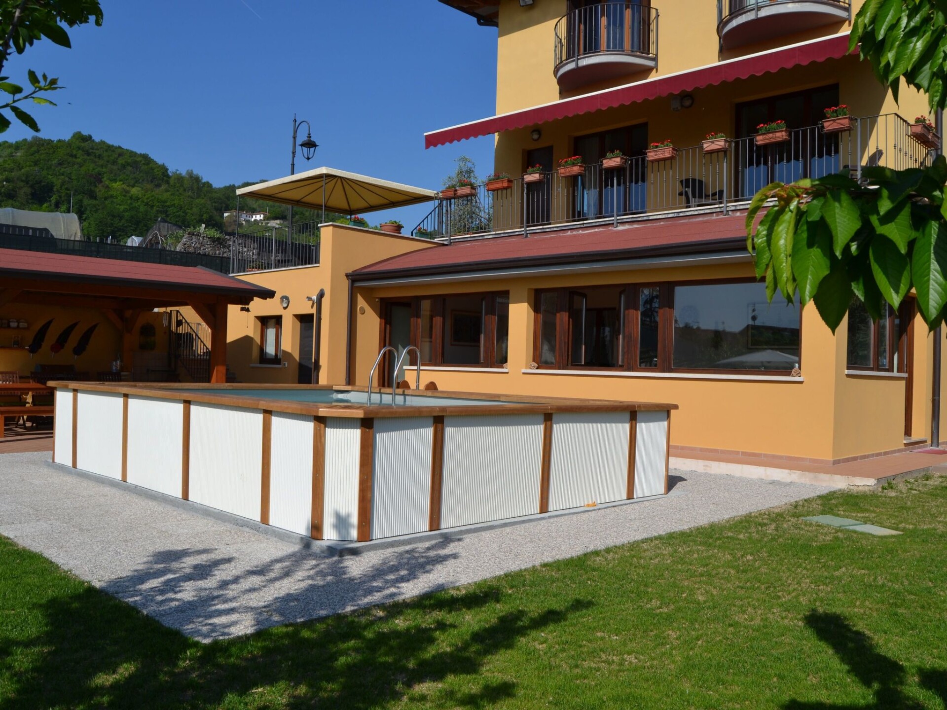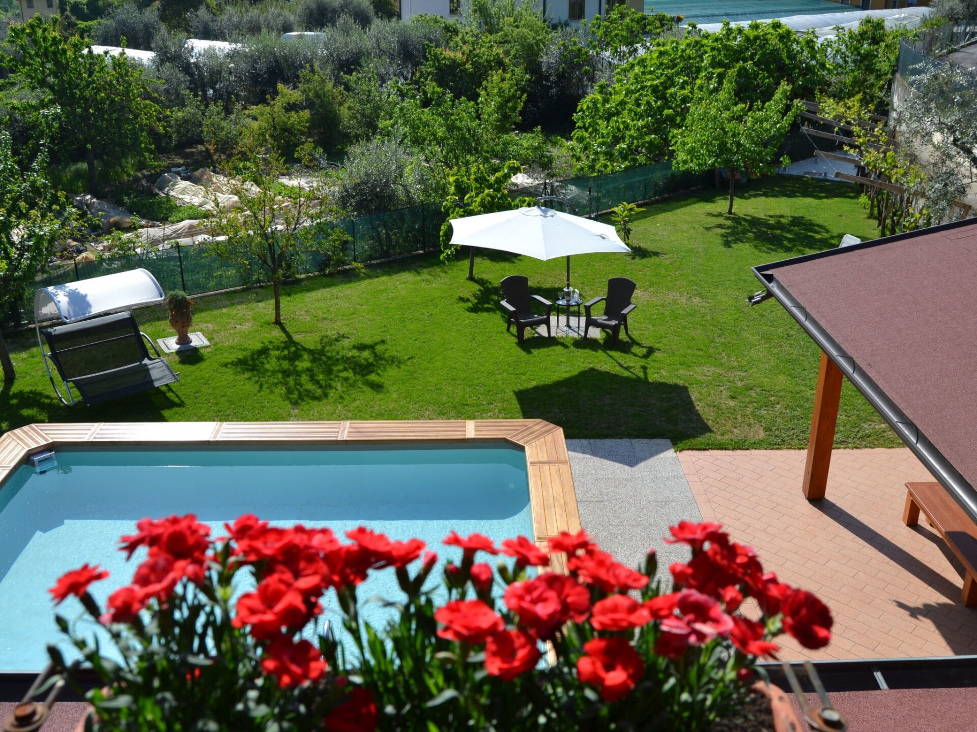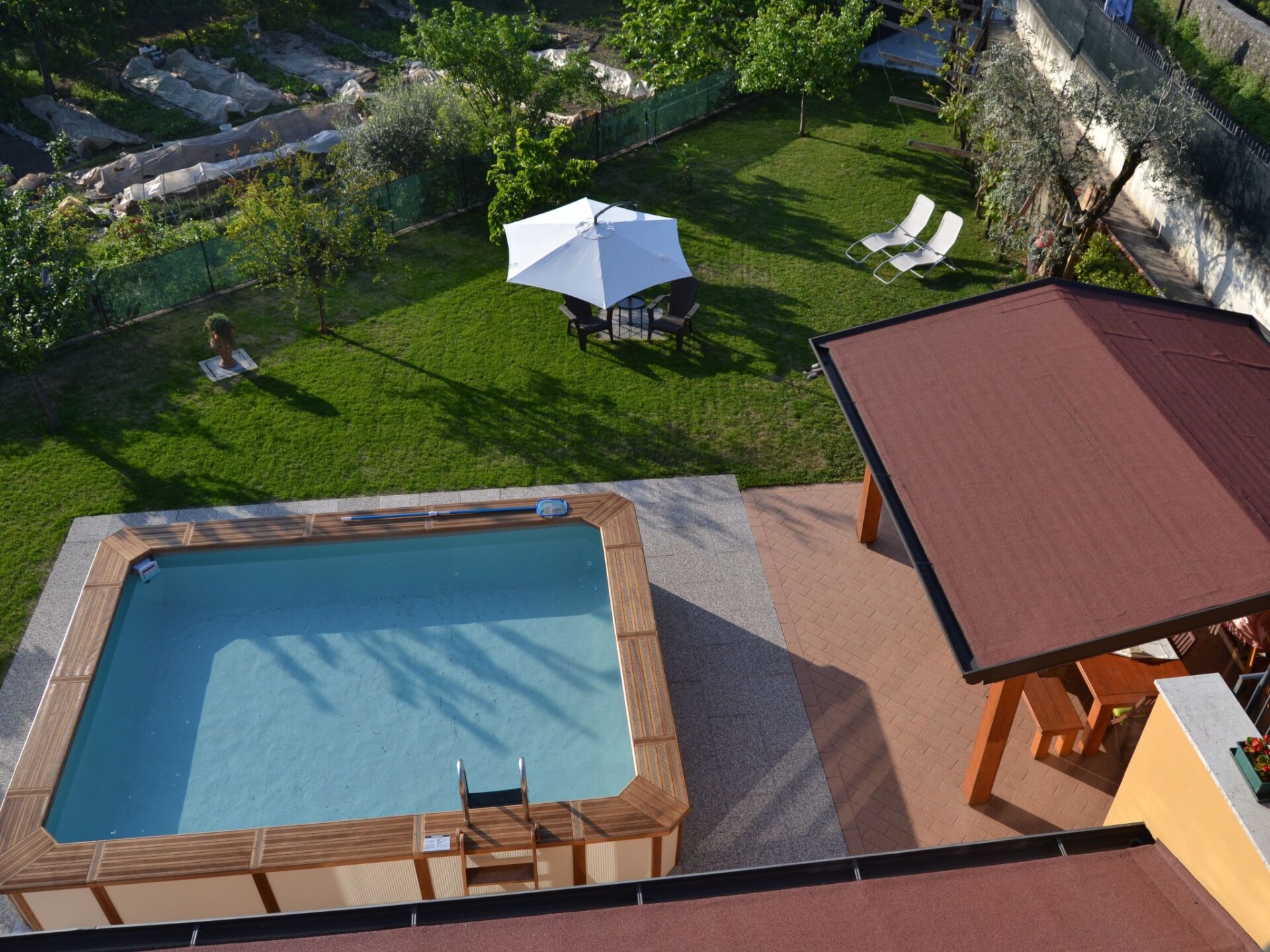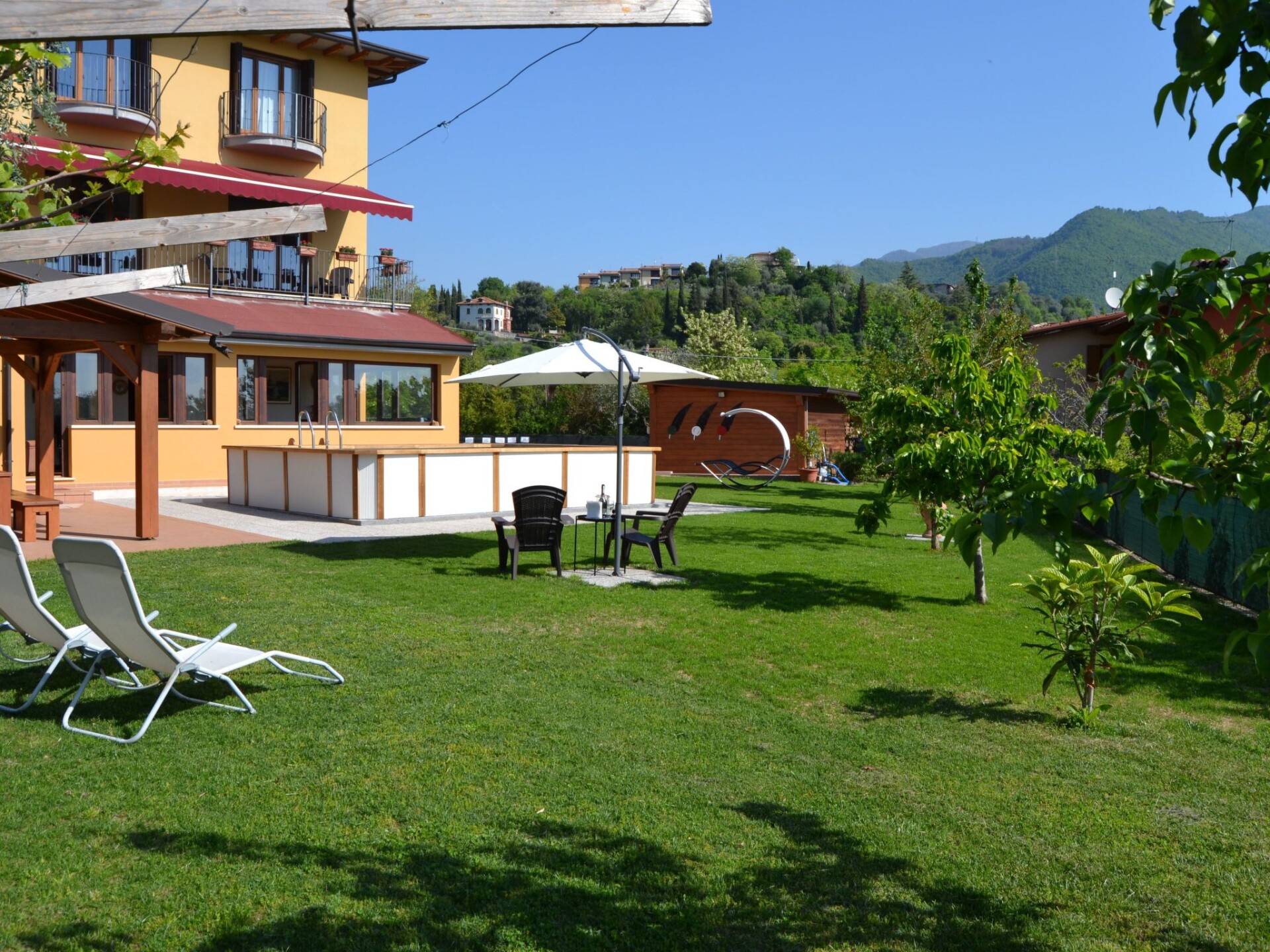 Villa La Veranda - holiday flat in Salò - Lake Garda Villa La Veranda is located in the panoramic area of Salò; it has two floors with a large garden with lawn and fruit trees. Your holiday flat is situated on the ground floor and covers an area of more than 120 square metres, with a large veranda. Outside there is a large garden of 600 square metres, a large swimming pool, a porch with a large 3-metre table and a gas BBQ and a private parking space.Outside you can enjoy a large swimming pool, a large garden of approx. 600 square metres, entirely lawned and a dozen or so fruit trees, including cherries, peaches, pears, apples and plums. A large tiled and covered 4x4 m porch is at your disposal with a large 4 m table with benches and chairs for more than 12 persons. A modern gas BBQ is at the flat's disposal. A large laundry room, which includes a sink and washing machine, can be used on request.SANITIZATION with OZONE (MD5 Motor Data). The flat covers an area of more than 120 square metres and includes: a large swimming pool, a large living veranda, a 20 square metre kitchen, a double bedroom with a large bed, a bathroom with shower, a large children's room of almost 30 square metres with three single beds and the possibility of adding a fourth extra bed. It also has a cot for small children that can be accommodated in the double bedroom and in the second bedroom. The flat is entirely on the ground floor, with no architectural barriers, only one step to the entrance and has underfloor heating throughout. The large kitchen is equipped with a refrigerator and freezer, a gas cooker and an electric oven, as well as a microwave oven and a water boiler. it includes everything you need for cooking and dining, such as plates, glasses, cutlery, crockery, pots, pans, cups and tablecloths. it has a large table with chairs for 8 people and antique furniture-credentials. Bed linen and towels are provided in the flat. In the large veranda of approx. 40 square metres there are sofas for 10 persons, a table with rustic bench where 8 persons can sit and eat comfortably, a large 42" flat screen HD television complete with satellite decoder to pick up TV from various satellites including Astra and Hotbird. Internet is available free of charge with ADSL Wi-Fi throughout the area.In the immediate vicinity you can find the sports area, with football, five-a-side football and tennis courts, and a large public indoor and outdoor swimming pool, open all year round. The public beach at the lake is only 800 metres away and can be used without payment. A large golf course is available in the surrounding area for golf enthusiasts, as well as numerous other beaches and tourist facilities. From the house there is easy access to a promenade of over 4 km on foot, which encircles the entire panorama route, and another, at the edge of the lake, of over 2 km.La Veranda is approx. 30 m from the main road, away from the hustle and bustle of traffic and the access road continues traffic-free through the village of Campoverde, to the centre of Salò, with no traffic problems and entirely walkable without the hassle of having to cross car traffic roads and easily reach the lake and the nearby sports centre. IT017170C277A97JEL