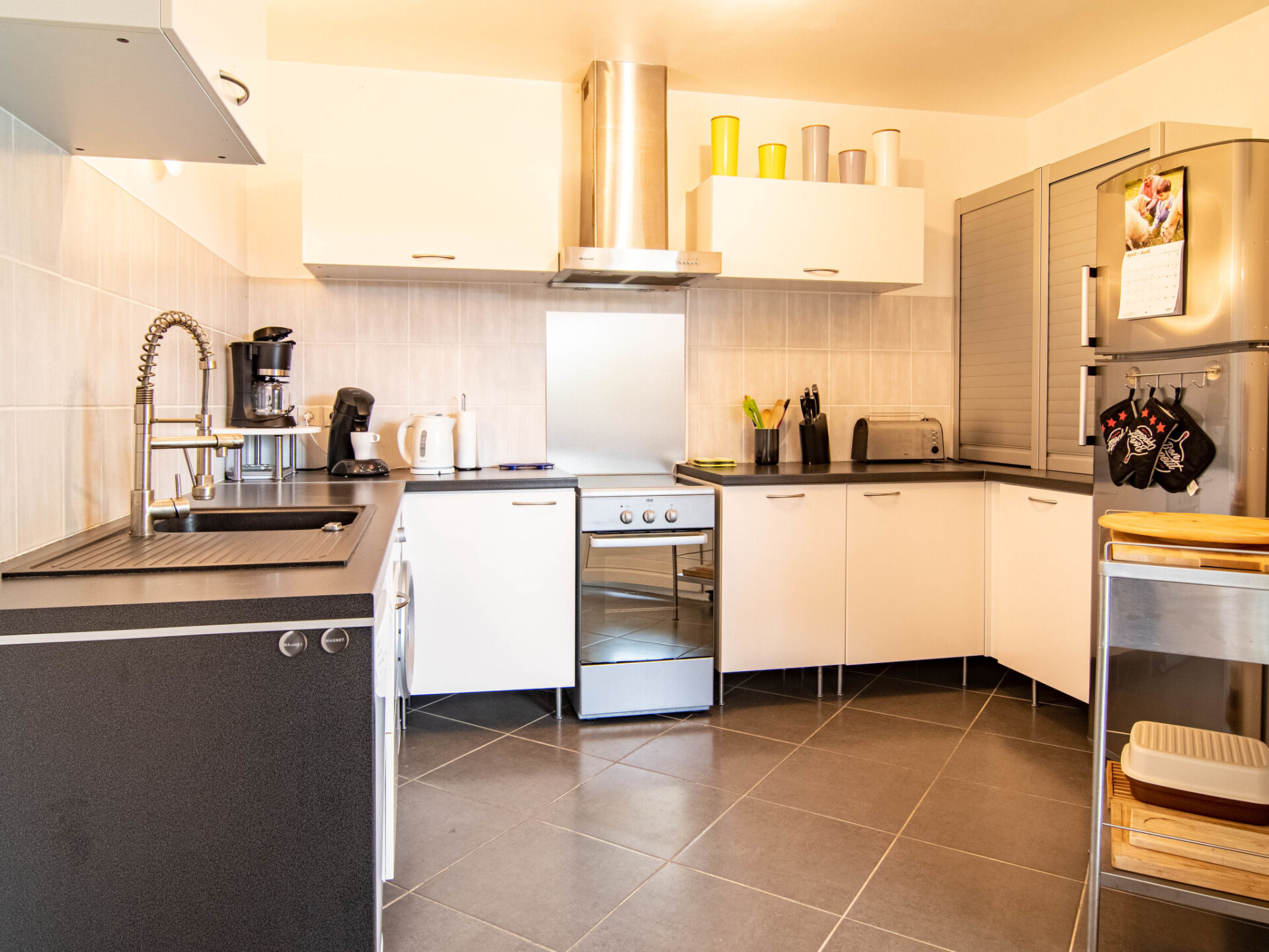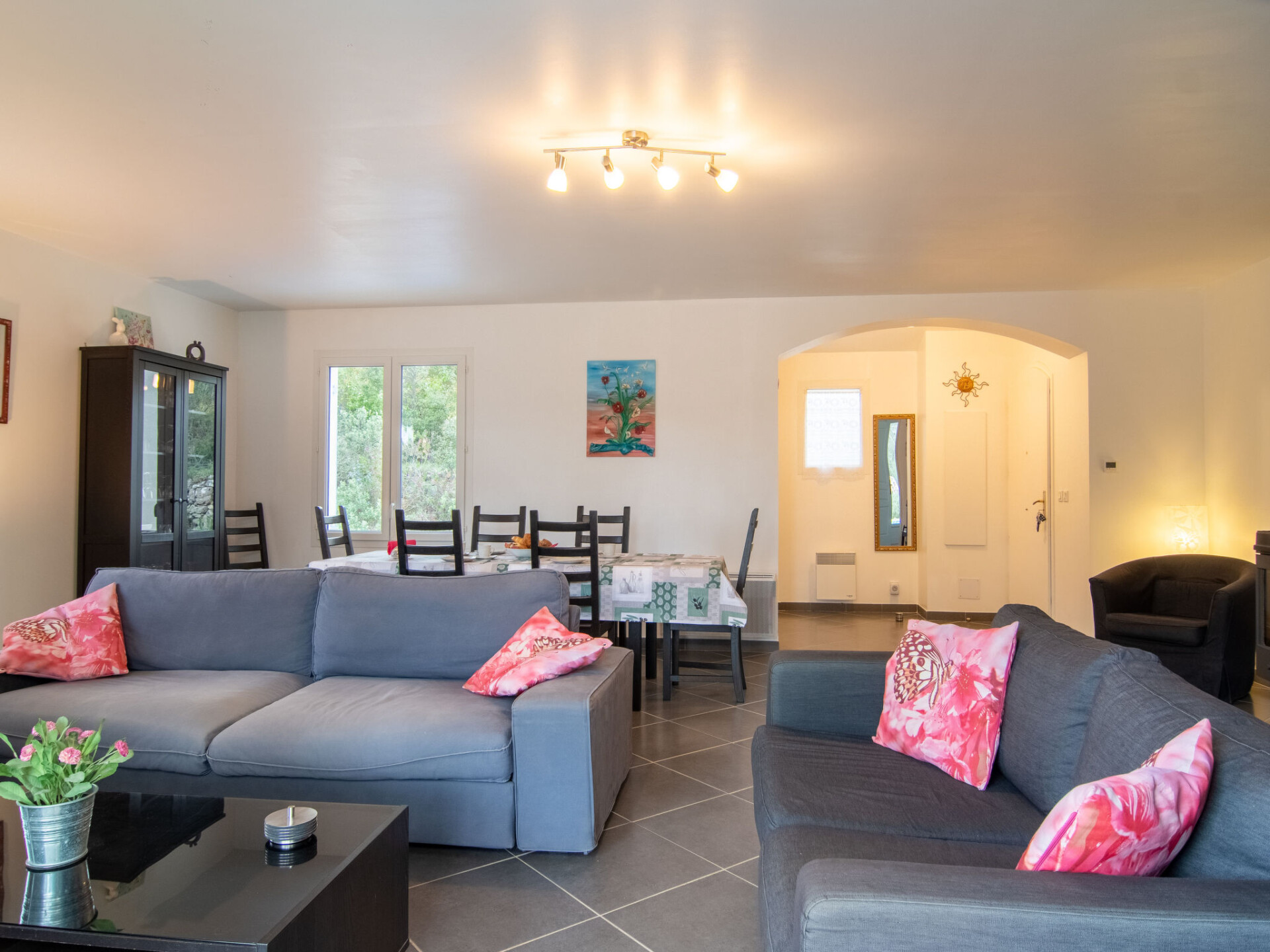 "Au Romarin", huis 4-kamers 110 m2. Mooi en modern ingericht: woon-/eetkamer met eettafel, Sat-TV, stereo-installatie, DVD en houtkachel. Uitgang naar het terras. 1 kamer met 1 2-pers bed (160 cm), douche. Uitgang naar het terras. 2 kamers, elke kamer heeft 1 2-pers bed (140 cm). Keuken (oven, afwasmachine, 4 inductiekookplaten, broodrooster, waterkoker, magnetron, diepvriezer, elektrische koffiemachine). Uitgang naar het terras. Bad/WC, aparte WC. Elektrische verwarming. Terras, prieel. Terrasmeubelen, elektrische barbecue, ligstoelen (4). Ter beschikking: wasmachine, droger, strijkijzer, kinderstoel, kinderbed. Internet (Internet (WiFi), gratis). Rookmelders.