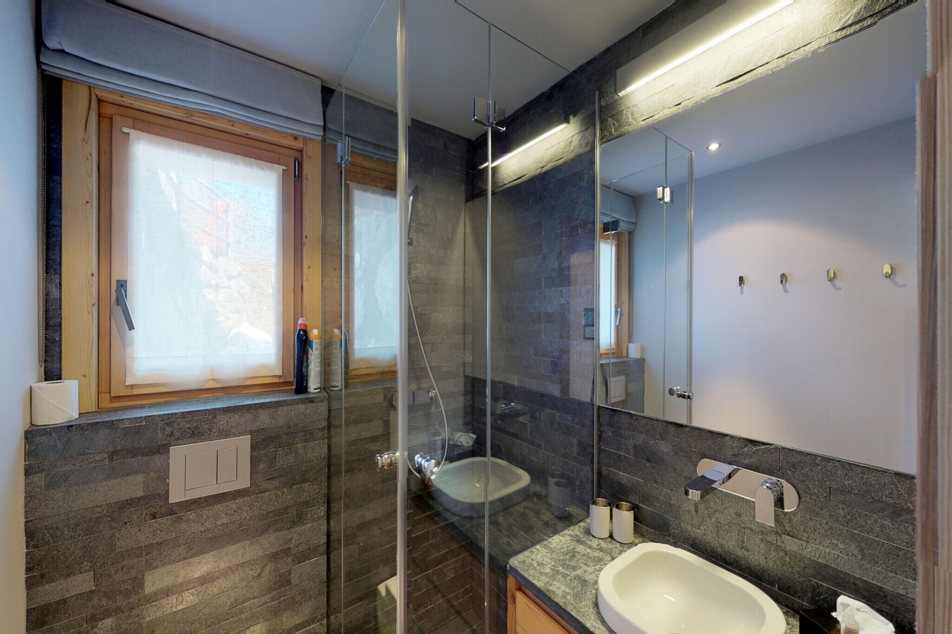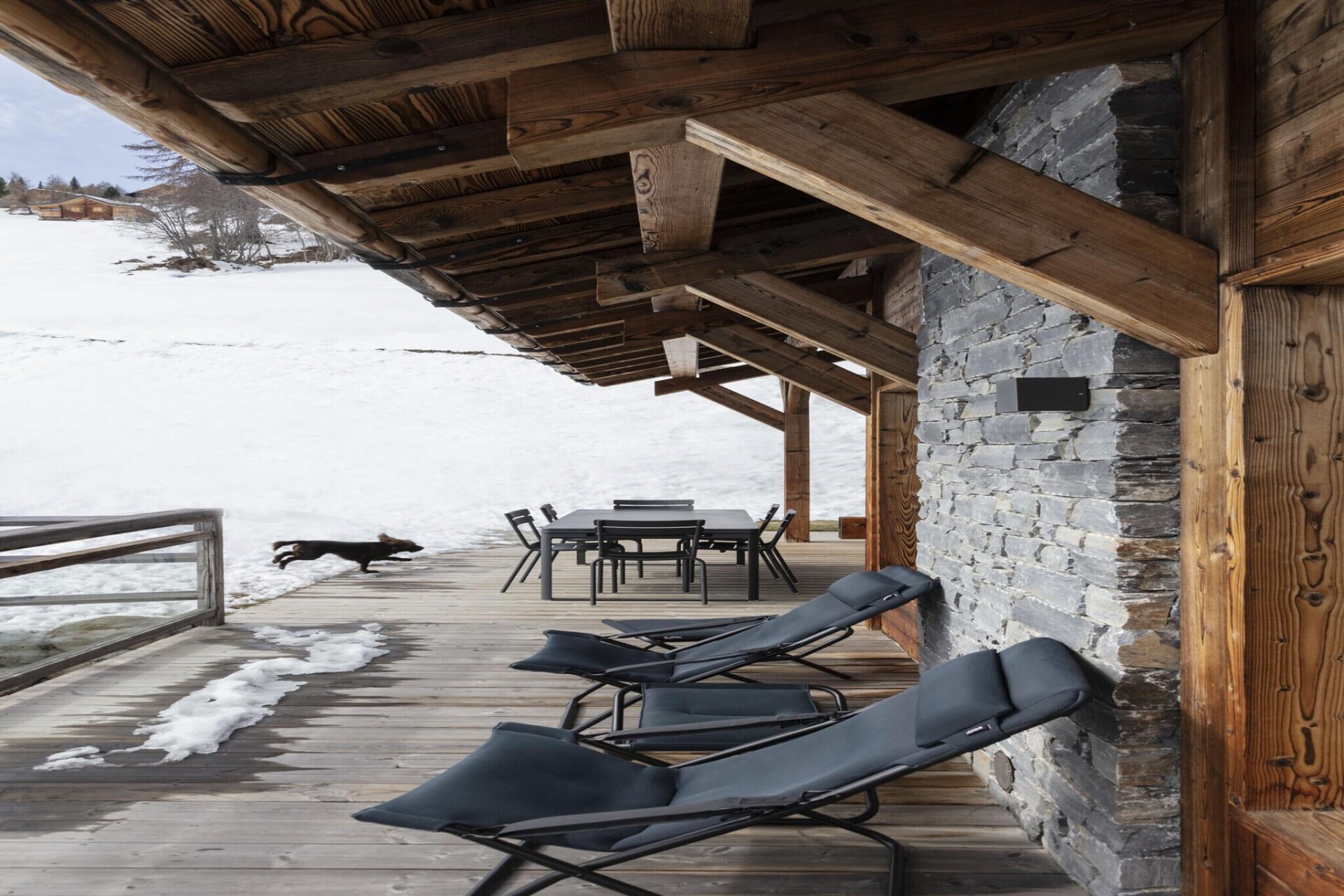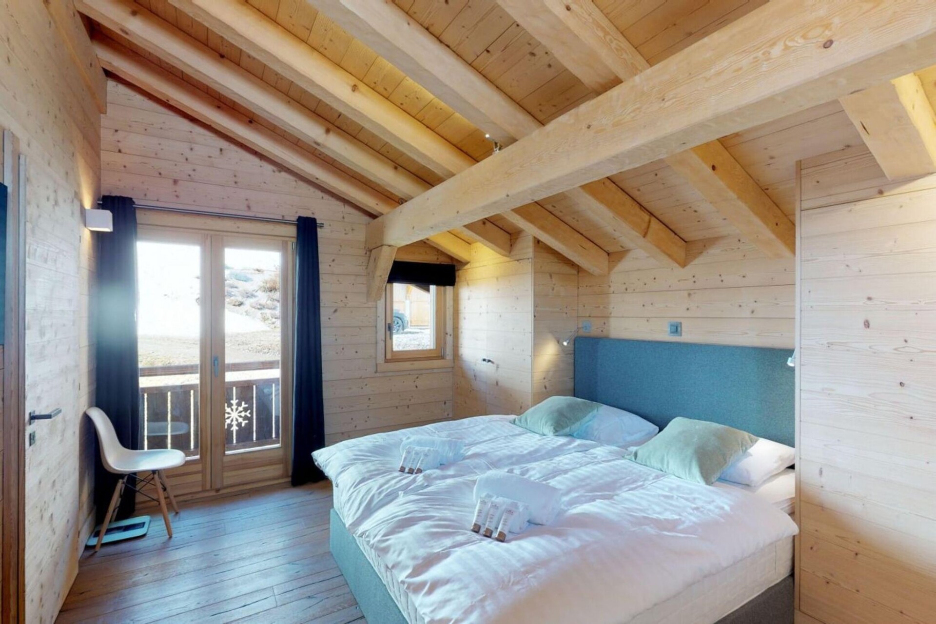 Het chalet biedt vier luxe slaapkamers, waaronder een hoofdslaapkamer met een tweepersoonsbed (180x200 cm) en drie andere kamers met comfortabele eenpersoonsbedden en stapelbedden. Er zijn vier badkamers, waaronder een royale aangrenzende doucheruimte met een bad, Italiaanse douche en dubbele wastafel. Geniet van de buitenruimte met een kleine tuin en een groot terras met een spectaculair uitzicht op de vallei. Voor het gemak beschikt het chalet over een wasruimte met een wasmachine en droger, samen met twee parkeerplaatsen buiten.