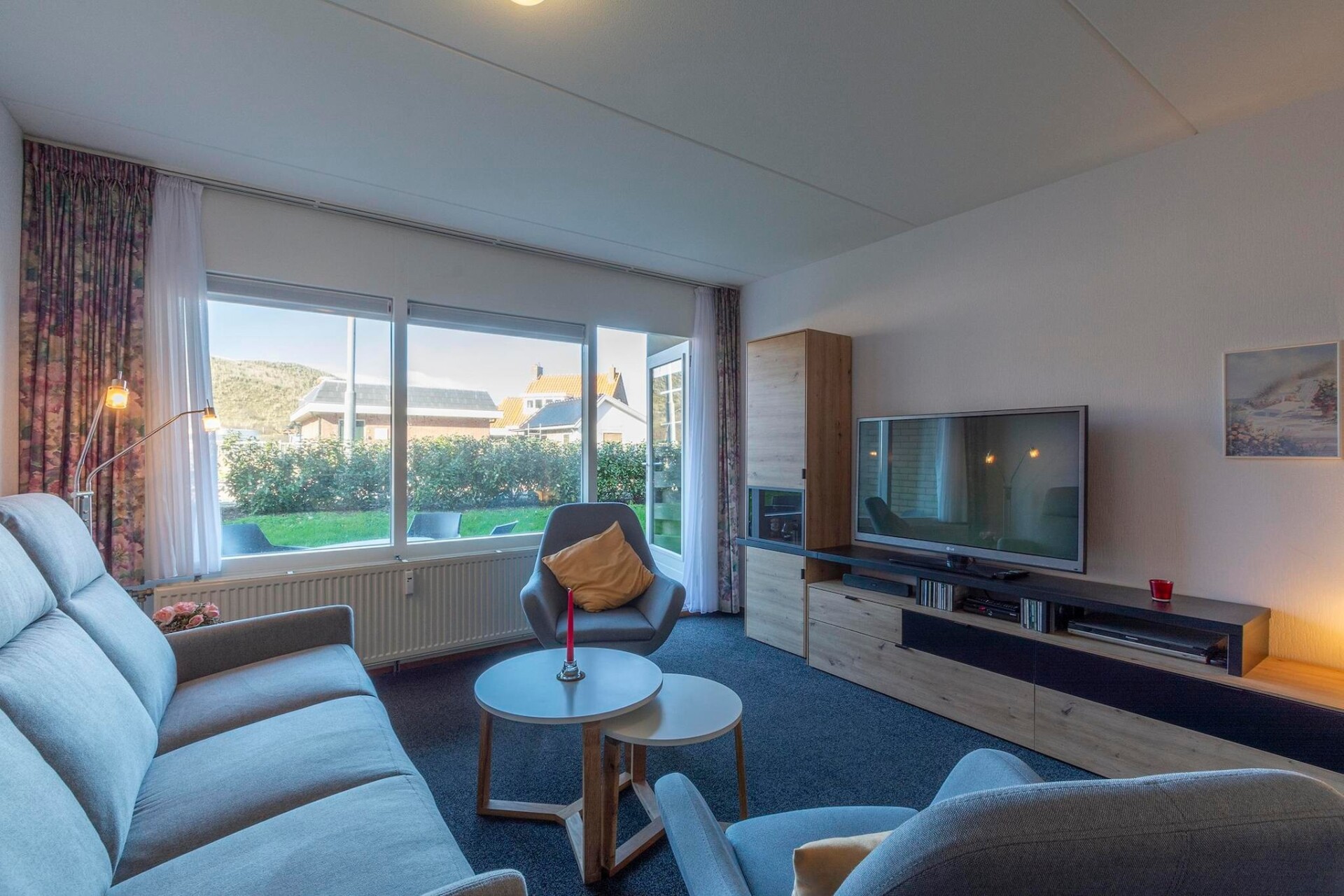 Het appartement beschikt over een gezellige woonkamer met uitzicht op de duinen, een goed uitgeruste open keuken en een comfortabele eetruimte. Met twee ruime slaapkamers, elk met een tweepersoonsbed, en een nette badkamer met bad en douche, heeft u alles wat u nodig heeft voor een ontspannen verblijf. Entertainment is onder andere een flatscreen-tv, wifi en een AM/FM-radio, terwijl praktische voorzieningen zoals een stofzuiger, droogrek en centrale verwarming het hele jaar door voor gemak zorgen.