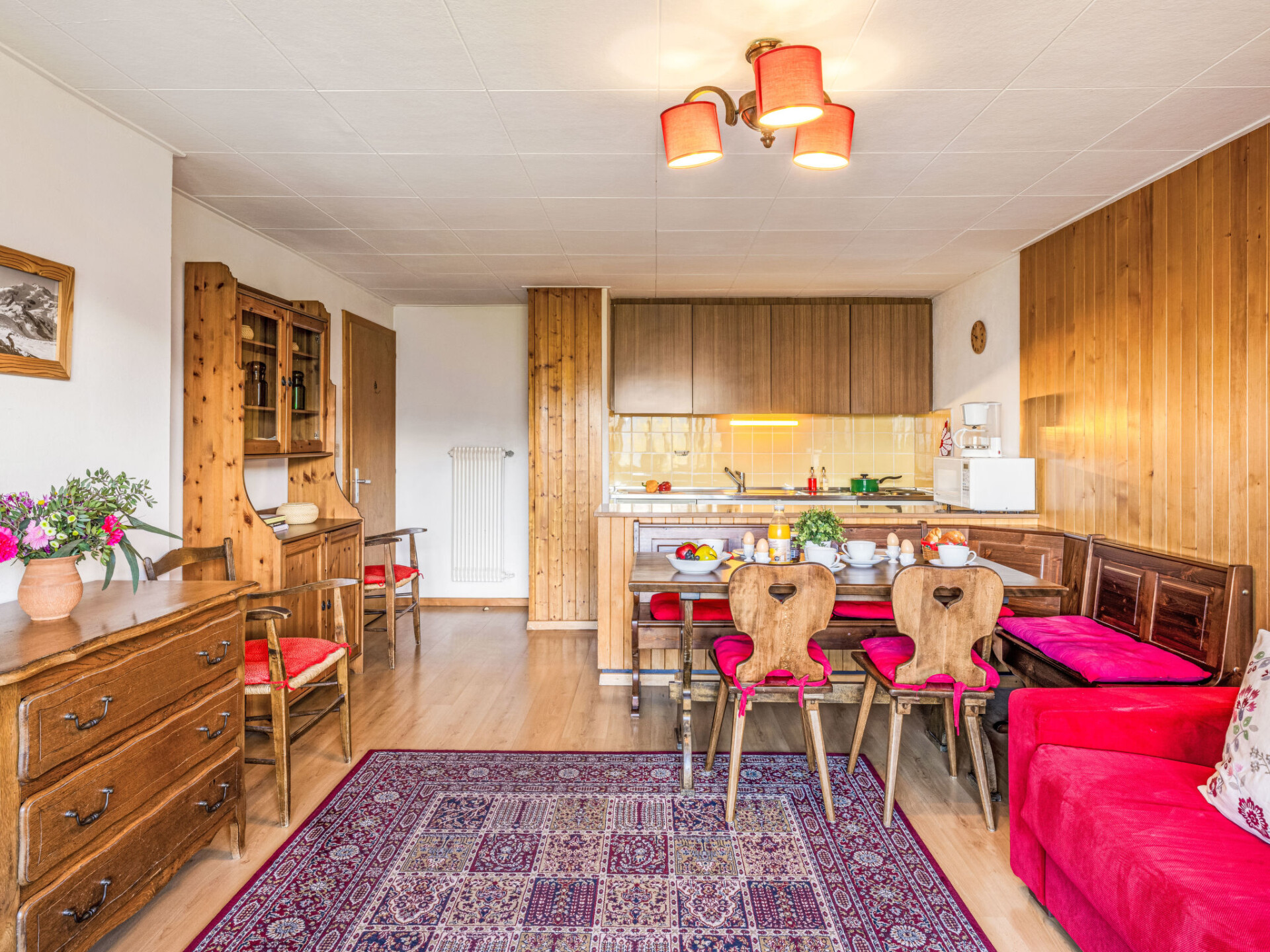 "Beausoleil 14", appartement 2-kamers 37 m2 op de 4e verdieping, op het zuiden gelegen. Eenvoudig en doelmatig ingericht: woon-/eetkamer met 1 2-pers divanbed (1 x 140 cm, lengte 200 cm), Kabel-TV. Uitgang naar het balkon. 1 kleine kamer met 2 bedden (90 cm, lengte 200 cm). Kookhoek (oven, broodrooster, waterkoker, magnetron, fondue Set (kaas)) met bar. Bad/WC. Groot balkon, op het zuiden gelegen. Balkonmeubilair. Zeer mooi uitzicht op de bergen en het landschap. Ter beschikking: haardroger. Internet (Internet (WiFi), gratis). Parkeerplaats nr. 14 bij het huis. Niet rokers woning.