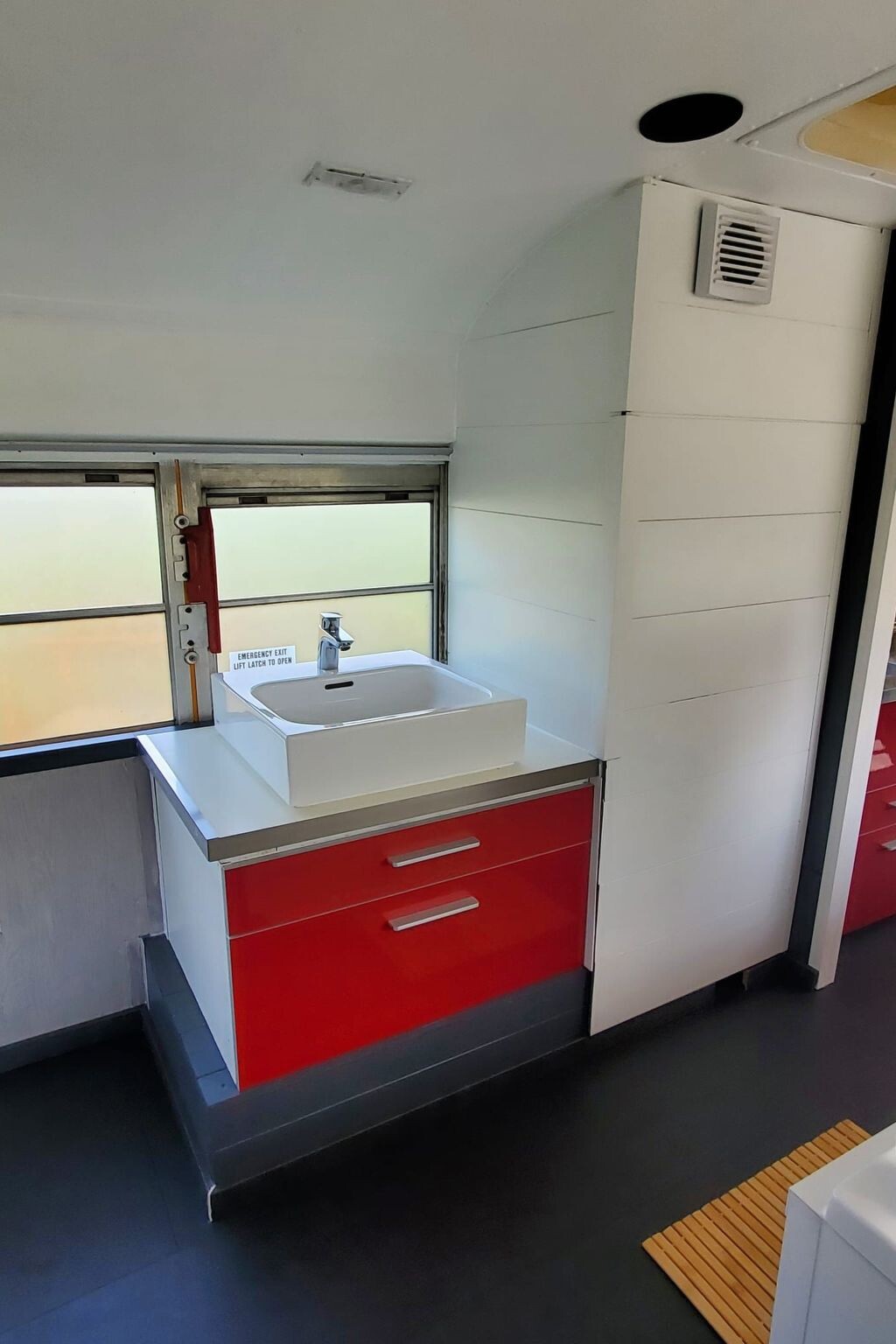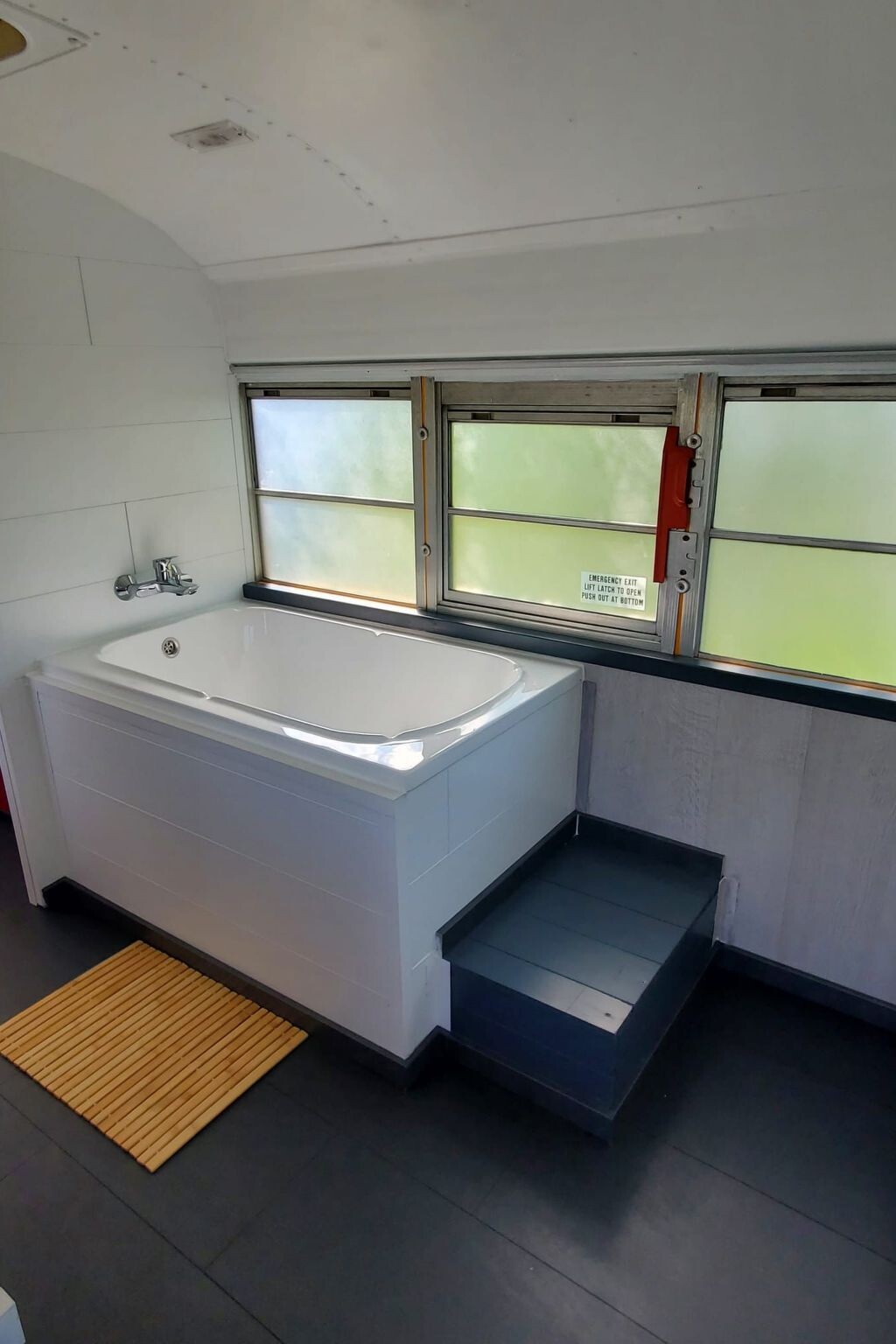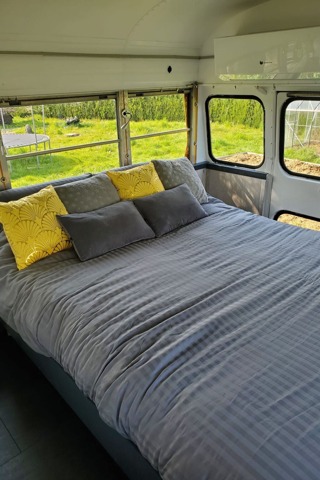 You'll have a unique opportunity to stay in a real American school bus. Ours comes from Pennsylvania and has been specially fitted out for maximum comfort.The School Bus is parked in our garden, so it's part of our green philosophy and commitment! We want our impact on resources and nature to be minimal. That's why the cosy sheets that welcome you will be air-dried but not ironed... The toilets on the bus are dry toilets. Waste sorting bins are available. The School Bus is also powered by photovoltaic panels. Finally, all the bus fittings (from the washbasins to the spoon) have been made from recycled or second-hand materials. Obviously, this choice has no impact on comfort, and you'll be welcomed into a cocoon of softness.A terrace with garden furnitureA large bedroom with a super-comfortable king-size bedA bathroom with a small bath and dry toiletsA well-equipped kitchen, despite the small spaceA cosy lounge and dining area