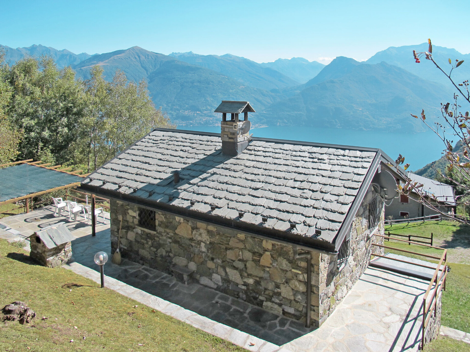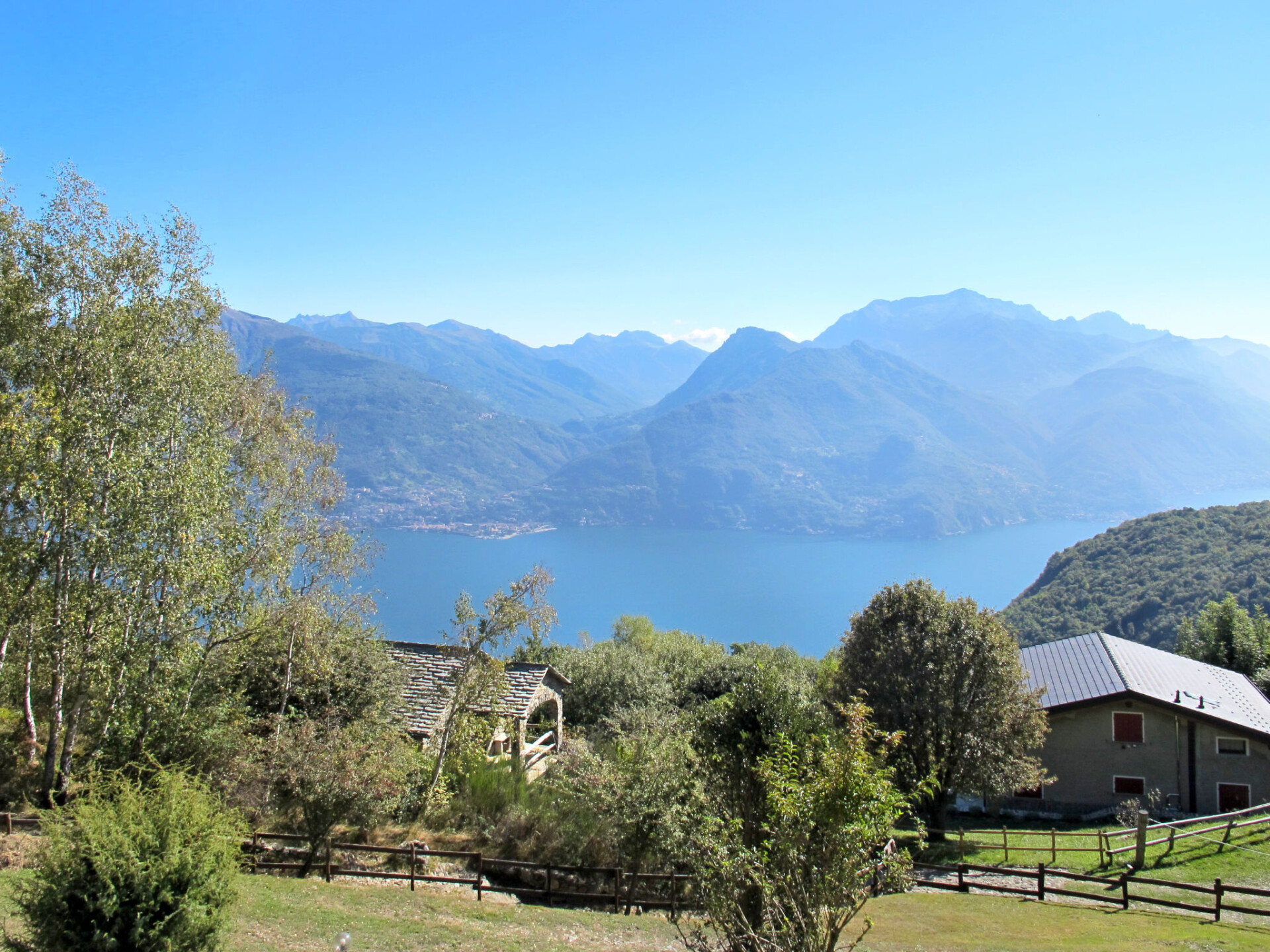 Mooi rustieke woning "Bellavista", 1.021 m boven zeeniveau, omgeven door bomen en weiden. Boven Breglia (2 km), 9.5 km van het centrum van Menaggio, 37 km van het centrum van Lugano, 44 km van het centrum van Como, in het district Plesio (4 km), geïsoleerde ligging tegen een helling, 9.5 km van het meer. Voor alleengebruik: terrein (omheind), tuin op verschillende niveaus met weide. 2 km lange steile, smalle toegangsweg (100 m onverharde weg). Parkeerplaats bij het huis op 50 m. Winkel 2 km, supermarkt 9.5 km, restaurant 2 km, bushalte 2 km, treinstation "Como" 44 km, kiezelstrand "Menaggio/Nobiallo" 10 km, openluchtzwembad 9.5 km, strandbad 9.5 km. Jachthaven 9.5 km, golfterrein (18 holes) 13 km, wandelroutes 50 m vanaf het huis. Attracties in de buurt: Menaggio, Villa Carlotta-Tremezzo, Villa Balbianello-Lenno, Bellagio, Varenna, Como. Bekende meren kunnen gemakkelijk worden bereikt: Lago di Lugano. Wandelgebied Monte Grona, Monte Galbiga. Auto noodzakelijk.