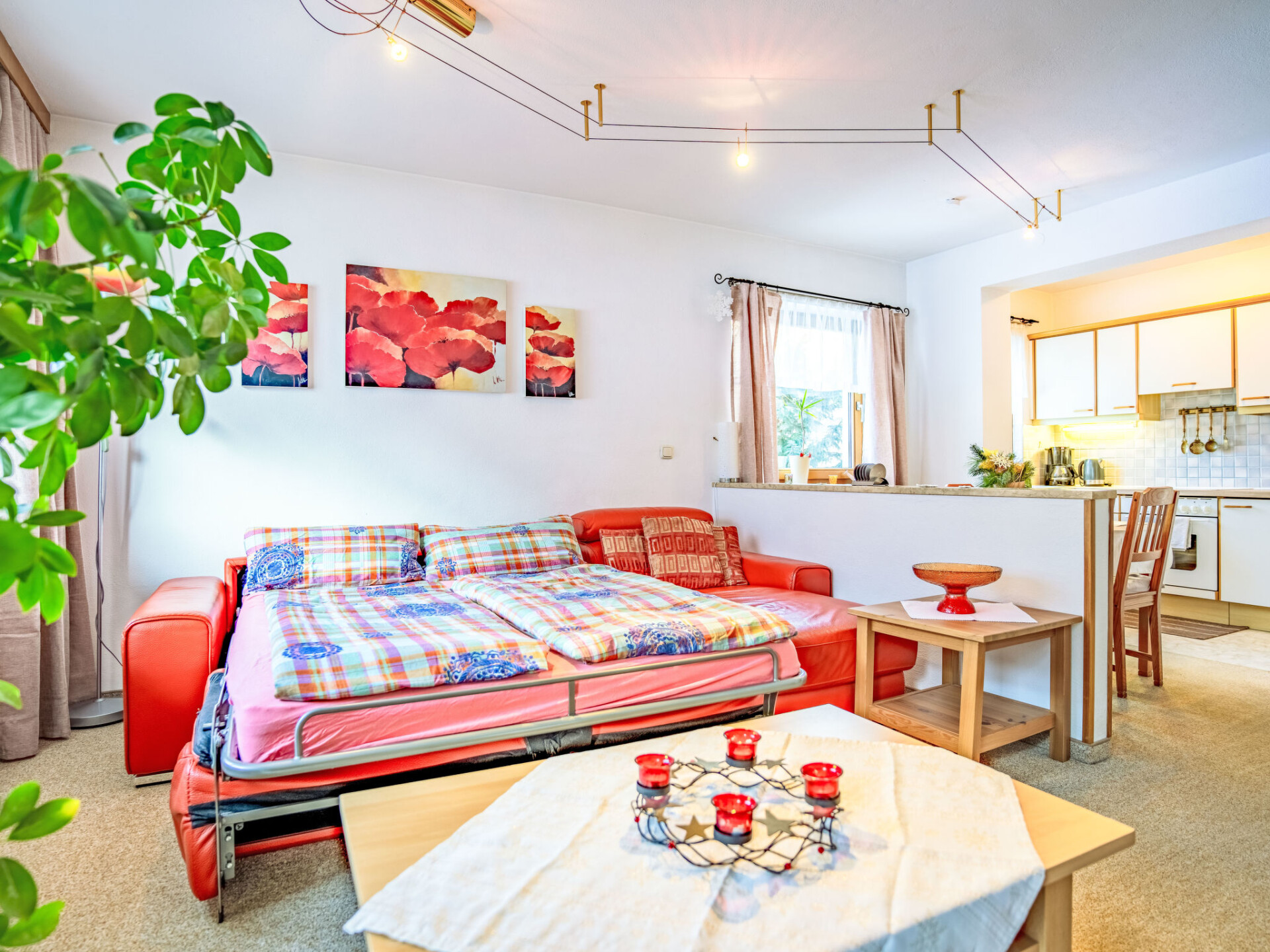 Appartement 2-kamers 64 m2 op de 1e verdieping. Gezellig ingericht: hal. Woon-/slaapkamer met 1 2-pers divanbed (115 cm, lengte 172 cm), Sat-TV (Flatscreen TV), radio, CD-speler en DVD. Uitgang naar het balkon. 1 2-pers. kamer. Uitgang naar het balkon. Open keuken (oven, 4 keramische glas kookplaten, magnetron, elektrische koffiemachine) met eettafel. Badkamer, aparte WC. Balkon. Balkonmeubilair. Mooi uitzicht op de bergen en het landschap. Ter beschikking: wasmachine. Internet (Internet (WiFi), gratis). Parkeerplaats nr. 4. Niet rokers woning. Rookmelders.