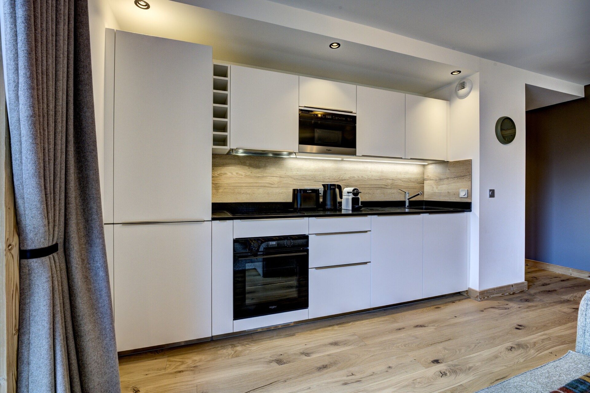 Het interieur combineert moderne elegantie met alpine warmte. De volledig uitgeruste keuken is voorzien van een grote oven, magnetron, vaatwasser, koelkast, vriezer, wasmachine en Nespresso-apparaat, zodat gasten kunnen genieten van alle comfort van thuis. Entertainment is eenvoudig met Smart TV, Britse zenders, Netflix, een muziekspeaker en gratis wifi. Het appartement beschikt ook over een skiberging, lift en beveiligde ondergrondse parkeergarage (maximale hoogte 2,2 m). Houd er rekening mee dat huisdieren niet zijn toegestaan.