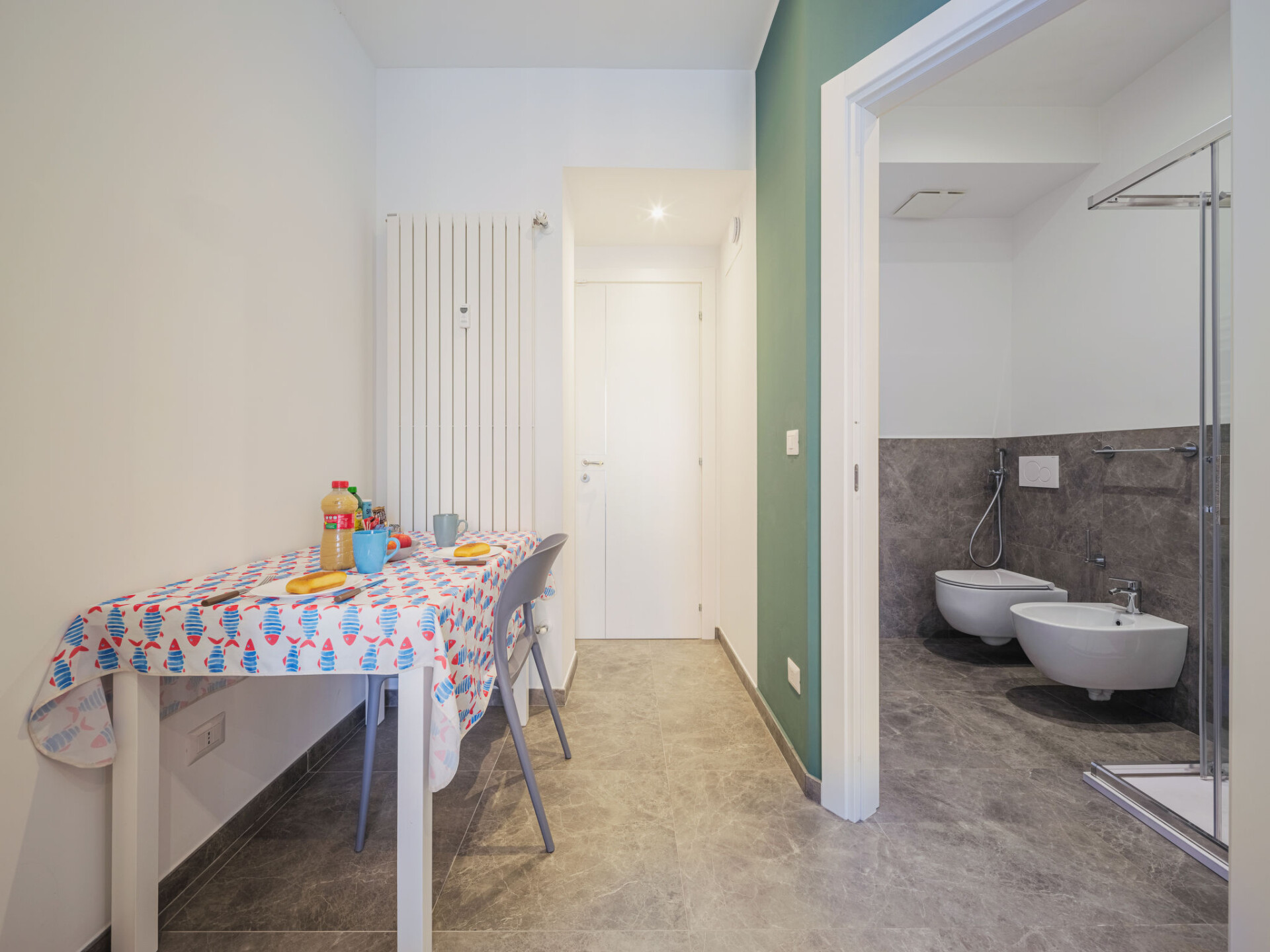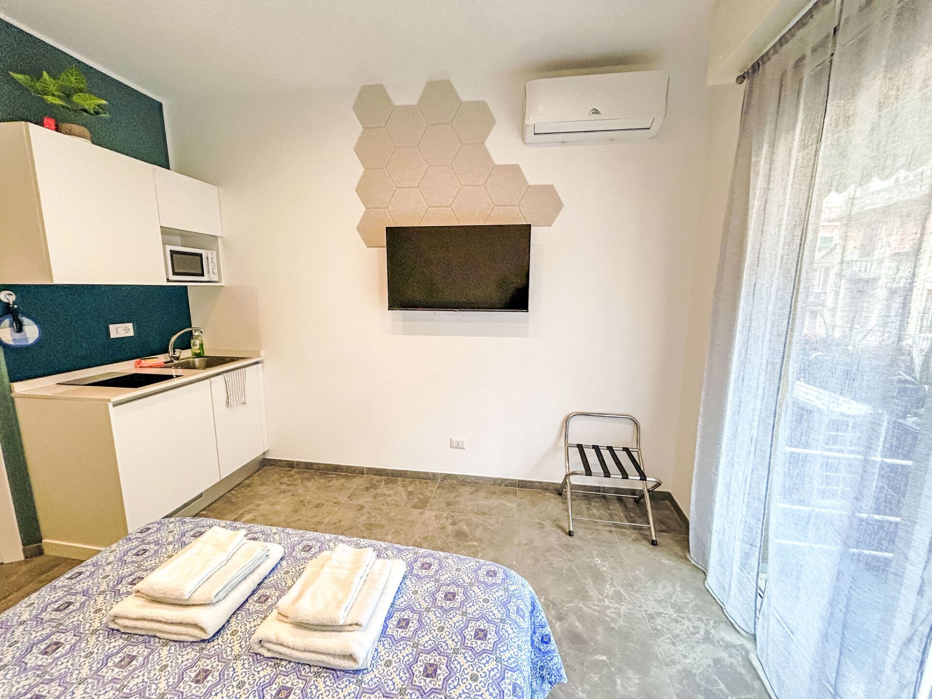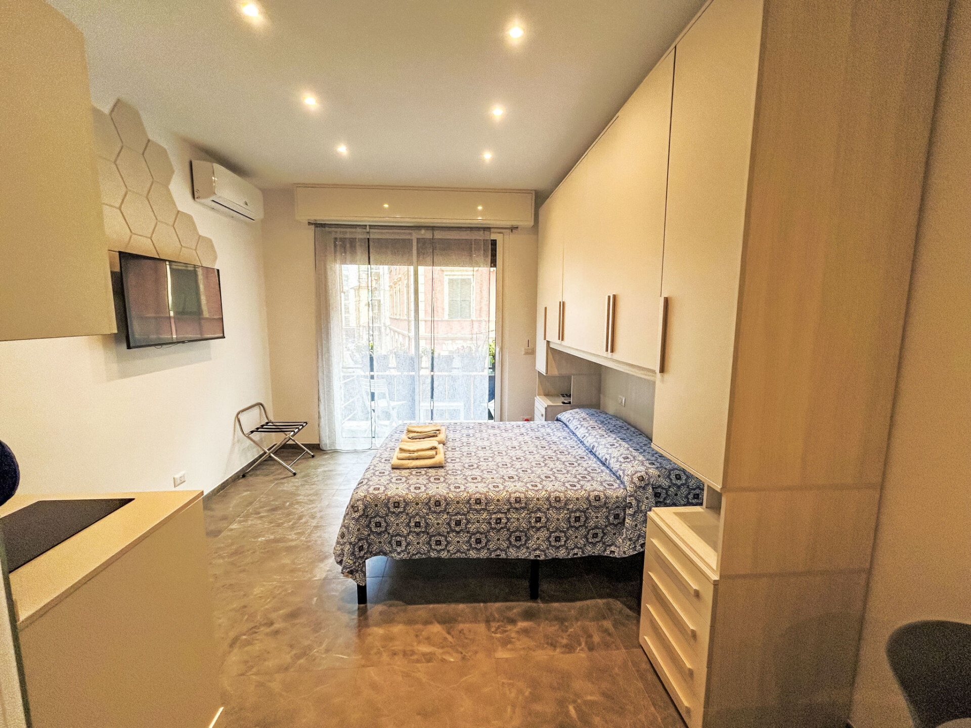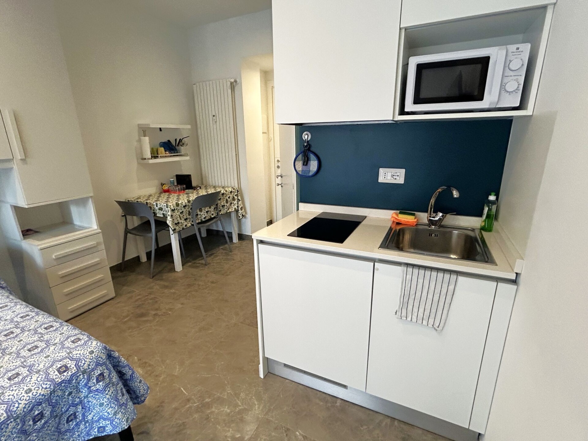 "Blu", studio 1-kamer 22 m2 op de 2e verdieping. Volledig gerenoveerd in 2023, doelmatig en modern ingericht: woon-/slaapkamer met 1 2-pers bed (140 cm, lengte 190 cm), TV en elektrische rolluiken. Kleine kookhoek (2 inductiekookplaten, waterkoker, magnetron, elektrische koffiemachine). Douche/bidet/WC. Air-conditioning, heteluchtverwarming. Klein balkon. Ter beschikking: haardroger. Internet (WiFi, gratis). Koelkast zonder vriesvak. Rookmelders. IT010046C2USSHRFCZ