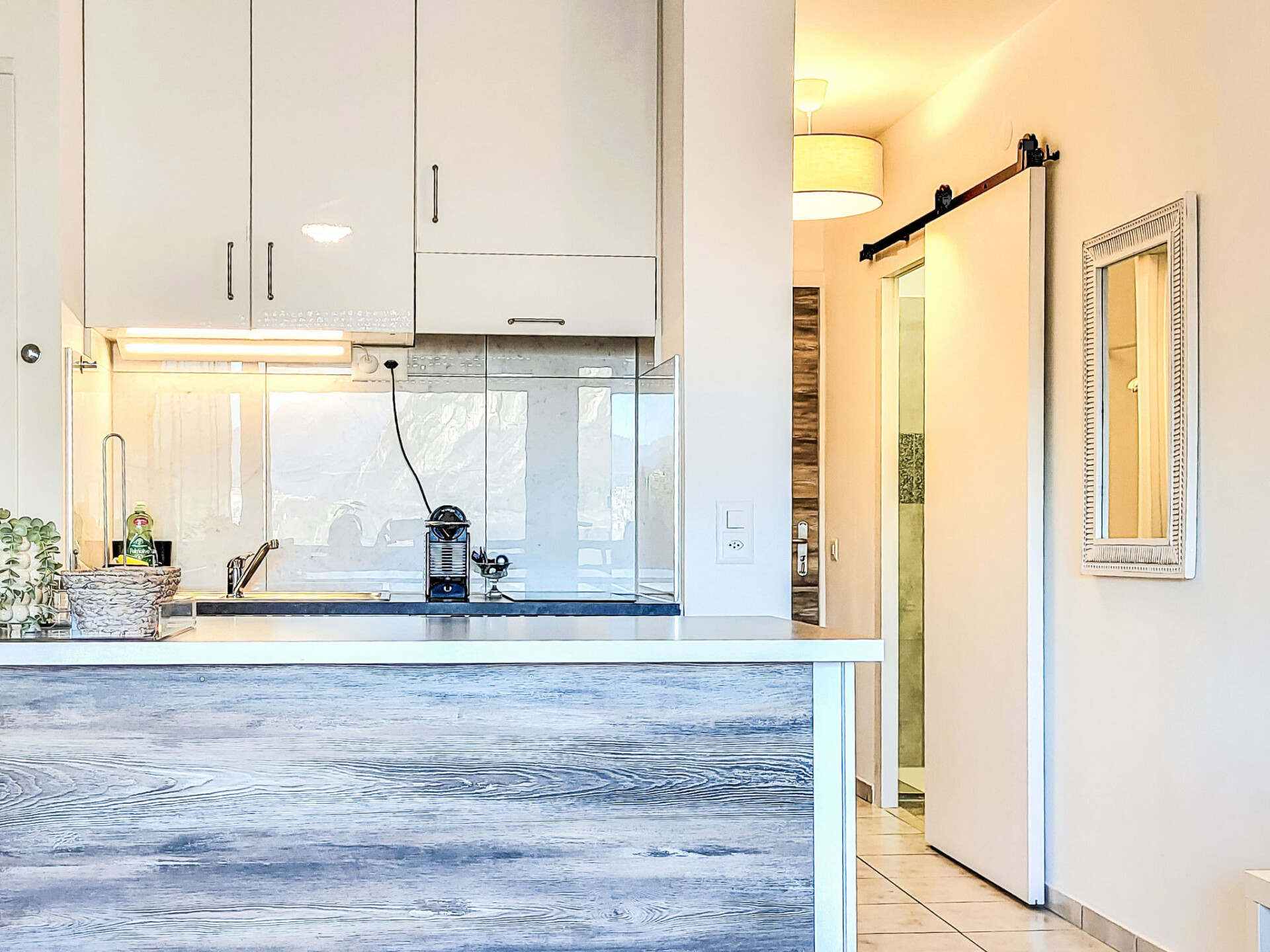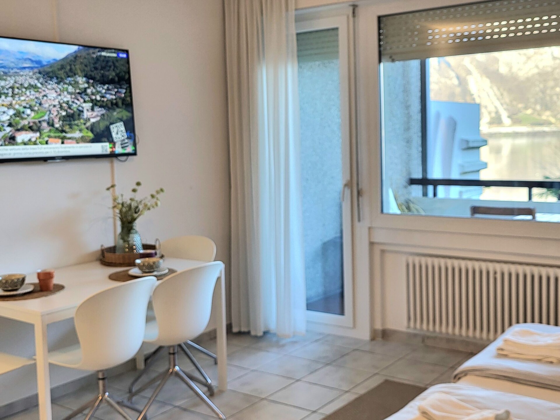 "Blue Lake Lugano Apt.312", appartement 2-kamers 50 m2 op de 3e verdieping, op het noordwesten gelegen. Het objekt is geschikt voor 2 volwassenen + 2 kinderen. Ruim en licht, mooi en modern ingericht: woon-/slaapkamer met 2 bedden (90 cm, lengte 200 cm), internationale TV-zenders, Flatscreen TV en air-conditioning. Uitgang naar het balkon, op het noordwesten. 1 open 2-pers. kamer, zonder ramen met 1 x 2 stapelbedden (90 cm, lengte 200 cm), ventilator. Open keuken (oven, 2 keramische glas kookplaten, elektrische koffiemachine, pads voor de koffiemachine (Nespresso) extra). Douche/WC. Natuurstenen vloeren. Klein balkon 10 m2, op het noorden gelegen en op het westen gelegen. Terrasmeubelen. Mooi uitzicht op het meer, het landschap en de plaats. Ter beschikking: kinderstoel, kinderbed tot 2 jaar (extra), haardroger. Internet (WiFi, gratis, Bandbreedte: 500 Mbit/s). Parkeerplaats bij het huis. Niet rokers woning. NL-00013009