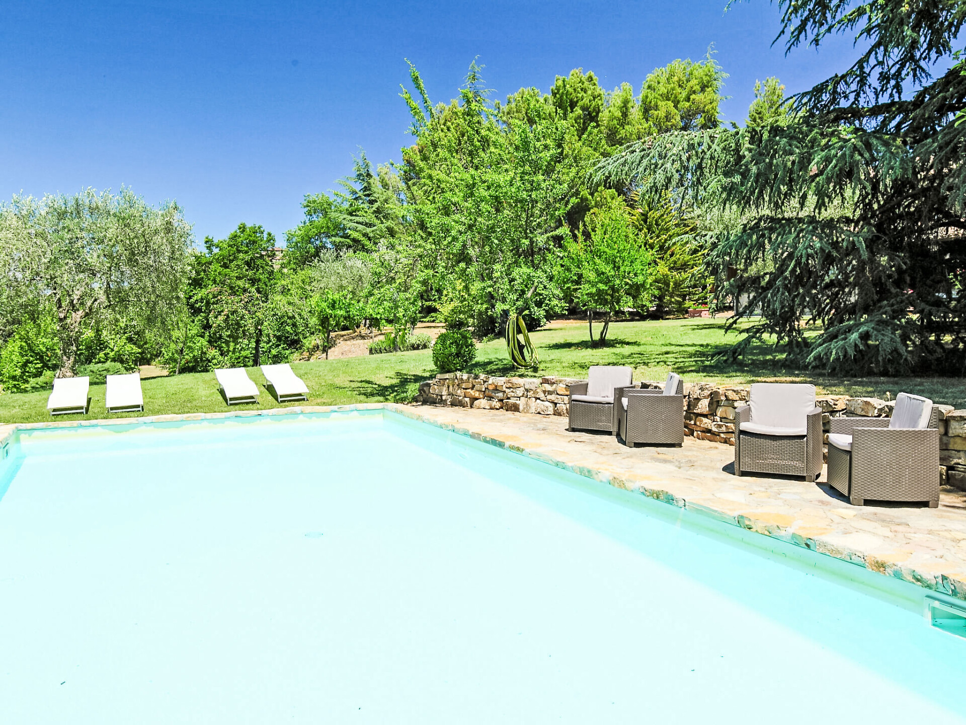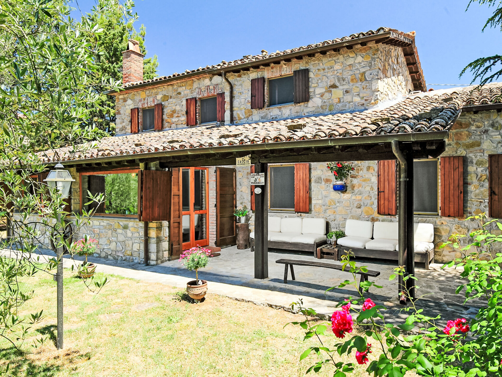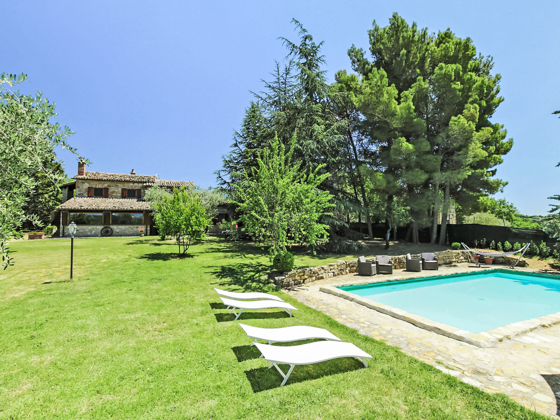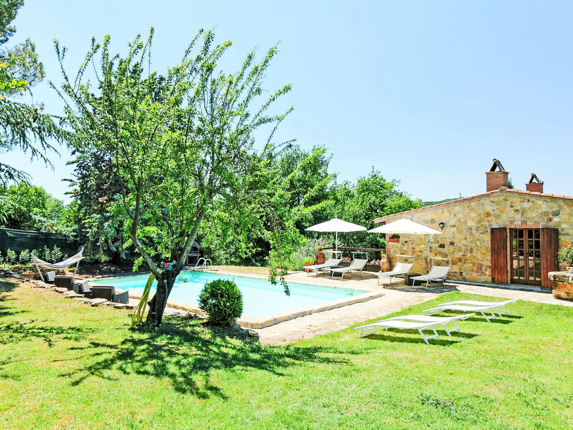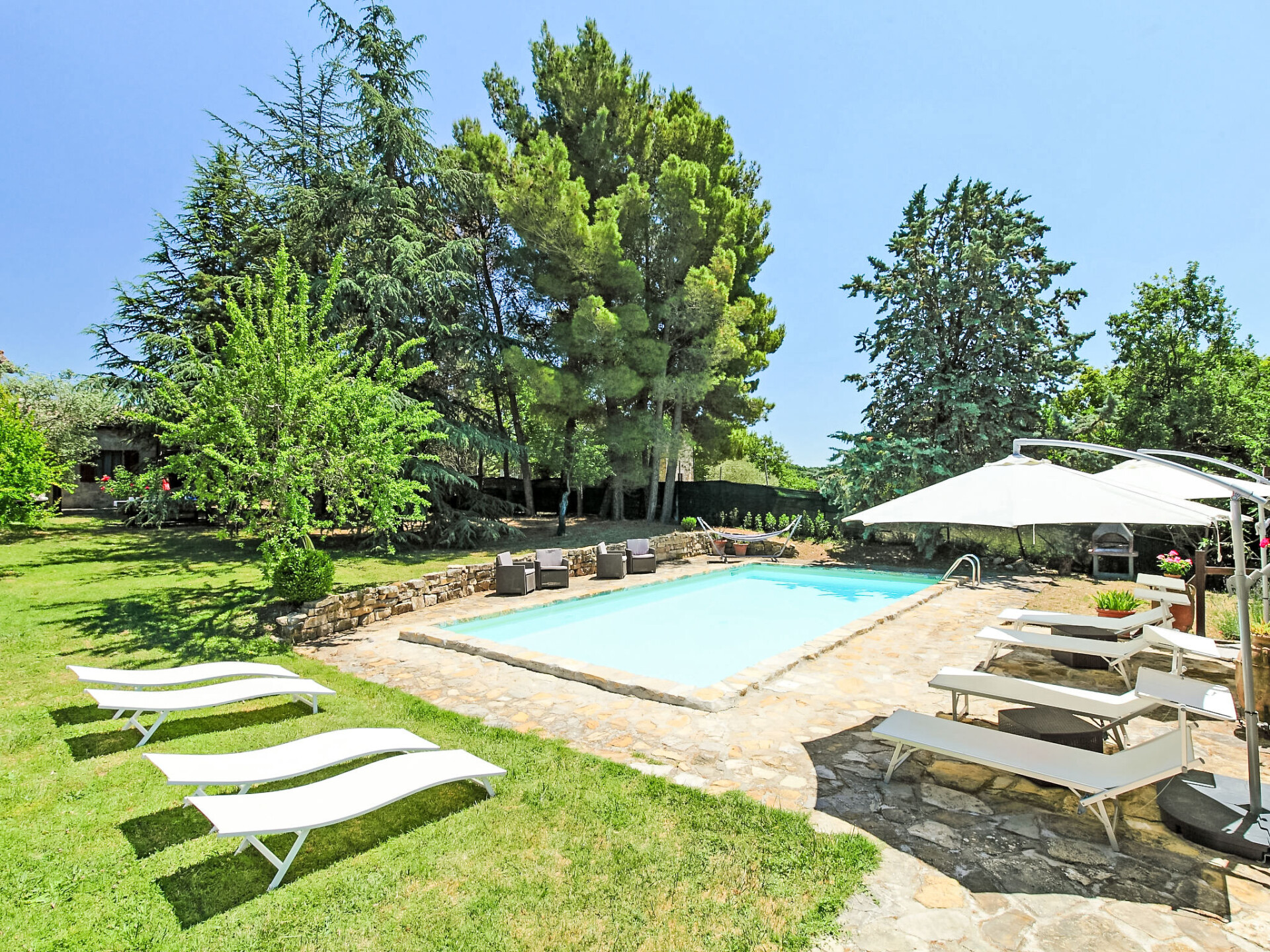 Landhuis "Casale Verciano", vrijstaand, omgeven door bomen. 2 km van het centrum van Parrano, geïsoleerde, rustige ligging, te midden van groen. Voor alleengebruik: terrein 5.000 m2 (omheind), mooie tuin ter ontspanning, openluchtzwembad (10 x 5 m, 140 cm diepte, seizoensgebonden beschikbaarheid: 06.Mei. - 30.Sep.). WC bij het zwembad, buitendouche, volleybal, tuinmeubelen, barbecue. In het huis: internetaansluiting, wasmachine. Wissel van linnengoed (extra wissel te betalen). Rommelige, smalle toegangsweg (2 km onverharde weg, bergweg). Parkeerplaats bij het huis. Supermarkt 10 km, restaurant 2 km, treinstation "Fabro Scalo" 10 km, thermaalbad "Chianciano" 38 km, meer (zwemmen) "Trasimeno" 45 km. Attracties in de buurt: Città Della Pieve 25 km, Cetona 26 km, Orvieto 50 km. Auto noodzakelijk. De eigenaar accepteert geen jeugdgroepen. Bij het zwembad staat een apart huis voorzien van een keuken / woonkamer met 2 slaapmogelijkheden. De ruimte is ideaal om te lunchen in de buurt van het zwembad. De villa bevindt zich in een afgelegen gebied langs een onverharde landelijke grindweg (2 km) (het is het beste om het rijden in lage auto's te vermijden).