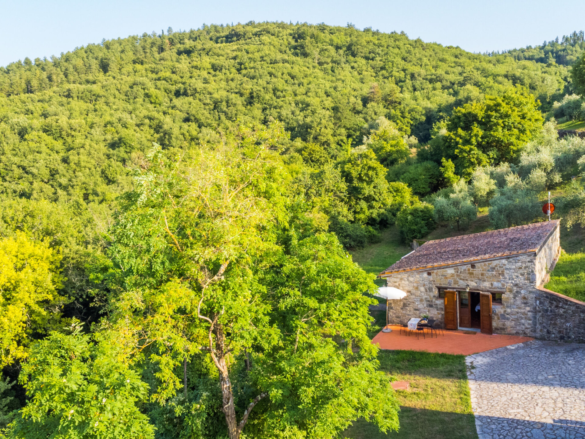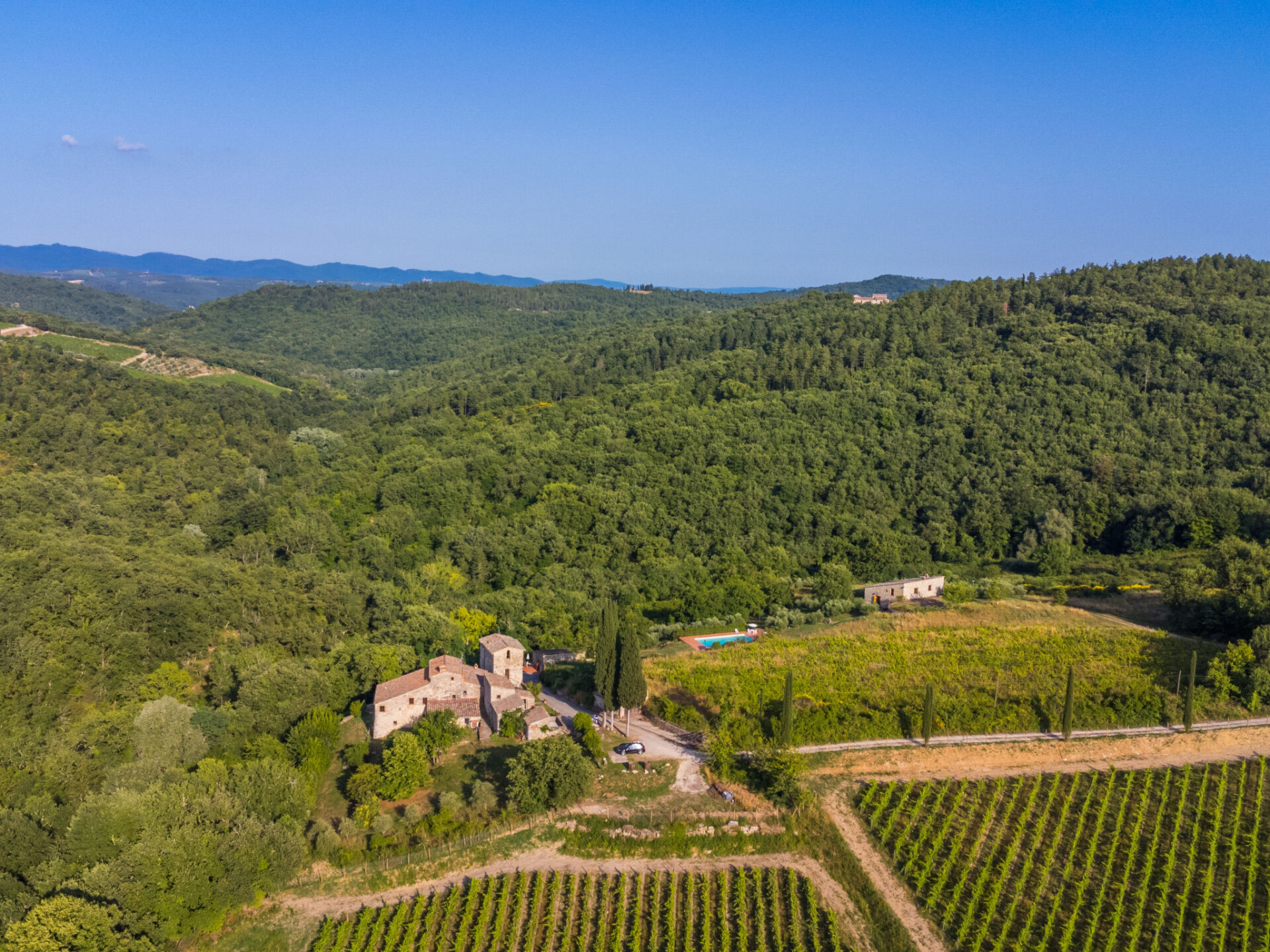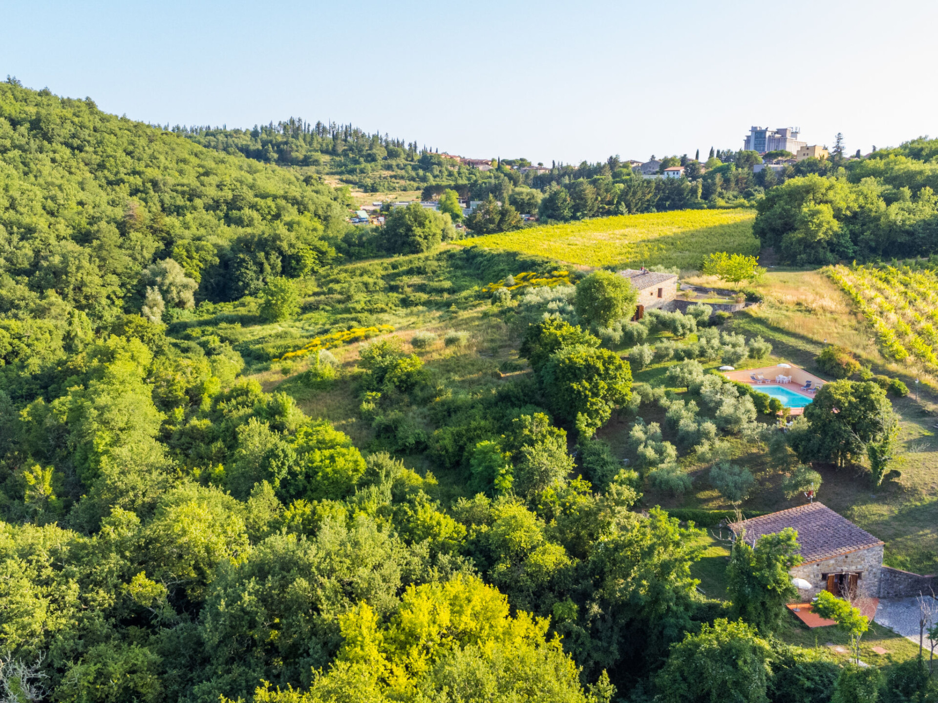 Castellina in Chisnti: Gezellig, historisch landhuis "Cerretino group house 14 sleeps", van 2 verdiepingen, omgeven door weiden, velden en wijngaarden. Huurobject bestaande uit hoofd-/ bijgebouw, 1 km van het centrum van Castellina in Chisnti, zonnige ligging, 200 m van de bosrand, te midden van groen. Voor alleengebruik: wild terrein, openluchtzwembad (6 x 12 m, 100 - 180 cm diepte, seizoensgebonden beschikbaarheid: 15.Mei. - 15.Okt.). Buitendouche, terras, tuinmeubelen, barbecue, onderhoud zwembad door de eigenaar/tuinman. In het huis: centrale verwarming, air-conditioning, wasmachine, droger. 300 m lange zeer rommelige, smalle toegangsweg tot aan het huis. Parkeerplaats bij het huis. Winkel 1 km, levensmiddelenwinkel 1 km, supermarkt 1 km, restaurant 1 km, bar 500 m, bakkerij 1 km, voetgangersgebied 1 km, bushalte 300 m, zandstrand "Cecina Mare" 88 km, thermaalbad "Rapolano Terme" 50 km. Wandelroutes 200 m vanaf het huis. Attracties in de buurt: Panzano in Chianti 13 km, Greve in Chianti 20 km, Gaiole in Chianti 20 km, Siena 26 km, San Gimignno 42 km, Firenze 50 km. Baby uitrusting (incl.). Groepen jongeren uitsluitend op aanvraag.