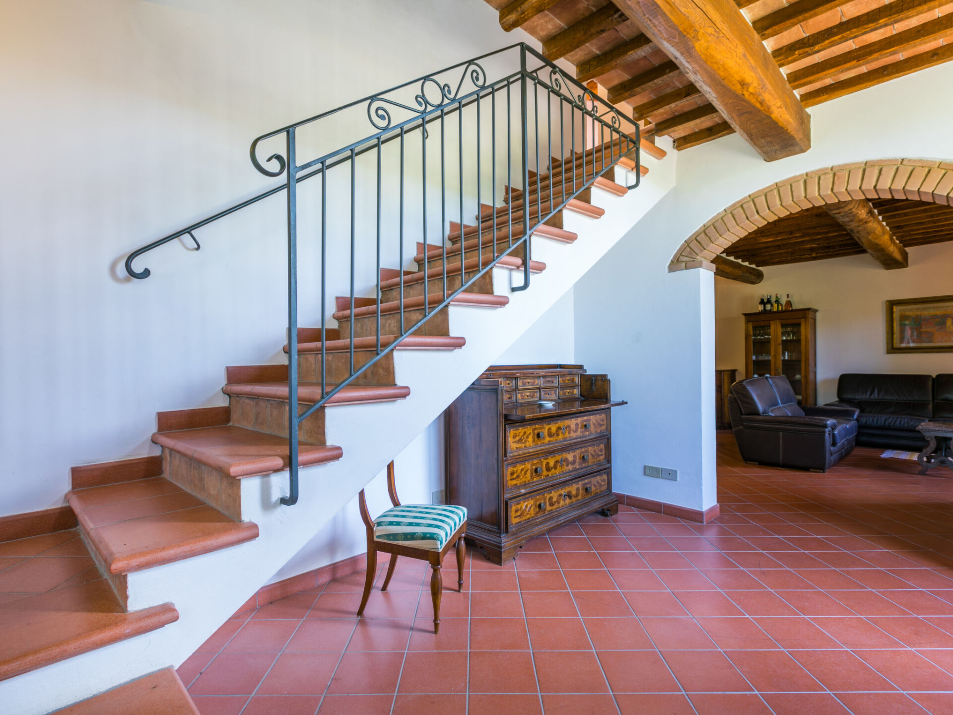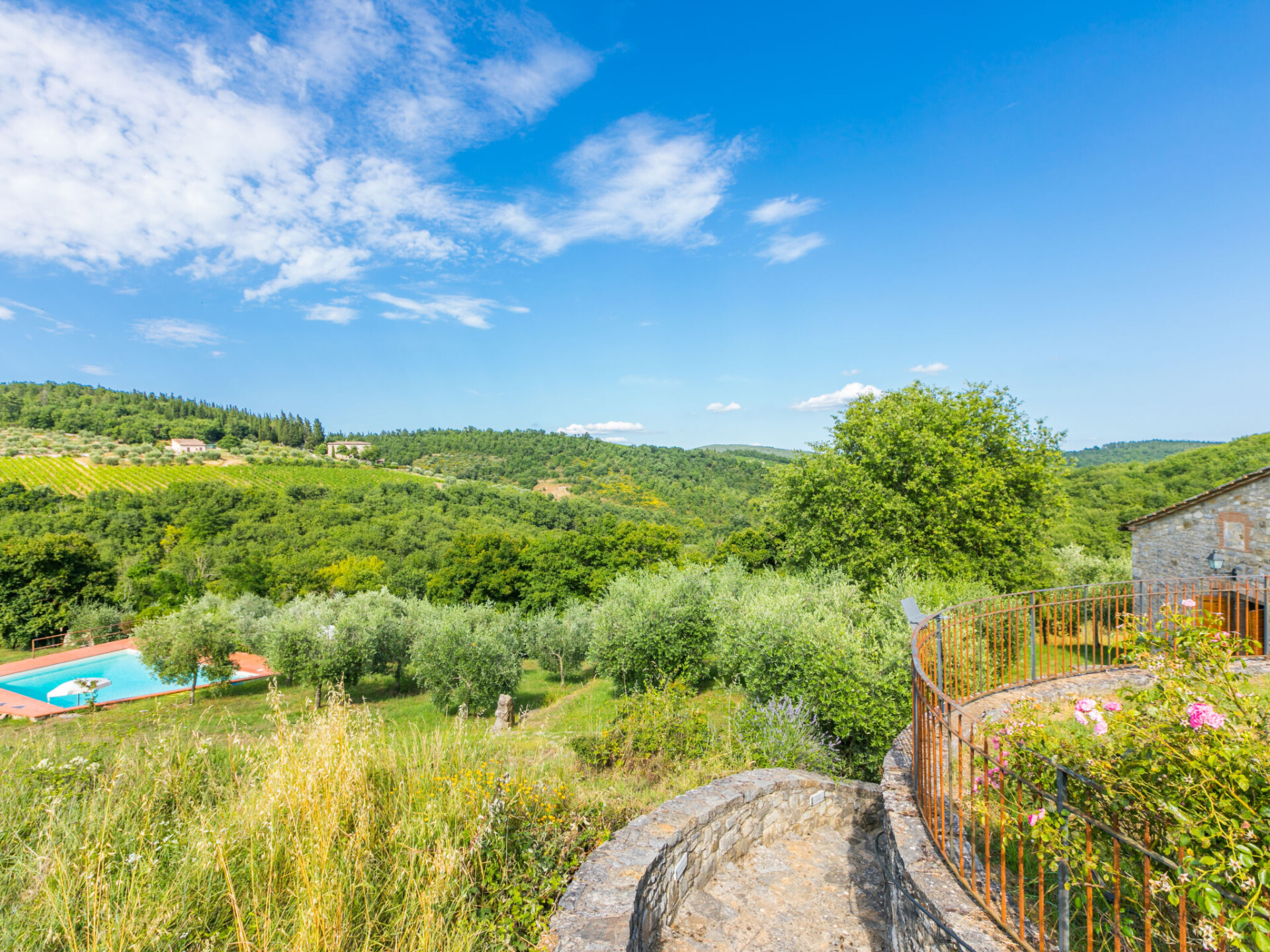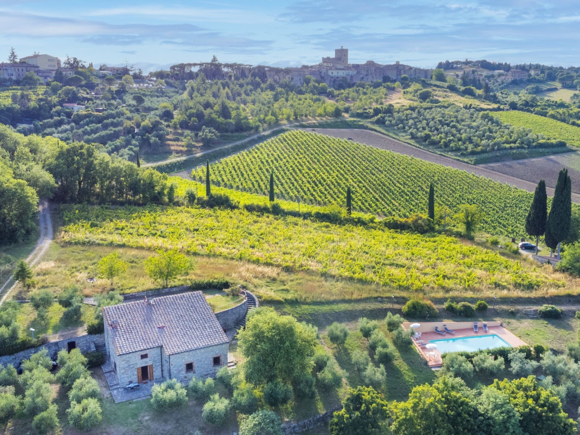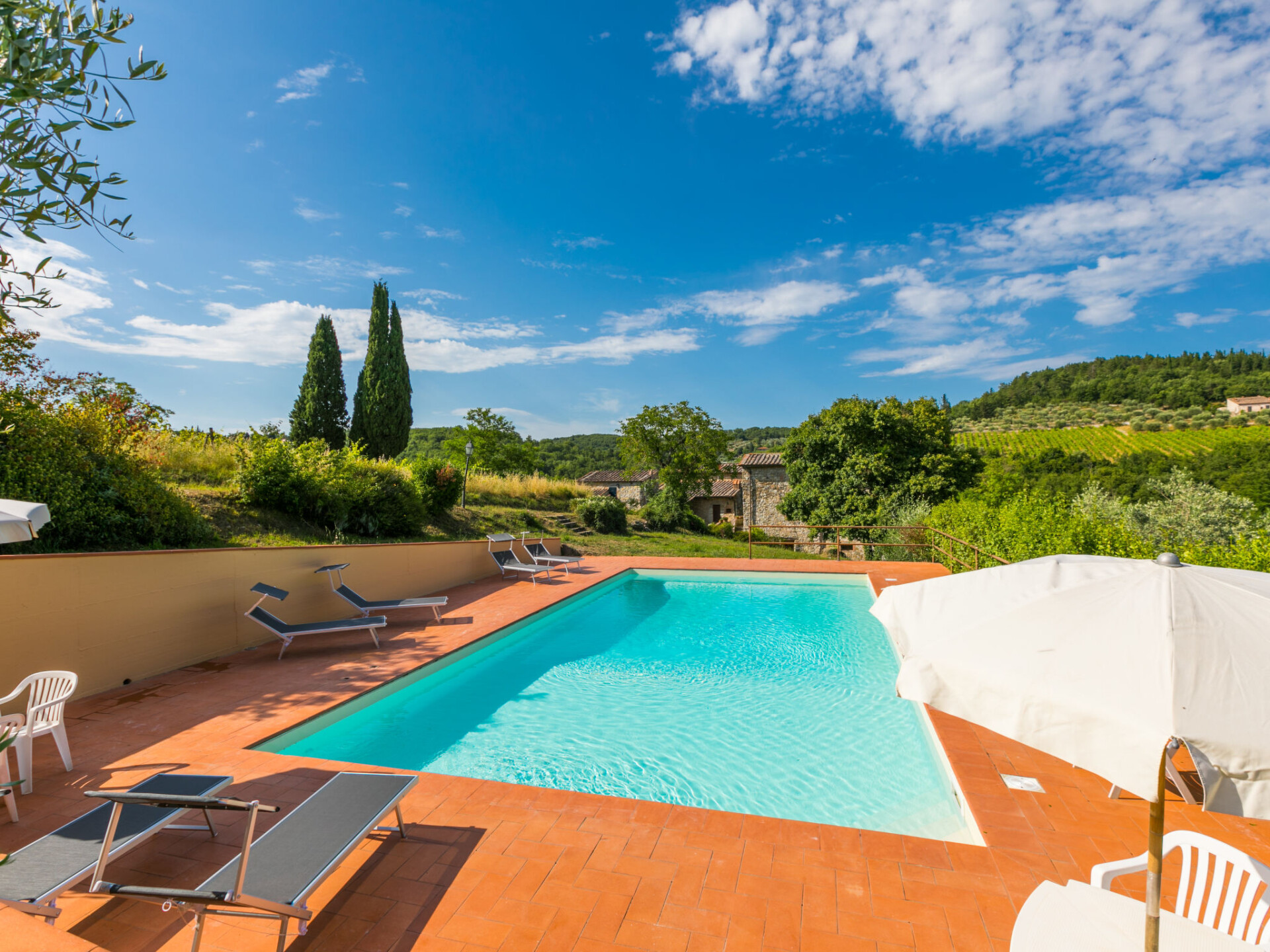 Castellina in Chianti: Gezellig, rustieke landhuis "Cerretino", omgeven door velden en wijngaarden. 3 huizen in de woning. 1 km van het centrum van Castellina in Chianti, zonnige ligging, 200 m van de bosrand, te midden van groen. Voor medegebruik: wild terrein, openluchtzwembad (6 x 12 m, 100 - 180 cm diepte, seizoensgebonden beschikbaarheid: 15.Mei. - 15.Okt.). Buitendouche, patio, terras, tuinmeubelen, onderhoud zwembad door de eigenaar/tuinman. In het huis: air-conditioning, wasmachine, droger (voor medegebruik). 300 m lange zeer rommelige, smalle toegangsweg tot aan het huis. Parkeerplaats bij het huis. Winkel 1 km, levensmiddelenwinkel 1 km, supermarkt 1 km, restaurant 1 km, bar 500 m, bakkerij 1 km, voetgangersgebied 1 km, centrum te voet bereikbaar in 15 minuten, bushalte 1 km, zandstrand "Cecina Mare" 88 km, thermaalbad "Rapolano Terme" 50 km. Wandelroutes 200 m vanaf het huis. Attracties in de buurt: Panzano in Chianti 13 km, Greve in Chianti 20 km, Gaiole in Chianti 20 km, Siena 26 km, San Gimignano 42 km, Firenze 50 km. Baby uitrusting (incl.).