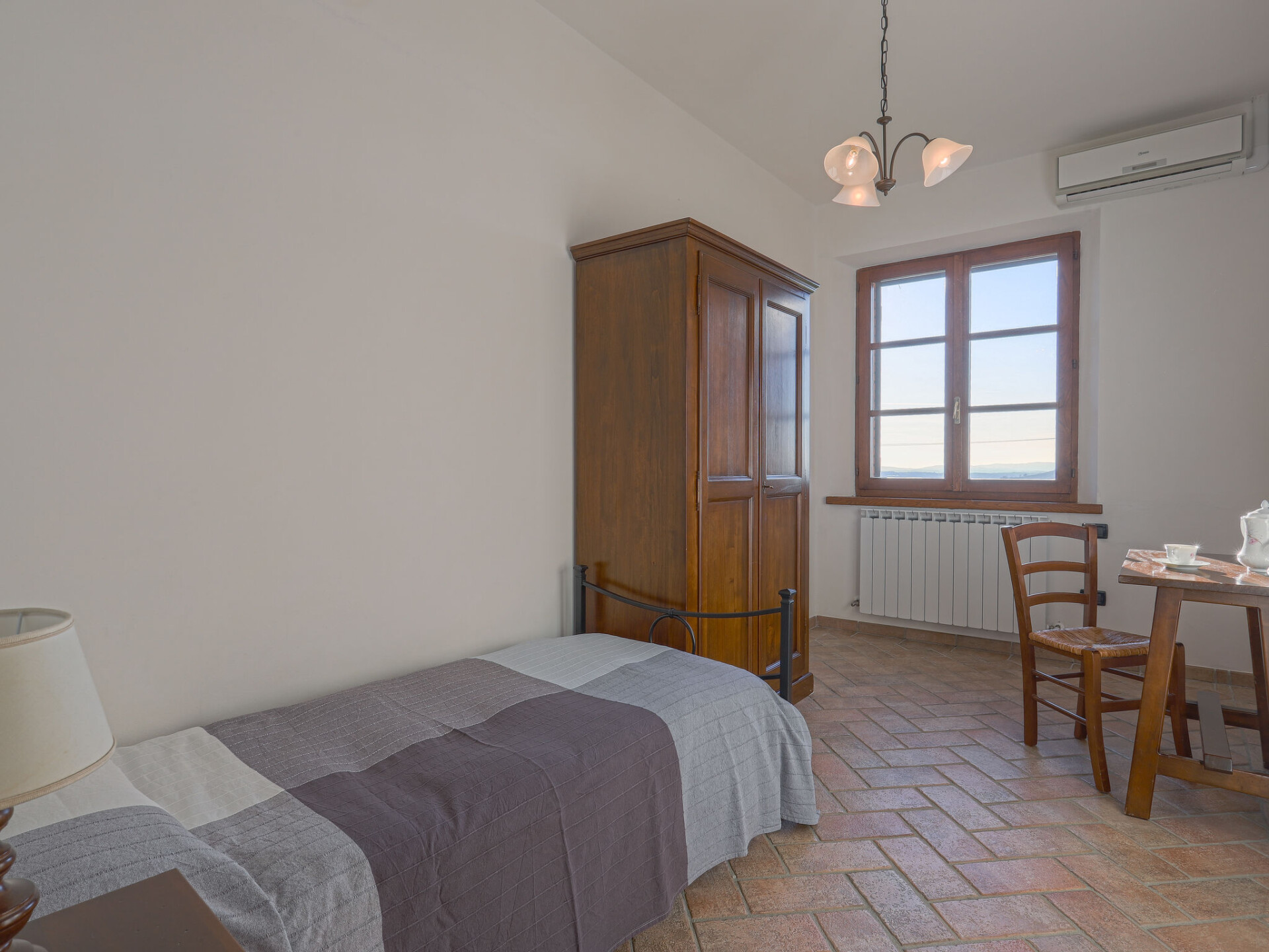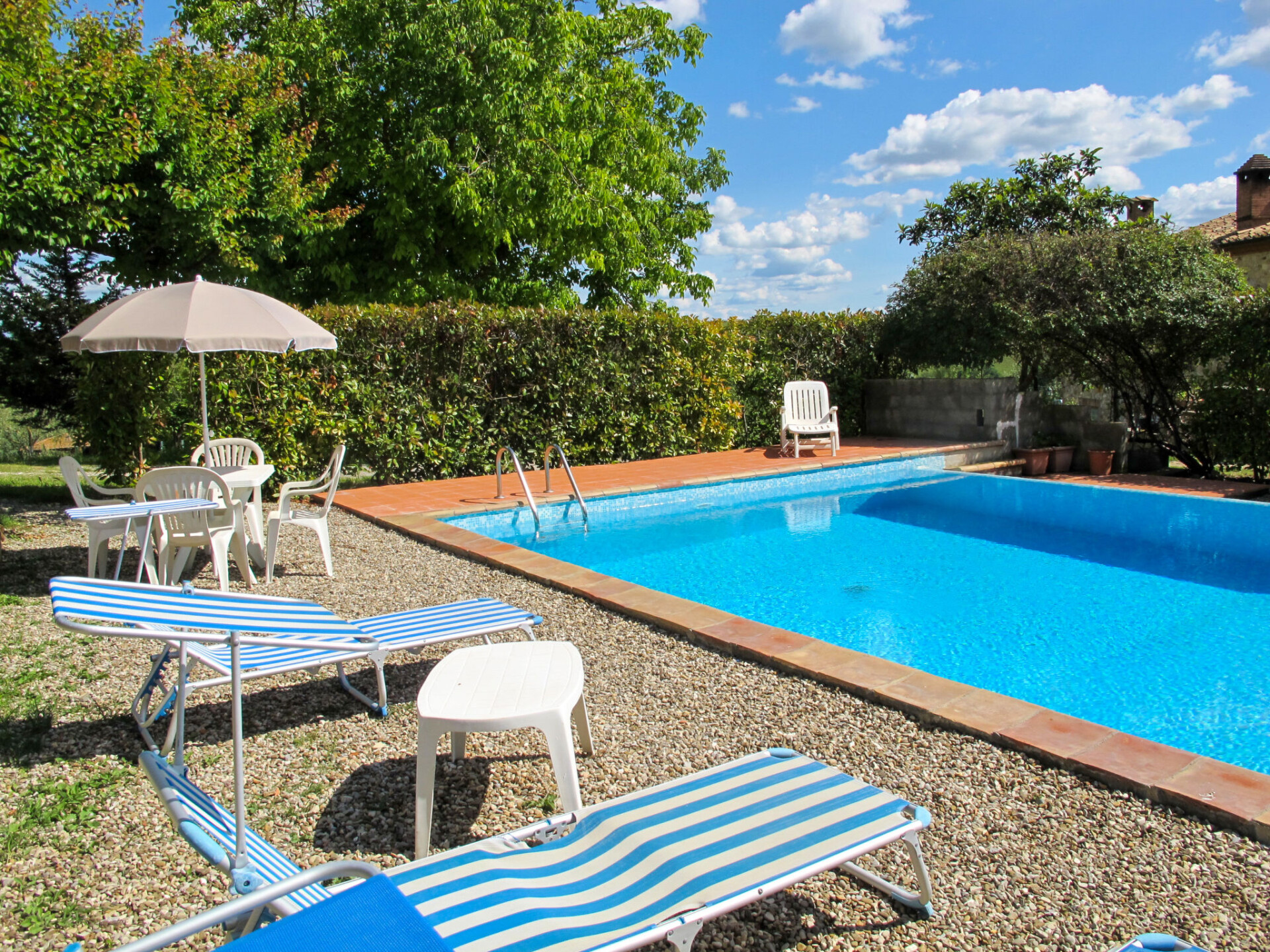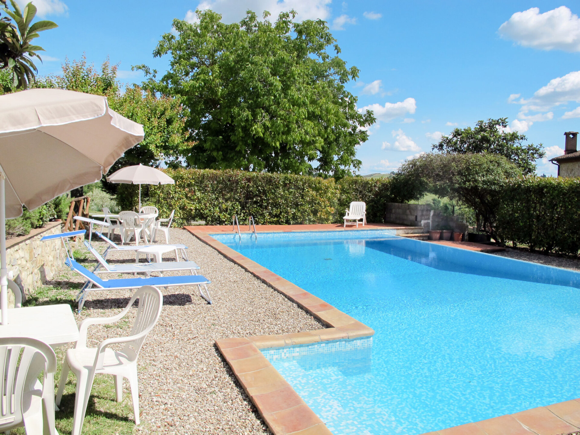 Landhuis "Cignanbianco", omgeven door velden en wijngaarden. 3 huizen in de woning. 7 appartementen in de woning. 5 km van het centrum van Castellina in Chianti, 6 km van het centrum van Castellina Scalo, 27 km van het centrum van Siena, geïsoleerde, zonnige ligging. Voor medegebruik: terrein 30 ha met planten en bomen, wilde tuin, openluchtzwembad (12 x 6 m, seizoensgebonden beschikbaarheid: 02.Mei. - 03.Okt.). Barbecue, onderhoud zwembad door de eigenaar/tuinman. In het huis: wasmachine (voor medegebruik). 1 km lange toegangsweg (onverharde weg). Parkeerplaats op het terrein. Winkel 5 km, levensmiddelenwinkel 5 km, supermarkt 5 km, restaurant 1.7 km, fietsverhuur 5 km, bushalte "Castellina Scalo" 6 km, treinstation "Castellina Scalo" 6 km, zandstrand "Cecina Mare" 83 km, overdekt zwembad 15 km. Attracties in de buurt: Moneriggioni 10 km, San Gimignano 29 km, San Galgano 50 km, Volterra 52 km, Montalcino 65 km. Baby uitrusting (incl.). Groepen jongeren uitsluitend op aanvraag. Lokale verkoop van streekproducten. De eigenaar woont op hetzelfde terrein.