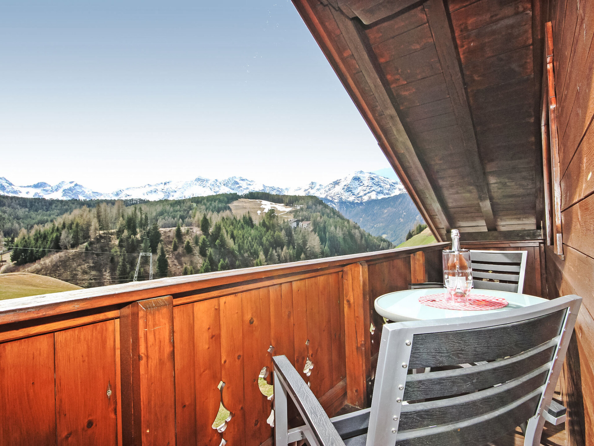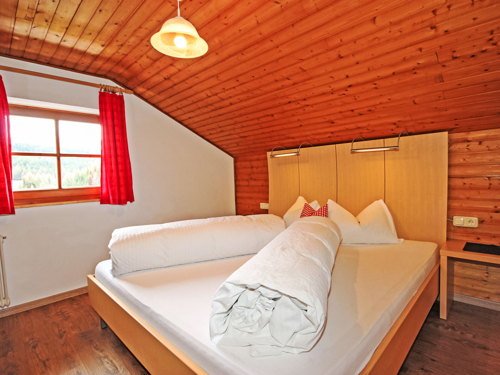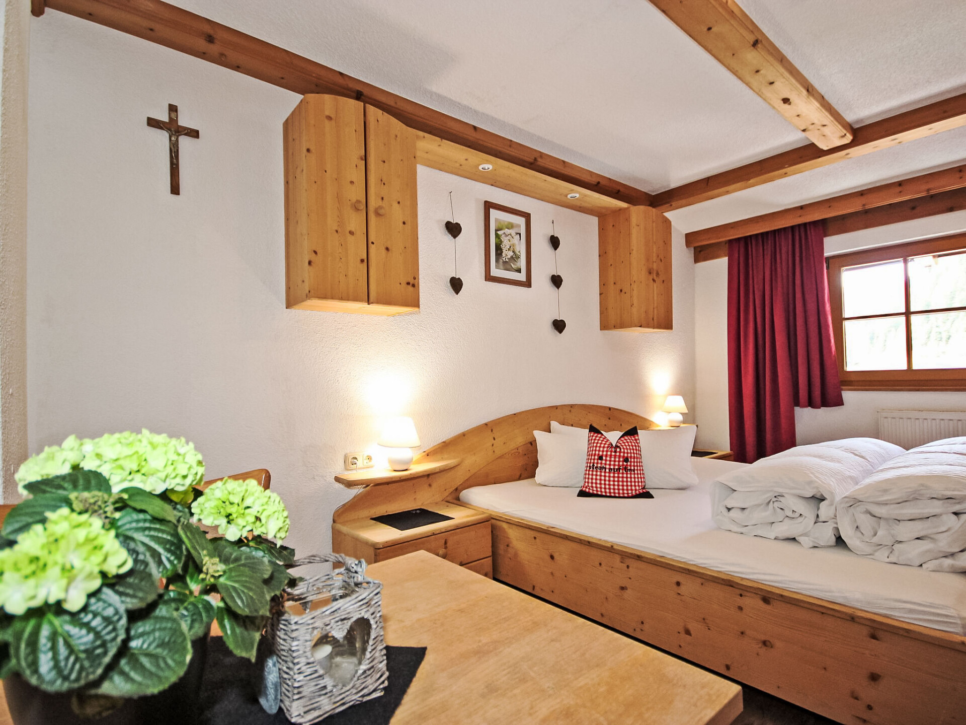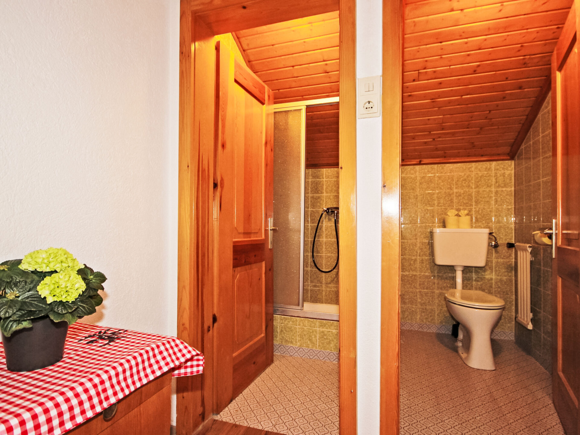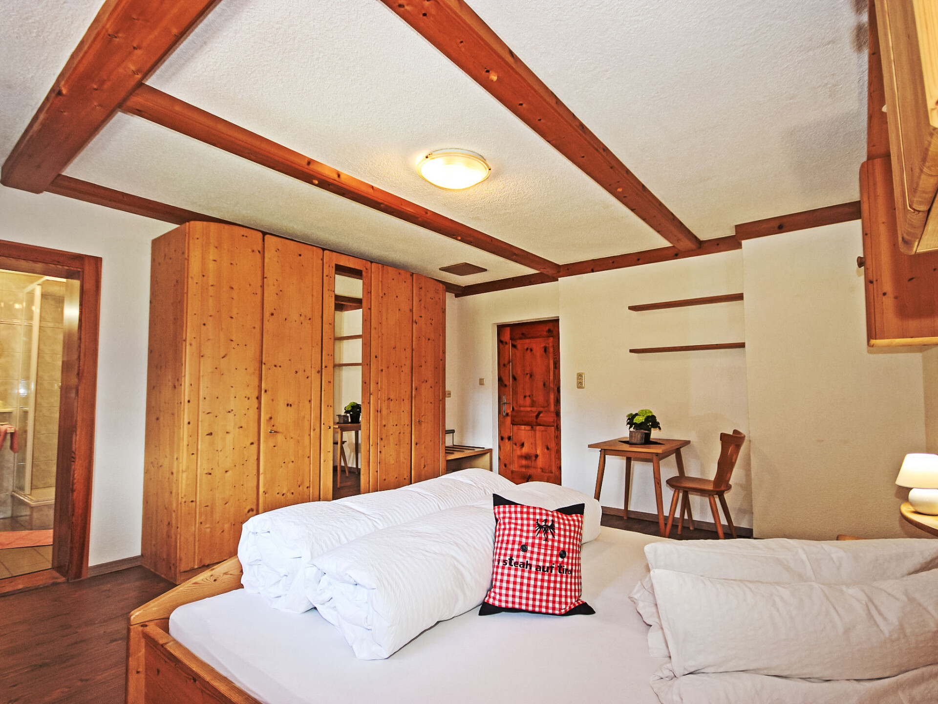 Appartement 4-kamers 130 m2, op de bovenste verdieping. Gedeeltelijk afgeschuinde daken, gezellig ingericht: hal. 1 2-pers. kamer met douche/WC. 2 kamers, elke kamer heeft 1 divanbed, 1 2-pers bed en wastafel. Doorgangskamer met 1 2-pers divanbed en Sat-TV (Flatscreen TV). Uitgang naar het balkon. Keuken (4-pits kookplaat, oven, afwasmachine, magnetron, elektrische koffiemachine, pads voor de koffiemachine (Bohnen)) met eethoek. Douche, douche/WC, aparte WC. Balkon 20 m2. Barbecue. Mooi panoramazicht op het landschap. Ter beschikking: kinderstoel, kinderbed, haardroger. Internet (WiFi, gratis). Geschikt voor families. Maximaal 1 huisdier/hond toegestaan. In plaats van een afgesloten slaapkamer bevinden sommige slaapgedeeltes zich in een open ruimte (galerij, nis, etc.).