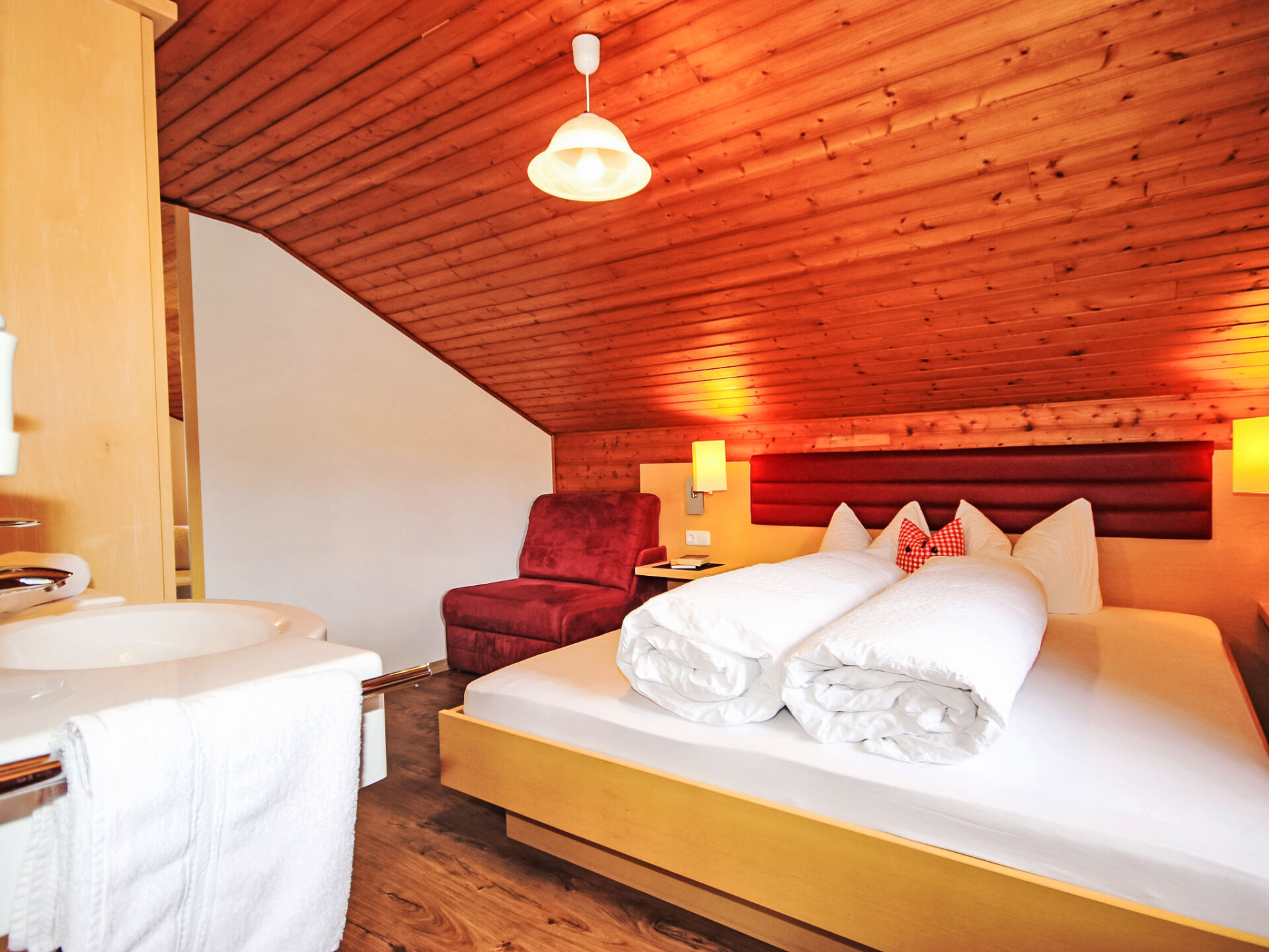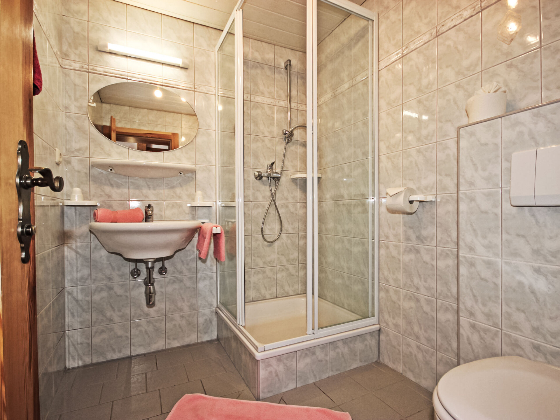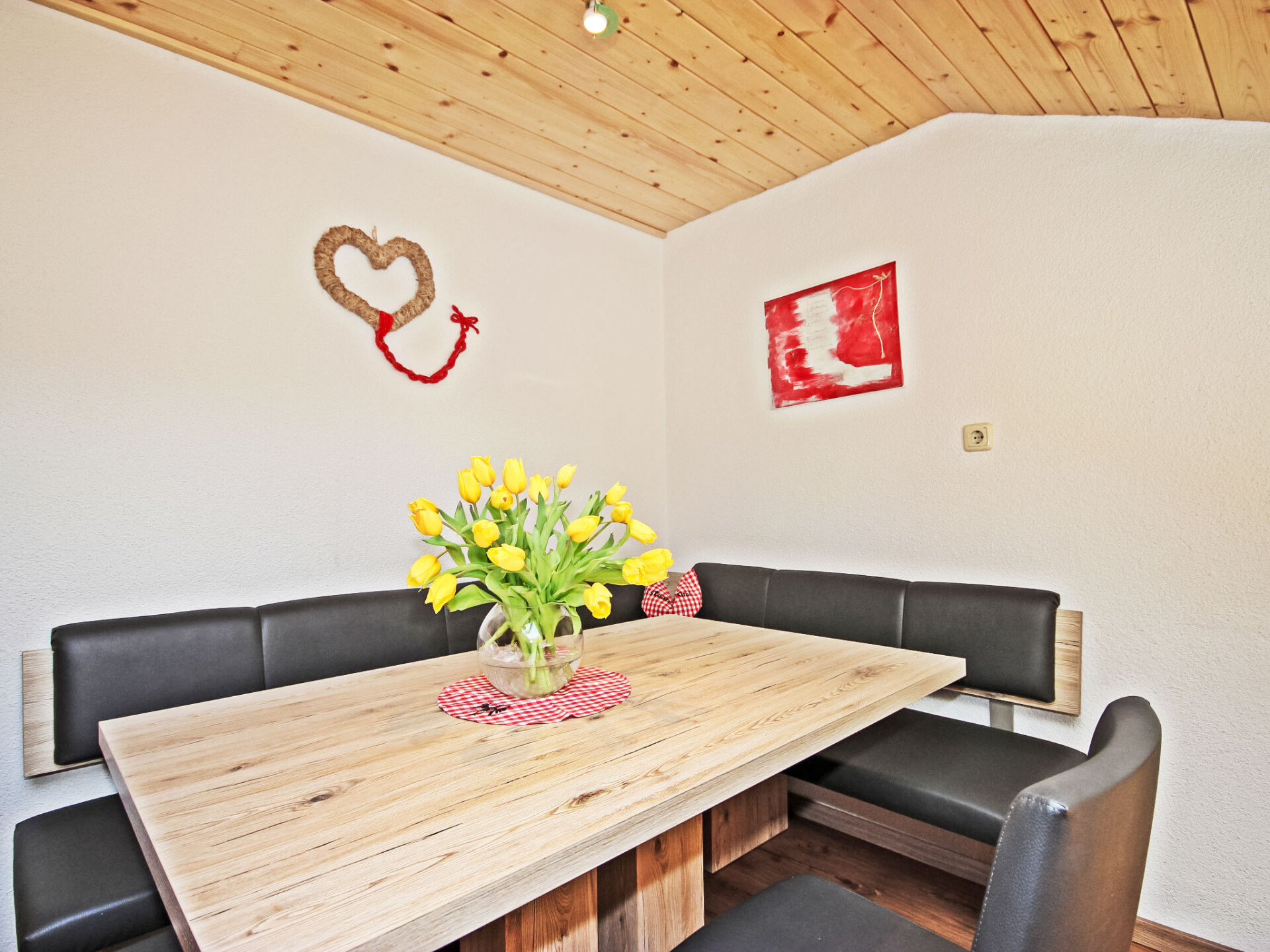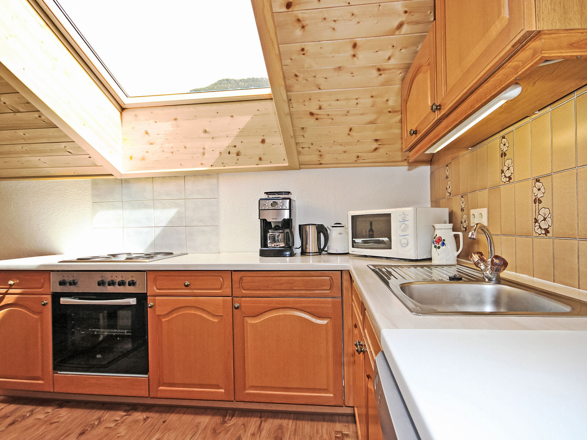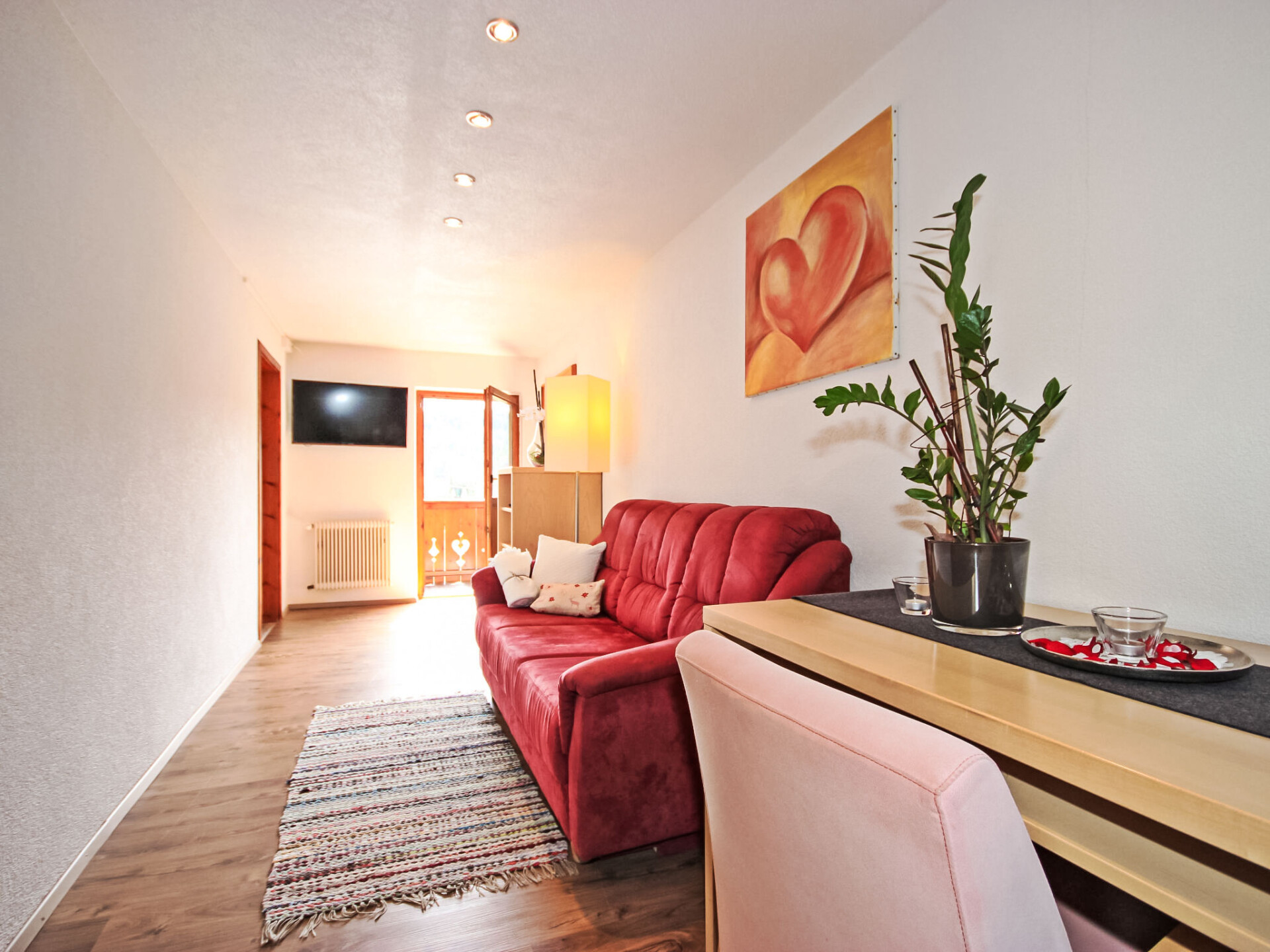 Appartement 4-kamers 130 m2, op de bovenste verdieping. Gedeeltelijk afgeschuinde daken, gezellig ingericht: hal. 1 2-pers. kamer met douche/WC. 2 kamers, elke kamer heeft 1 divanbed, 1 2-pers bed en wastafel. Doorgangskamer met 1 2-pers divanbed en Sat-TV (Flatscreen TV). Uitgang naar het balkon. Keuken (4-pits kookplaat, oven, afwasmachine, magnetron, elektrische koffiemachine, pads voor de koffiemachine (Bohnen)) met eethoek. Douche, douche/WC, aparte WC. Balkon 20 m2. Barbecue. Mooi panoramazicht op het landschap. Ter beschikking: kinderstoel, kinderbed, haardroger. Internet (WiFi, gratis). Geschikt voor families. Maximaal 1 huisdier/hond toegestaan. In plaats van een afgesloten slaapkamer bevinden sommige slaapgedeeltes zich in een open ruimte (galerij, nis, etc.).