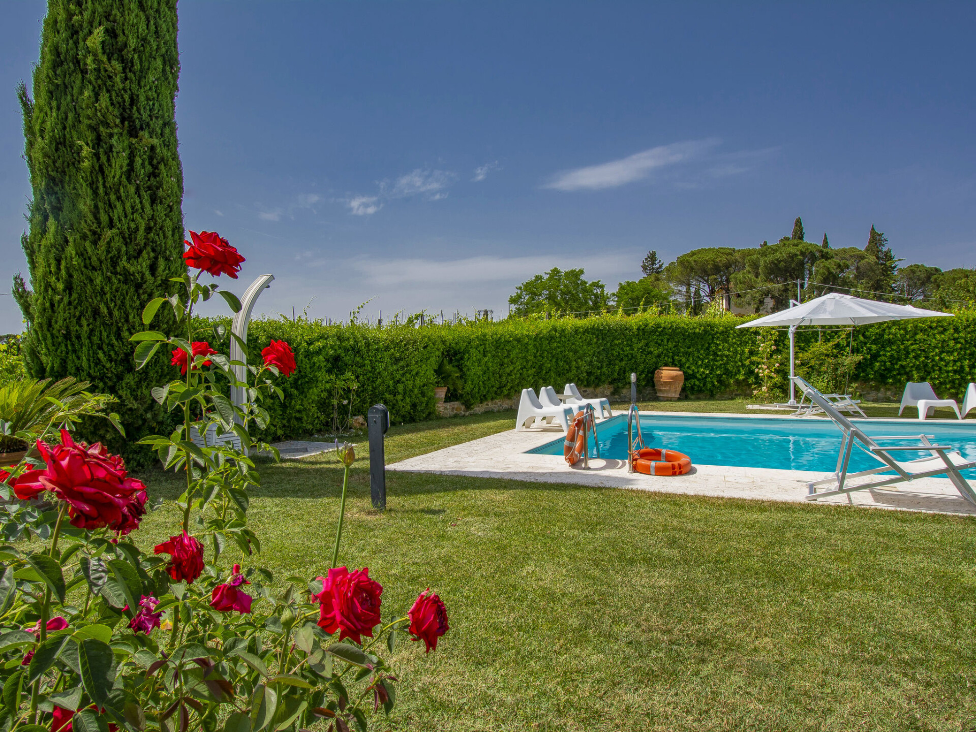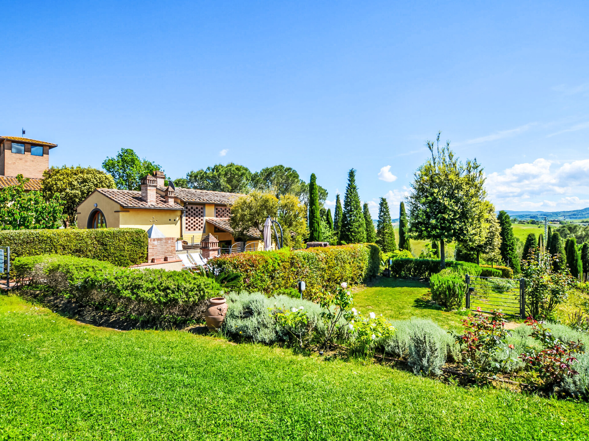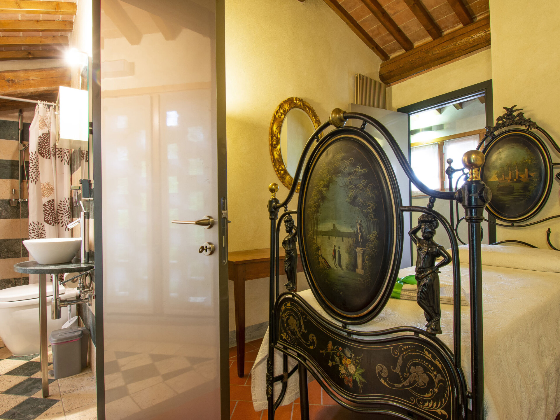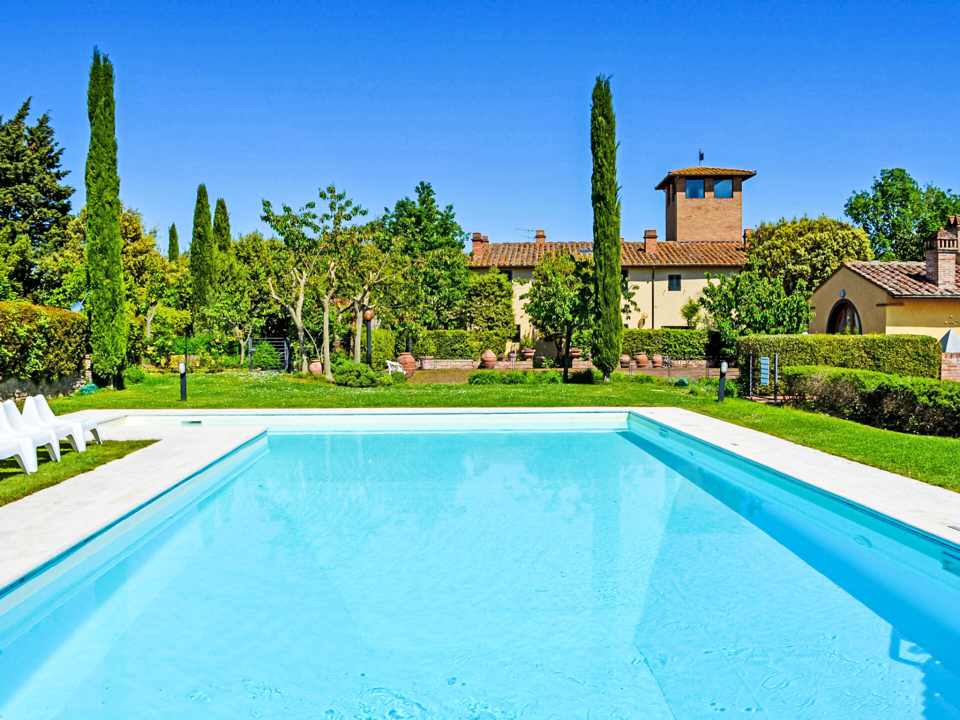 Zeer mooi, comfortabele woonboerderij "Tassinaia", van 3 verdiepingen, uit de 19e eeuw, gerenoveerd, omgeven door wijngaarden. Boven Castelfiorentino (2 km), geïsoleerde, rustige, zonnige ligging op een heuvel, perfecte locatie: in het centrum en toch rustig gelegen. Voor medegebruik: terrein 2 ha (omheind), mooie tuin ter ontspanning. Voor alleengebruik: verzorgde tuin op verschillende niveaus met gazon en bloemen, openluchtzwembad (12 x 6 m, 145 - 300 cm diepte, seizoensgebonden beschikbaarheid: 08.Mei. - 16.Okt.). Buitendouche, terras, tuinmeubelen, barbecue. In het huis: Internet (WiFi), centrale verwarming, alarmsysteem, wasmachine, verwarming alleen beschikbaar van 01.Nov. - 14.Apr.. Wissel van linnengoed 1 maal per week. Kok op verzoek (extra). Parkeerplaats bij het huis. Winkel 2 km, supermarkt 1 km, restaurant 2 km, bushalte 4 km, treinstation "Castelfiorentino" 2 km. Golfterrein 15 km, tennis 1 km, manege 2 km. Attracties in de buurt: Firenze 40 km, Volterra 30 km, Siena 55 km. De eigenaar woont op hetzelfde terrein.