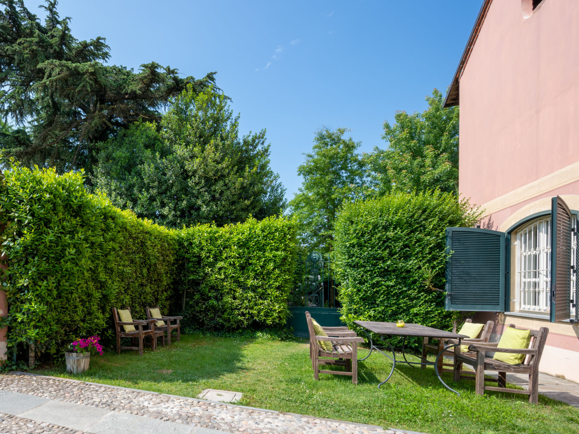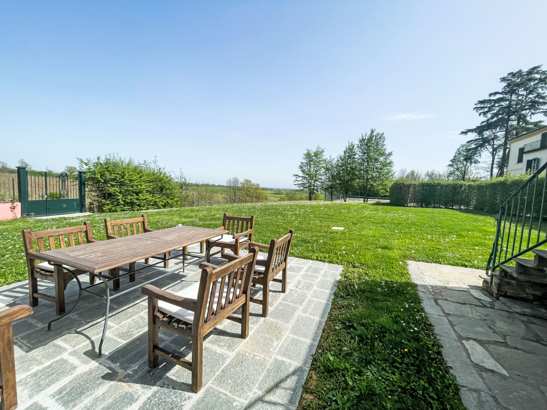 Zeer mooi landhuis "Villa Remotti", uit de 19e eeuw, omgeven door weiden, velden en wijngaarden. Huurobject bestaande uit hoofd-/ bijgebouw, 28 km van het centrum van Asti, aan de rand van de plaats, 2 km van het centrum van Fubine, 16 km van het centrum van Alessandria, rustige, zonnige, verhoogde ligging. Voor medegebruik: terrein 14 ha, openluchtzwembad (10 x 4 m, 130 cm diepte, seizoensgebonden beschikbaarheid: 01.Mei. - 24.Okt.). Buitendouche, tafeltennis. Voor alleengebruik: terrein 1.000 m2 (omheind), tuin met gazon. 300 m lange toegangsweg (onverharde weg). Parkeerplaats bij het huis op het terrein. Supermarkt 2 km, bushalte 2 km, treinstation "Alessandria" 16 km. Golfterrein (36 holes) 3 km. Attracties in de buurt: Asti 29 km, Alba 35 km, Turin 80 km. Auto noodzakelijk. Eigenaar woont in apart huisgedeelte.