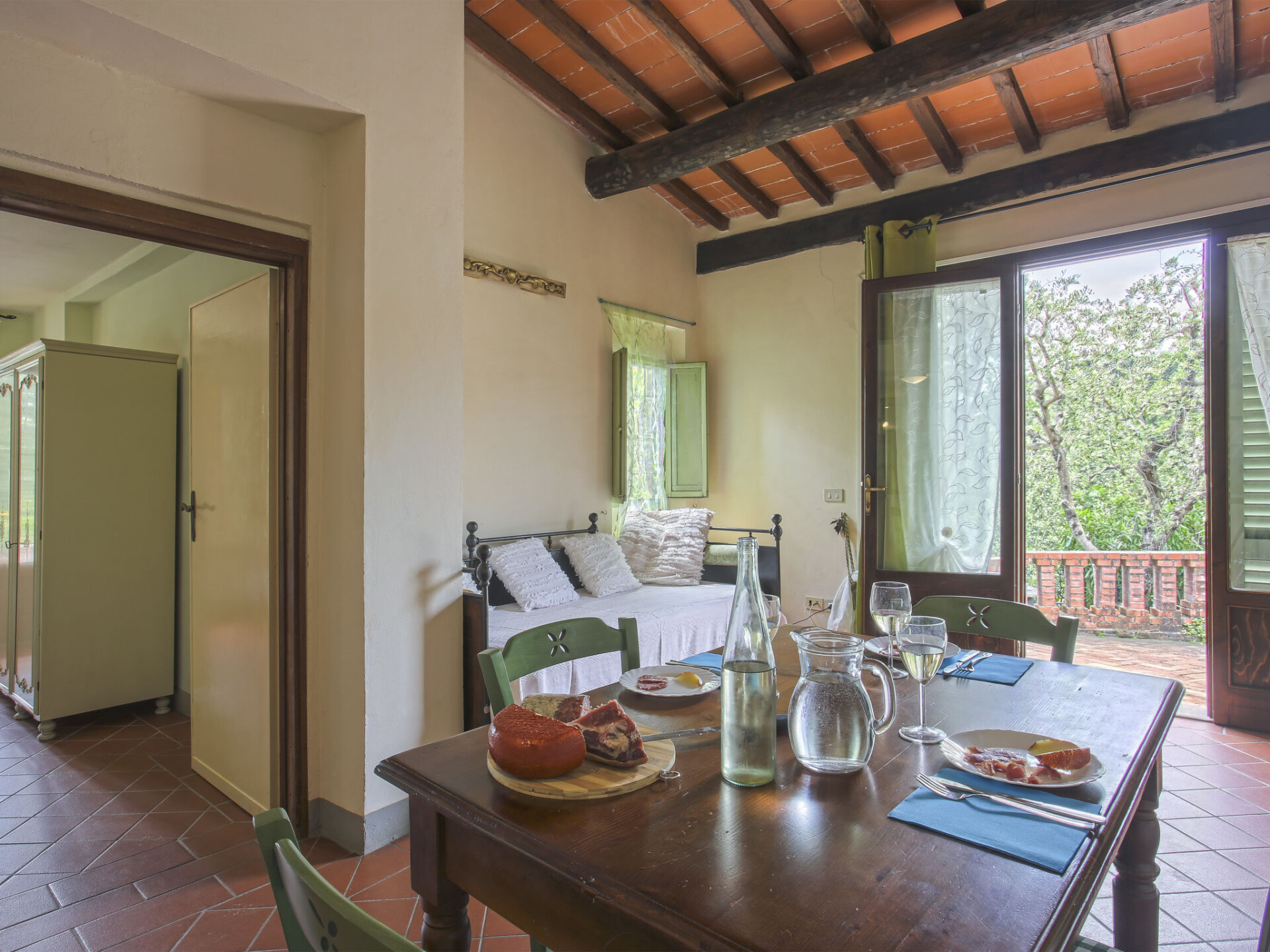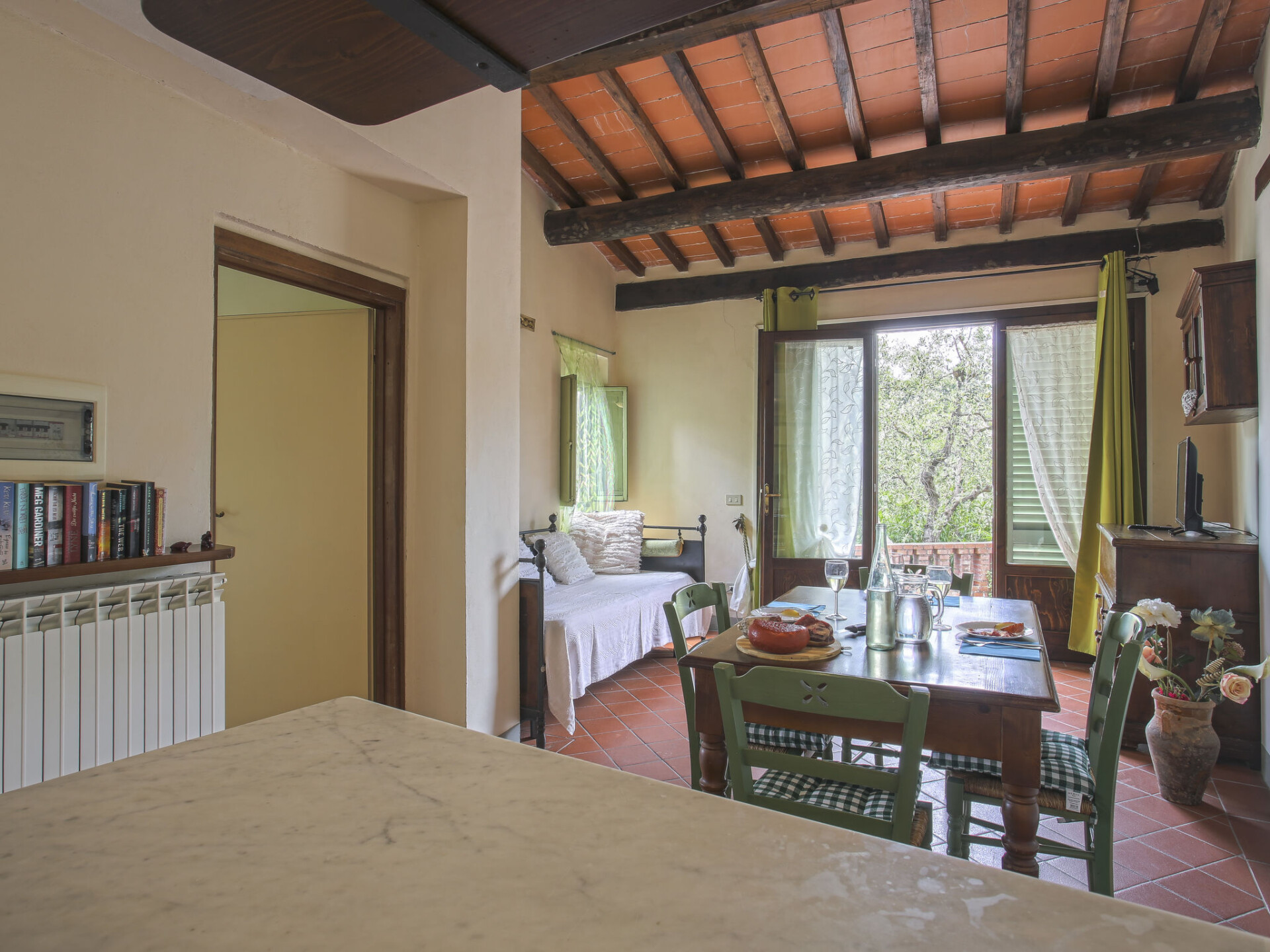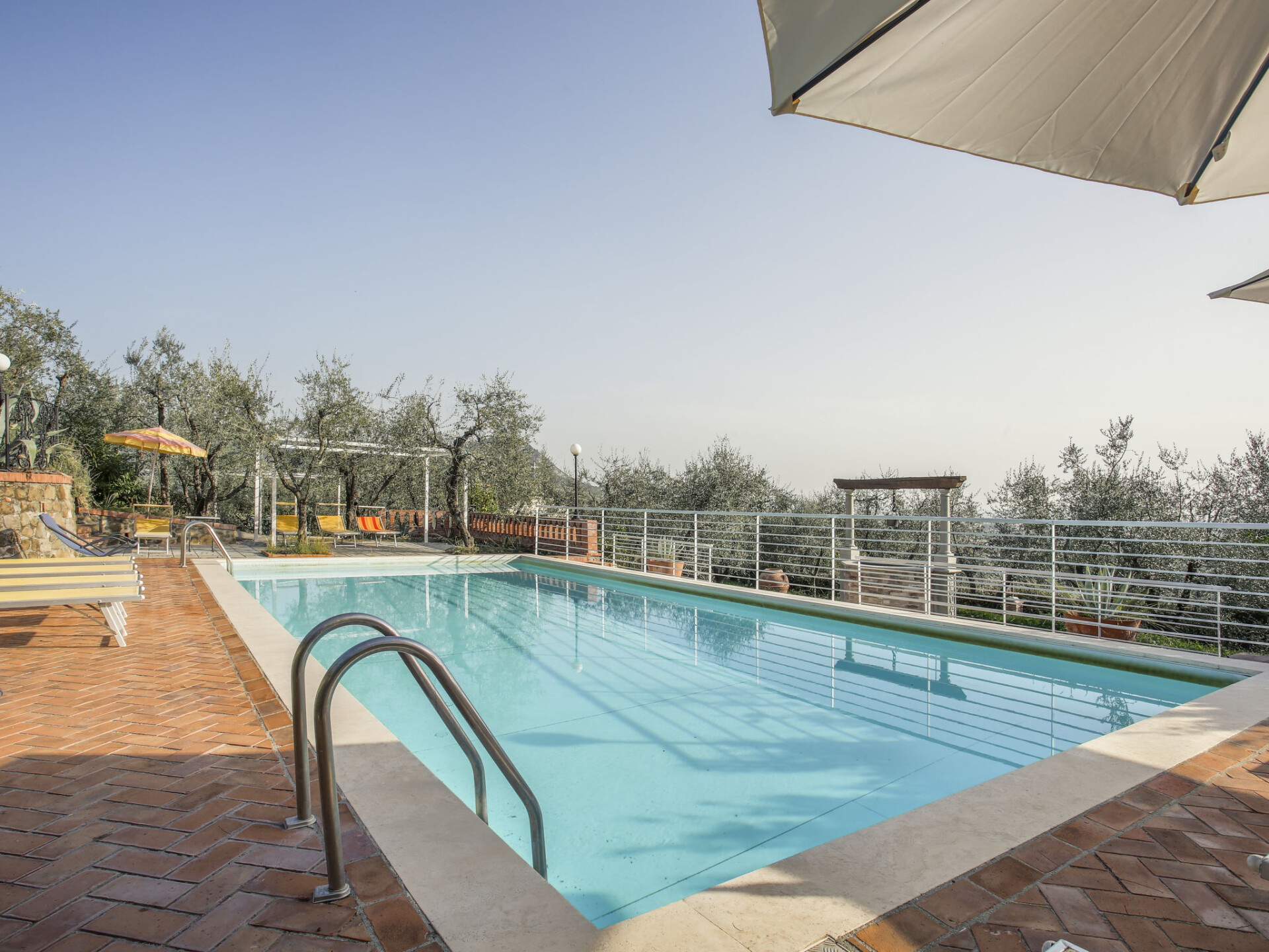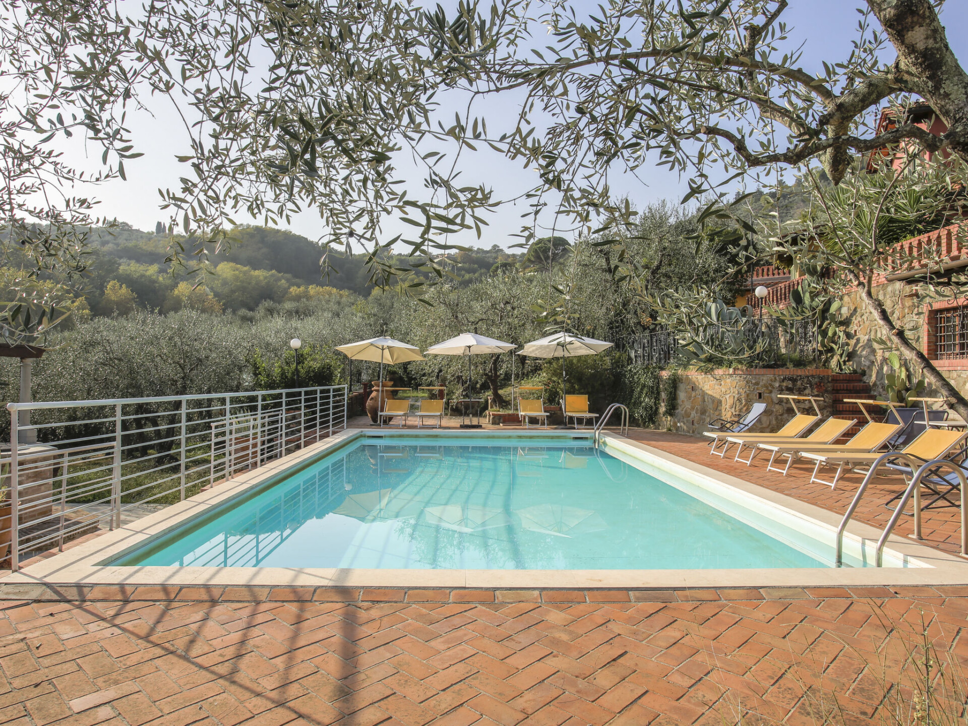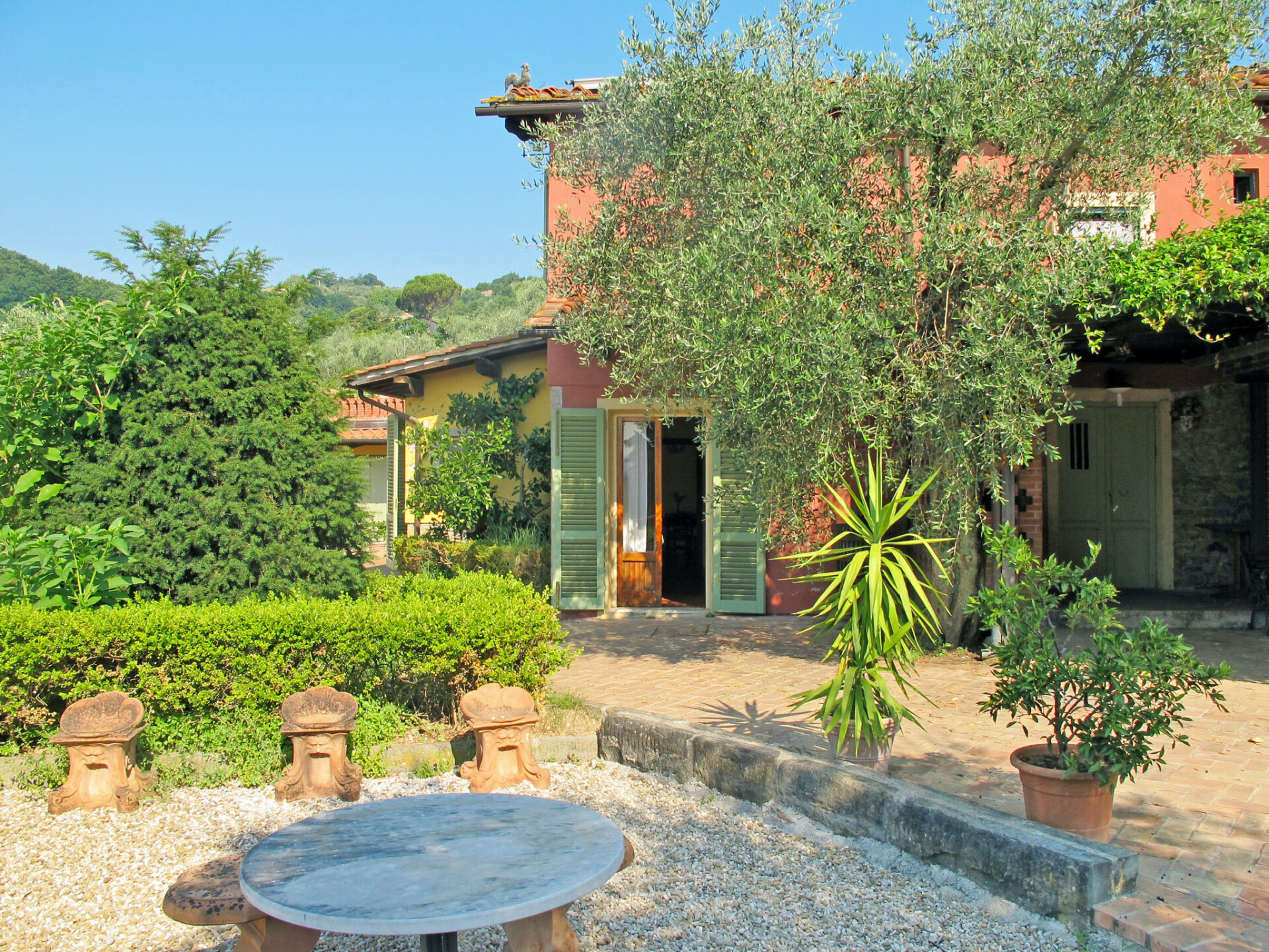 Mooi, rustieke agriturismo "Borgo della Limonaia", 130 m boven zeeniveau, omgeven door bomen en velden. 4 huizen in de woning. 7 appartementen in de woning. 4 km van het centrum van Montecatini Terme, 30 km van het centrum van Lucca, 50 km van het centrum van Firenze, geïsoleerde, zonnige ligging tegen een helling, 55 km van zee, te midden van groen. Voor medegebruik: terrein 6 ha, mooie tuin op verschillende niveaus met planten en bomen, openluchtzwembad (11 x 6 m, 120 - 160 cm diepte, seizoensgebonden beschikbaarheid: 25.Apr. - 15.Okt.). Buitendouche, patio, terras, tuinmeubelen, kinderspeelplaats, onderhoud zwembad door de eigenaar/tuinman. In het complex: sauna, stoombad, hot tub (alles extra), tafeltennis (alles incl.), tafelvoetbal, wasmachine (voor medegebruik, extra). 200 m lange smalle toegangsweg tot aan het huis. Parkeerplaats op 200 m op het terrein. Levensmiddelenwinkel 600 m, supermarkt 1.5 km, bushalte 3 km, treinstation "Montecatini Terme" 4 km, zandstrand "Lido di Camaiore" 55 km. Golfterrein (18 holes) 10 km. Lokale verkoop van streekproducten.