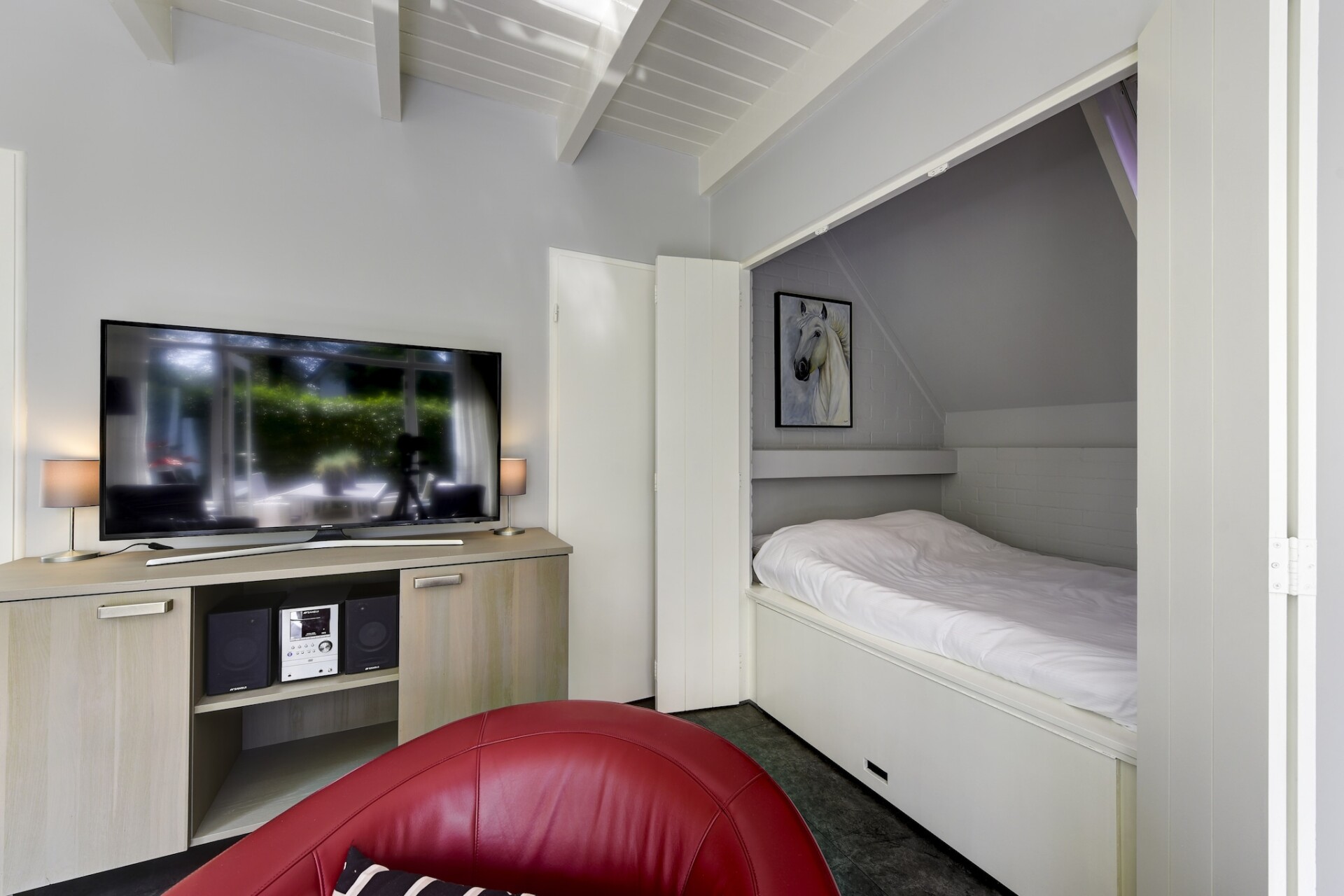 Verscholen tussen hoge, ruisende bomen biedt dit knusse, vrijstaande vakantiehuis de perfecte plek voor stellen of individuele reizigers die op zoek zijn naar rust en eenvoud. Binnen vindt u een warme en goed ontworpen ruimte met een unieke tweepersoons bedstee, een moderne keuken met een combimagnetron en vaatwasser, en een comfortabele zithoek met een tv en stereo voor ontspannen avonden. Het privéterras, omgeven door groen, nodigt u uit om te ontspannen met uw ochtendkoffie of een glas wijn bij zonsondergang.