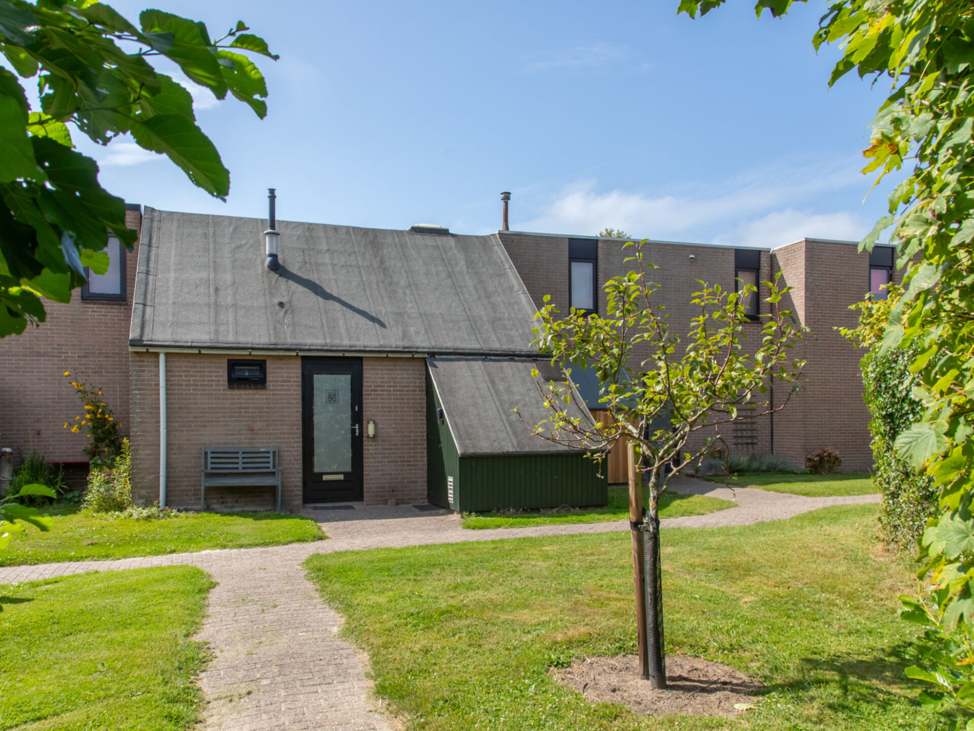 "Buitenplaats Schouwen nr 86", huis in een rij 4-kamers 68 m2 op 2 verdiepingen, op het zuiden gelegen. Open woon-/eetkamer met TV en internationale TV-zenders. Uitgang naar de tuin, naar het terras. Kleine keuken (Gasfornuis, 4 kookpitten (vlammen), waterkoker, magnetron, diepvriezer, elektrische koffiemachine). Douche/WC. Verwarming. Bovenverdieping: 1 open kamer met afgeschuinde daken met 1 2-pers bed (180 cm, lengte 200 cm). 2 kamers met afgeschuinde daken, elke kamer heeft 1 bed (90 cm, lengte 200 cm). Natuurstenen vloeren. Comfortabele inrichting in landelijke stijl. Ligstoelen (4). Mooi uitzicht op de tuin. Ter beschikking: Internet (WiFi, gratis). Maximaal 2 huisdieren/honden toegestaan.