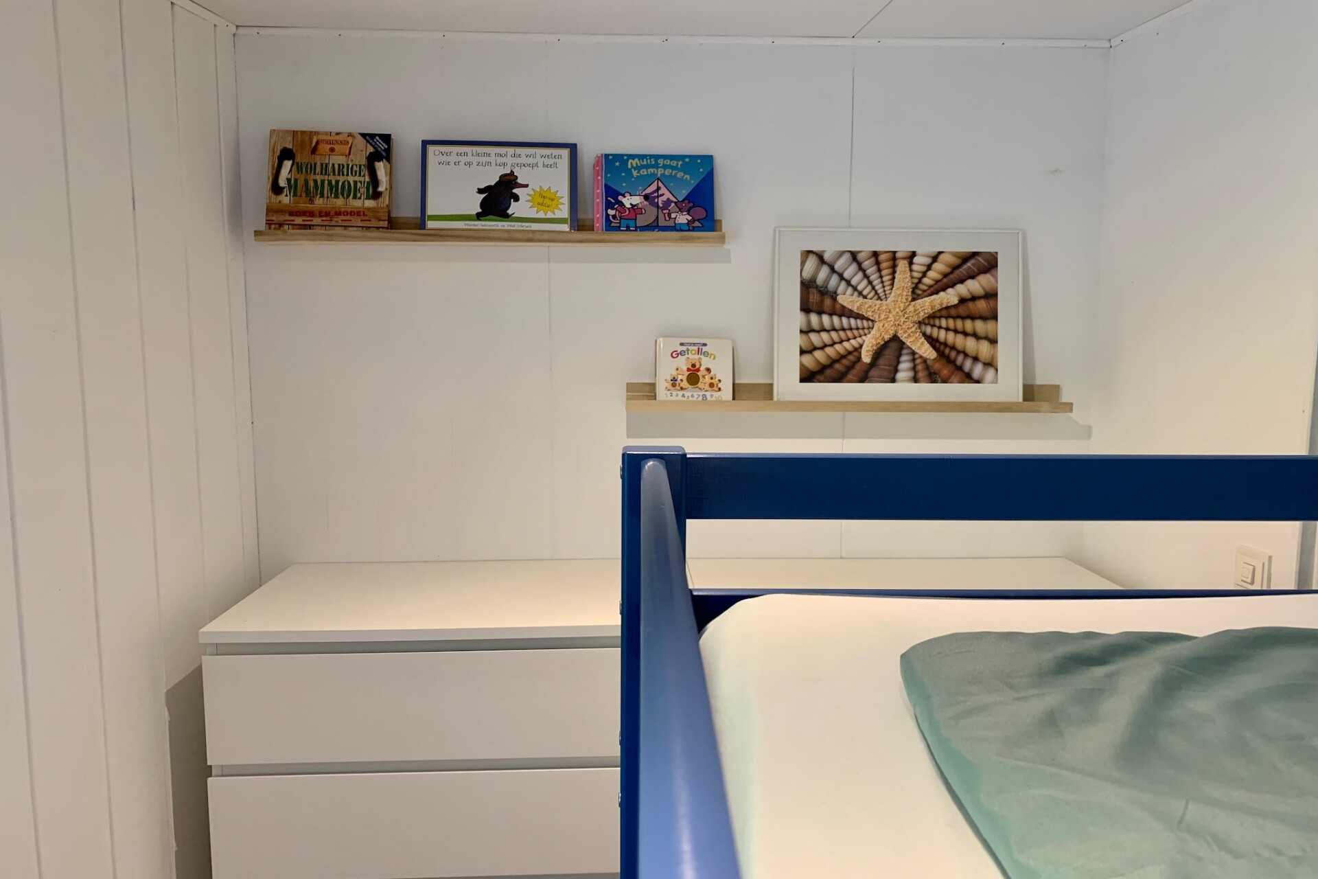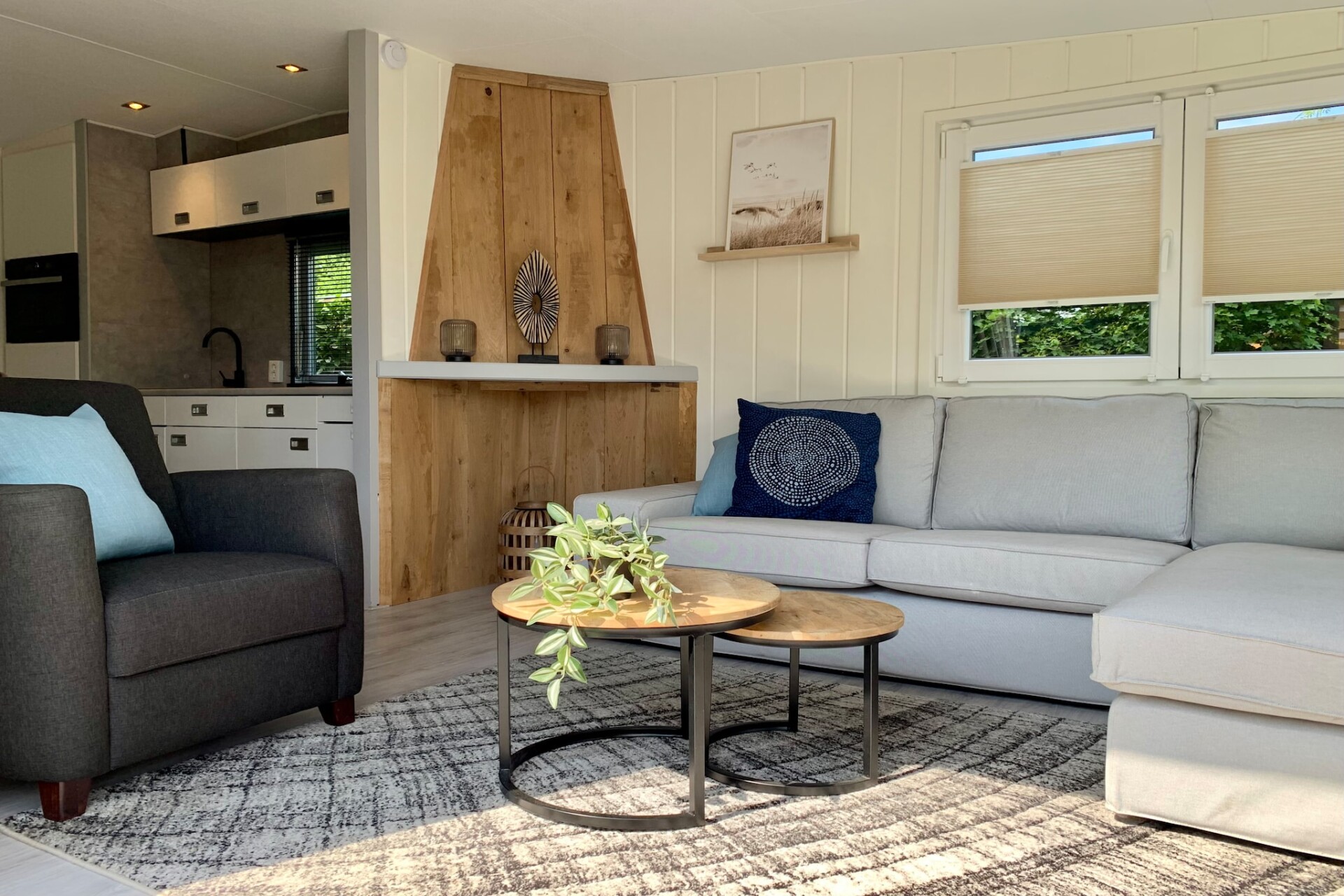 De lichte woonkamer is voorzien van een laminaatvloer, een gezellige zithoek met een driezitsbank en fauteuil en biedt uitzicht op de tuin. Er is een tv met Nederlandse en Duitse zenders, een persoonlijke wifi-verbinding en een elektrische kachel voor de koelere avonden. De open keuken is volledig uitgerust met een gasfornuis, combimagnetron, koelkast met vriezer, waterkoker, broodrooster, blender en Nespresso-apparaat. Het chalet beschikt over twee slaapkamers: één met een groot tweepersoonsbed (180x210 cm) en de andere met een stapelbed, ideaal voor gezinnen met twee kinderen.