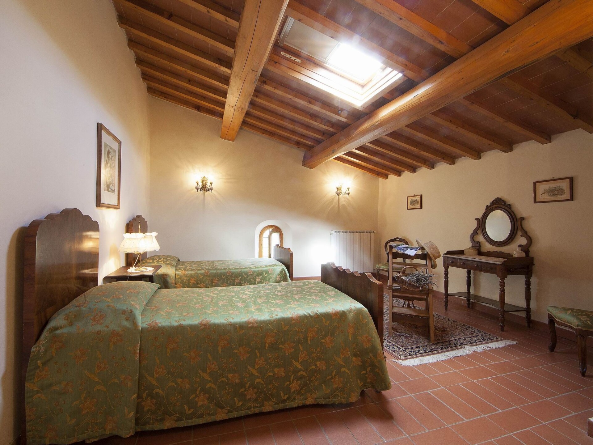 Holiday flat situated in the old village where the restaurant is located, about 500 metres from the farmhouse and the swimming pool.Spacious and lovely holiday flat measuring 80 square metres on the ground floor, arranged on two levels. It sleeps five. One double room with four-poster bed, one double room with two single beds and one single room. Kitchen-living room. Bathroom with shower. Private terrace. Air conditioning.This beautiful winery and holiday resort overlooks a beautiful landscape of vineyards, olive groves, wheat fields and cypress forests typical of Tuscany, particularly the Florentine hills of Montespertoli.The 15th century farm covers 500 hectares and produces 6 different types of wine and olive oil. For this reason, this property recreates all the characteristics of the Tuscan countryside and offers an ideal location for a completely relaxing holiday.We have 16 flats distributed in several renovated old barns and cottages. 2 flats are in the farmhouse next to the swimming pool (14x7, open from May to October), 10 are in the small hamlet where the restaurant is located, 500 metres from the pool. Another 4 flats are located in another farmhouse 200 metres from the restaurant and the swimming pool. The flats are furnished with particular attention to guests' comfort.The farmhouse organises wine tastings and visits to the wine cellar. On the estate, guests will also find a small museum of period carriages. The location is ideal for visiting most of the art centres such as Florence, Pisa, Lucca, Siena, San Gimignano and Volterra.At guests' disposal barbecue, Wi-Fi Internet connection, washing machine, children's playground.Distances: nearest shops Montespertoli 5 km, Florence 25 km, Certaldo 20 km, San Gimignano 35 km, Pisa 65 km, Siena 70 km. IT048030B54NKYYEYJ