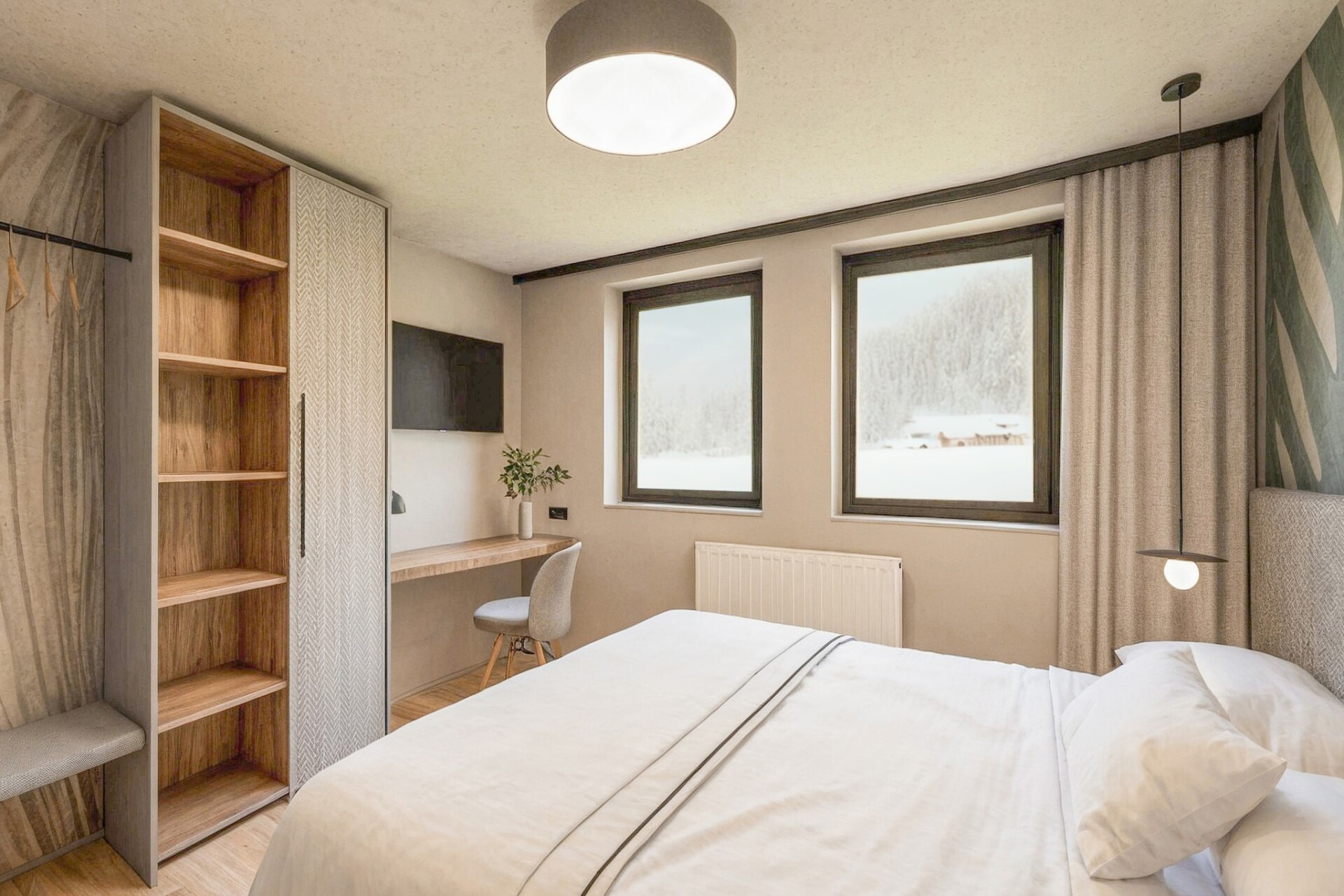 Het appartement biedt op 25 tot 49 m² ruimte voor maximaal 4 personen. Het tweepersoonsbed is gedeeltelijk visueel gescheiden van de woonkamer. Sommige units hebben een open badkamer en een apart toilet. In de woonkamer biedt een 120-140 cm brede slaapbank slaapgelegenheid voor maximaal twee kinderen. Het balkon nodigt uit tot ontspanning. De keuken is volledig uitgerust.