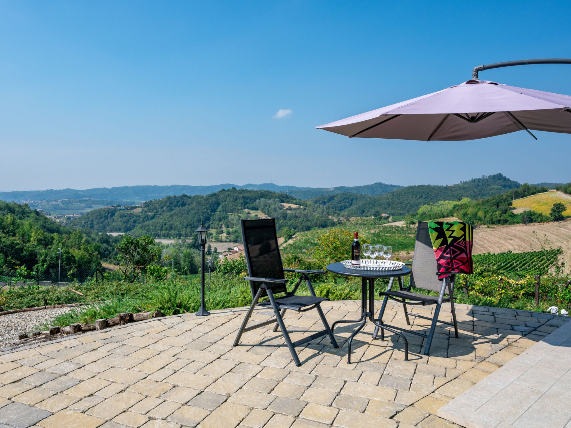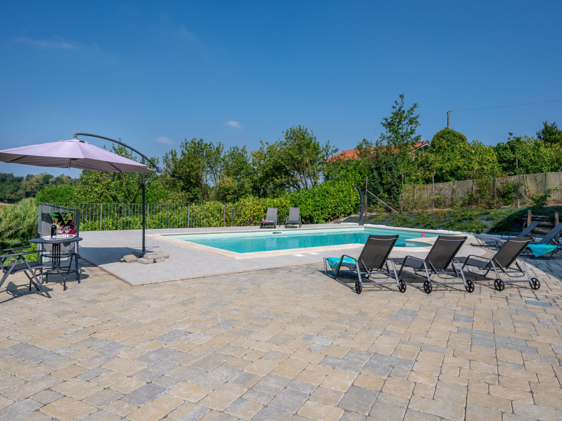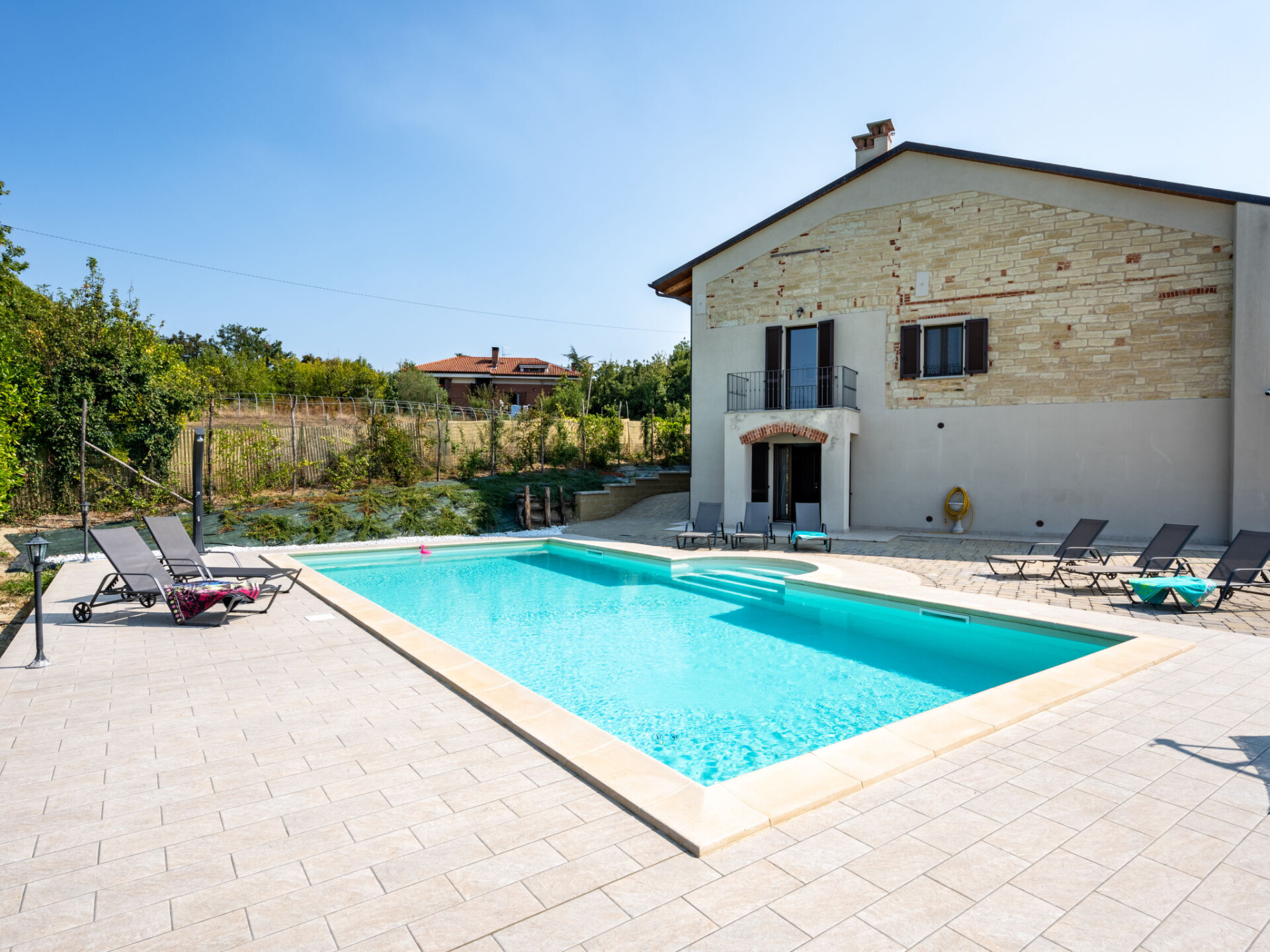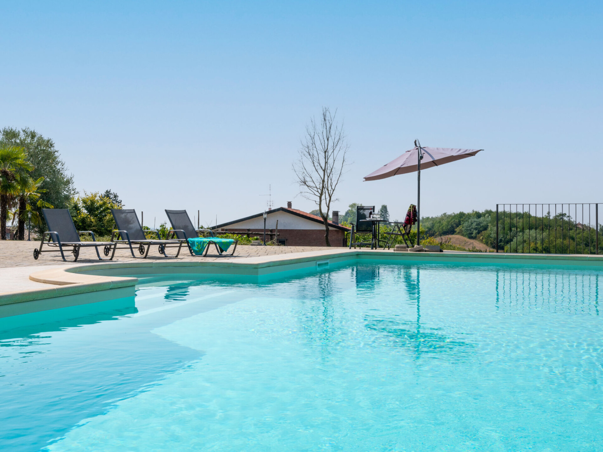 Zeer comfortabele cottage "Chiara", 385 m boven zeeniveau, vrijstaand, omgeven door weiden en velden. 5 km van het centrum van Moncalvo, aan de rand van de plaats, 200 m van het centrum van Ponzano Monferrato, 25 km van het centrum van Asti, rustige, zonnige, verhoogde ligging op een heuvel, te midden van groen. Voor alleengebruik: terrein 2.000 m2 (omheind), verzorgde tuin met planten en bomen, binnenplaats, openluchtzwembad (10 x 5 m, 150 cm diepte, seizoensgebonden beschikbaarheid: 01.Mei. - 03.Okt.) met oprolbaar afdekscherm. Buitendouche, tuinmeubelen, parkeerplaats bij het huis op het terrein. Supermarkt 4 km, bushalte 2.5 km, treinstation "Casale Monferrato" 22 km. Golfterrein (36 holes) 27 km. Auto noodzakelijk. Niet geschikt voor kinderen onder 21 jaar. Groepen jongeren uitsluitend op aanvraag.
