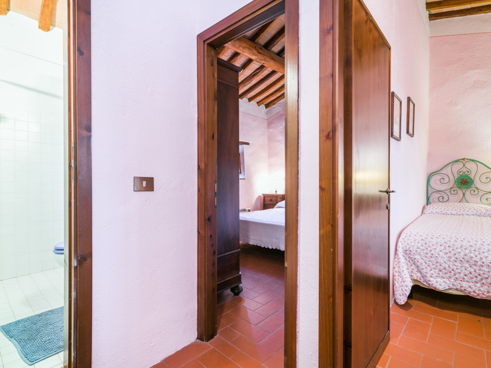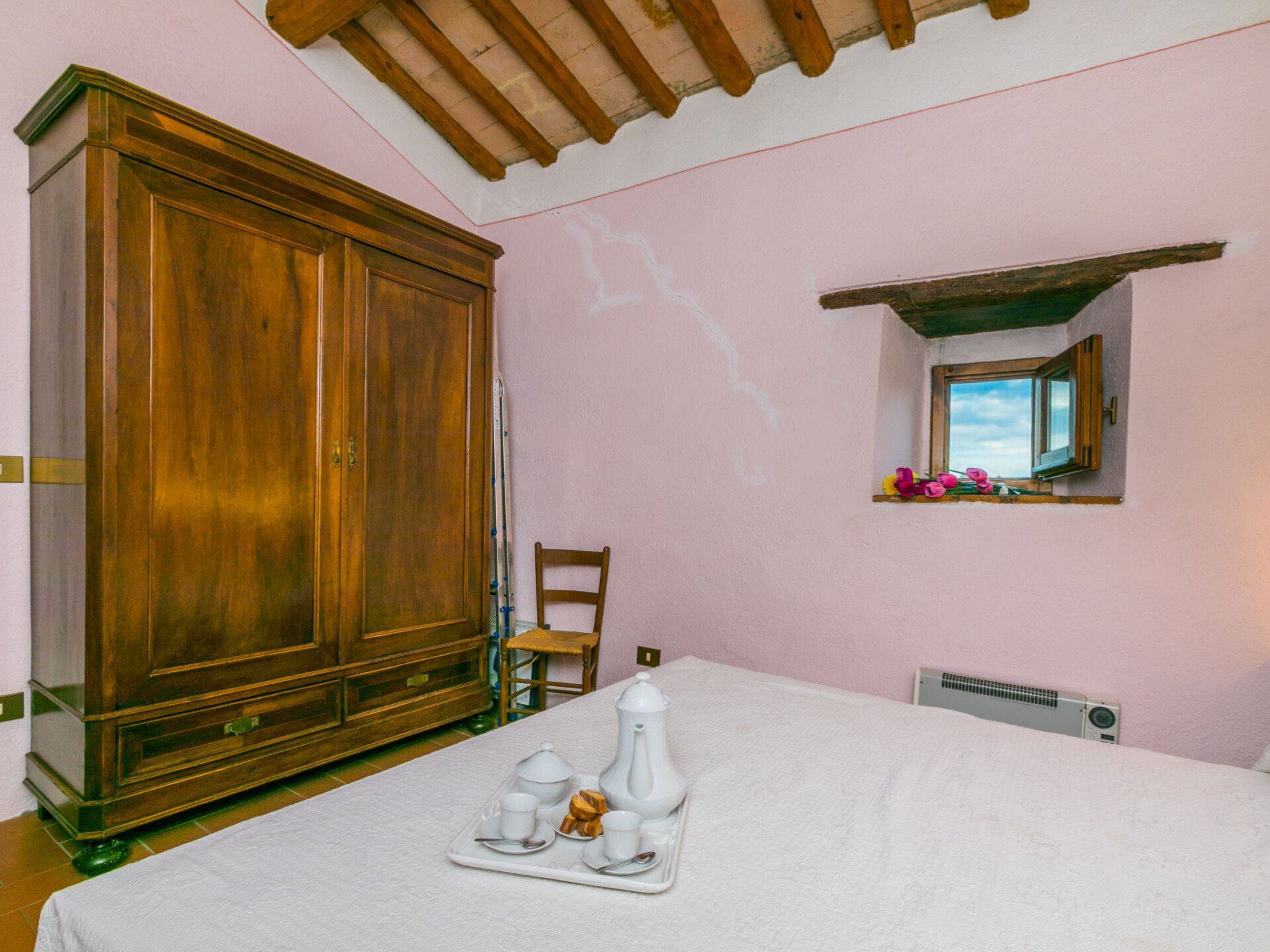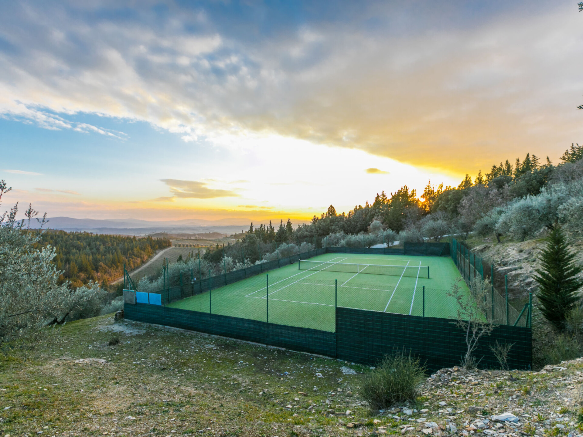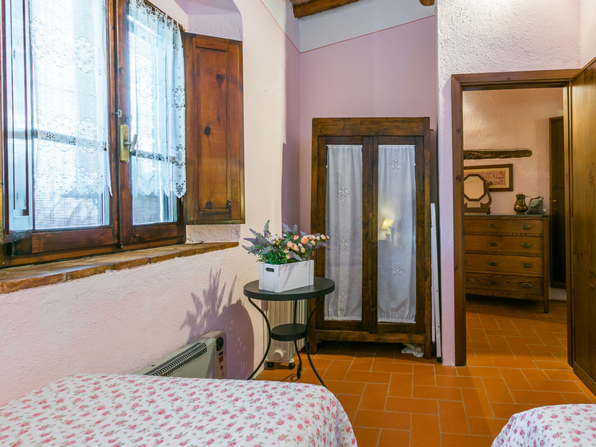 Castellina in Chianti: Gezellig, rustieke rijtjeshuis "Casa Patrizia", van 2 verdiepingen, bouwjaar 1700, gerenoveerd in 1990, omgeven door bomen en wijngaarden. 20 appartementen in de woning. In een gehucht met 5 huizen, 12 km van het centrum van Castellina in Chianti, 9 km van het centrum van Poggibonsi, geïsoleerde, rustige, zonnige ligging op een heuvel, 100 m van de bosrand, 80 km van zee, te midden van groen. Voor medegebruik: wild terrein, planten en bomen, openluchtzwembad omheind (6 x 13 m, 80 - 130 cm diepte, seizoensgebonden beschikbaarheid: 20.Mei. - 30.Sep. openingstijden zwembad: 07:00-21:00). Buitendouche, tennisbaan (1 x hard court), terras, tuinmeubelen, onderhoud zwembad door de eigenaar/tuinman. 1.8 km lange rommelige toegangsweg tot aan het huis. Parkeerplaats (voor 2 auto's) bij het huis op het terrein. Levensmiddelenwinkel 6 km, supermarkt 6 km, restaurant 5 km, bakkerij 6 km, fietsverhuur 12 km, bushalte 6 km, treinstation "Poggibonsi" 9 km, zandstrand "Cecina Mare" 80 km, overdekt zwembad 9 km, thermaalbad "Rapolano Terme" 70 km. Golfterrein (18 holes) 55 km, tennis 100 m, wandelroutes 100 m vanaf het huis. Attracties in de buurt: San Gimignano 23 km, Greve in Chianti 26 km, Siena 43 km, Firenze 58 m. Auto noodzakelijk. Baby uitrusting (incl.). Laden en lossen van de baggage is mogelijk bij het huis. Badmuts verplicht.