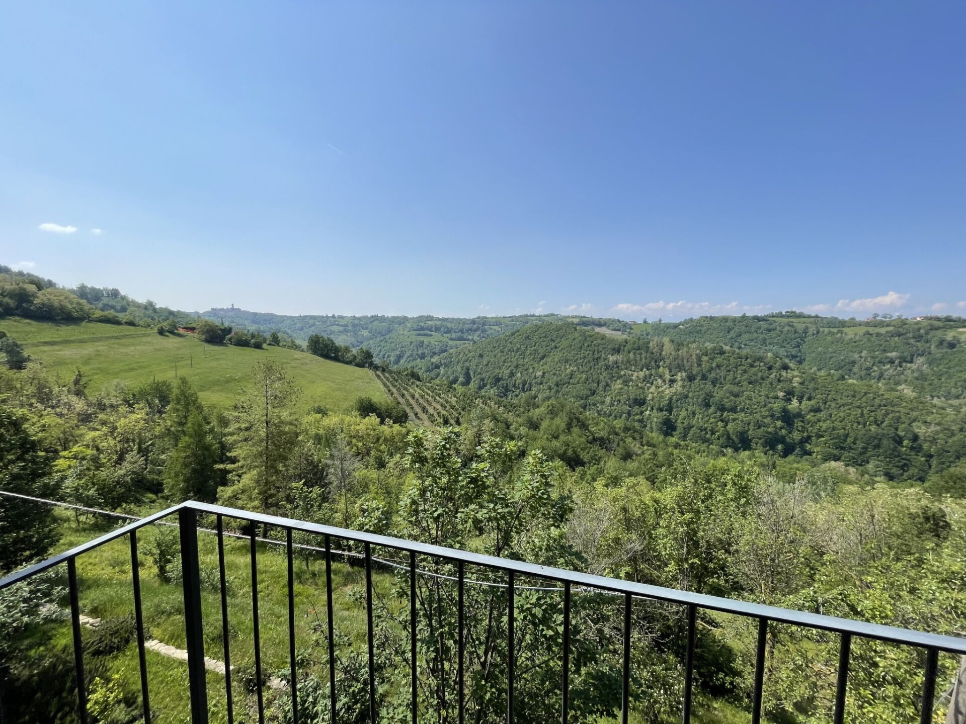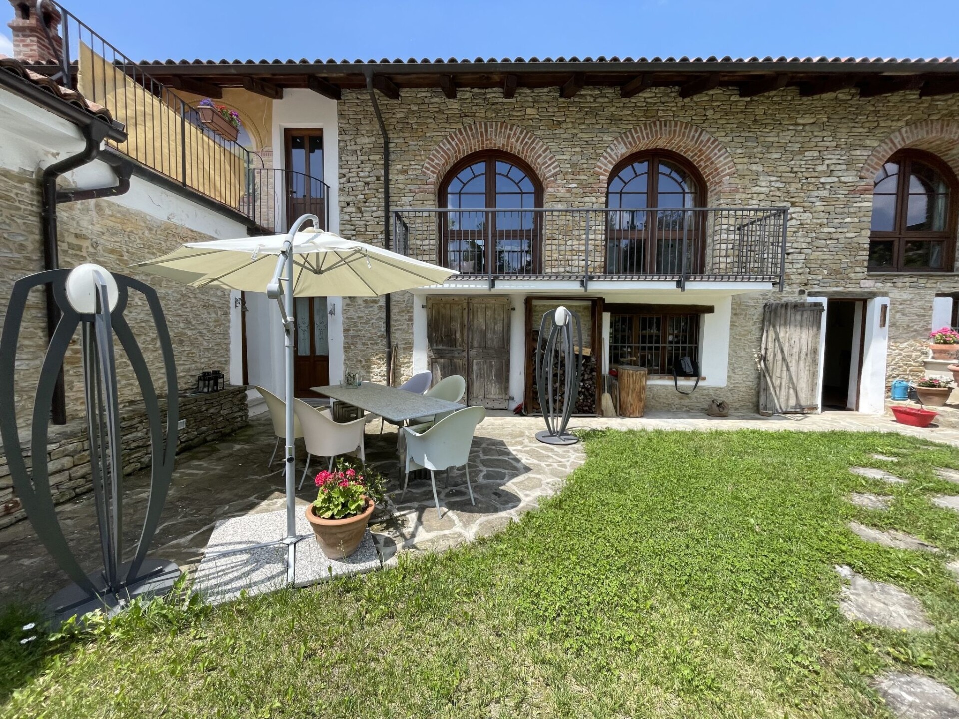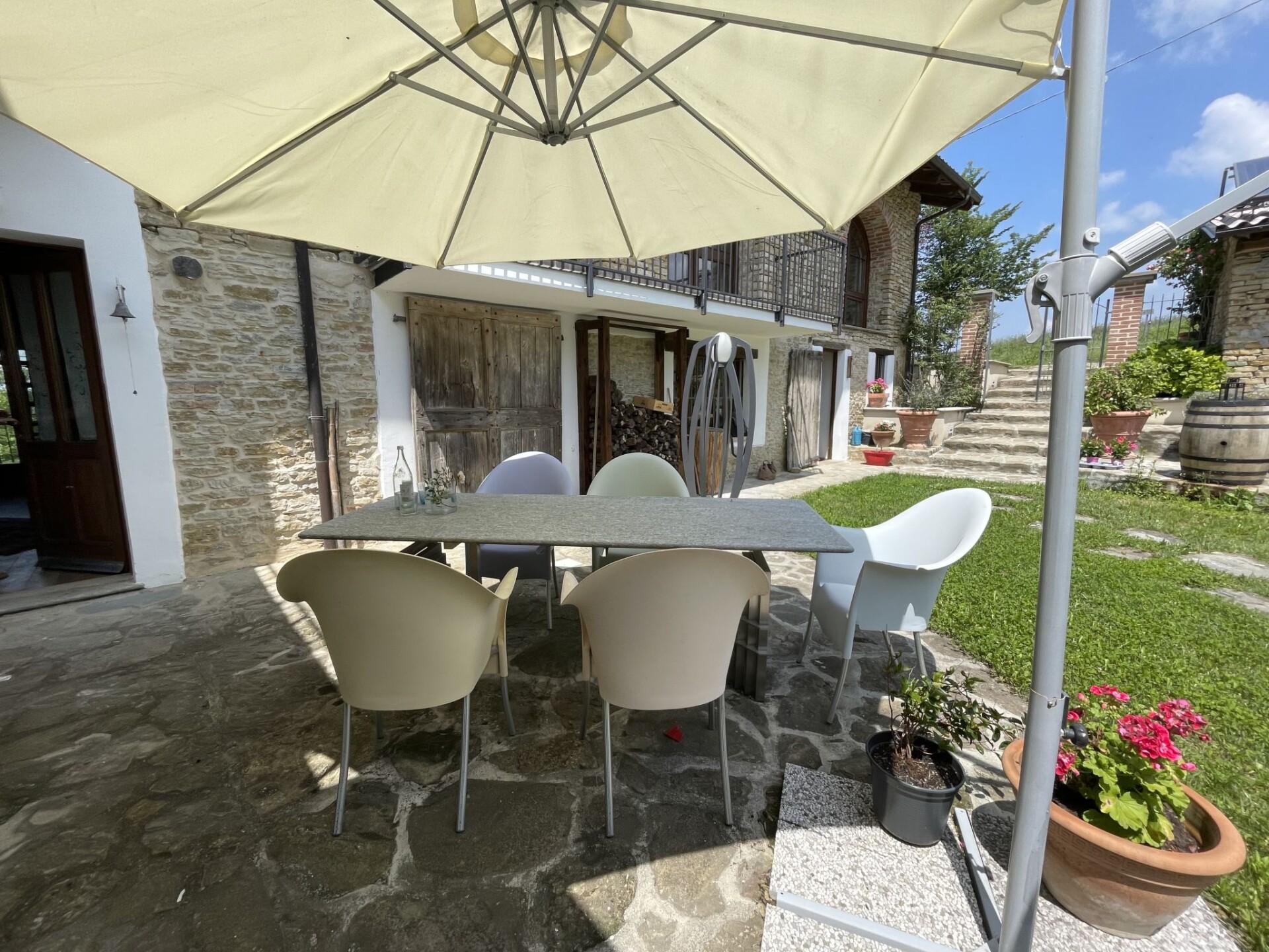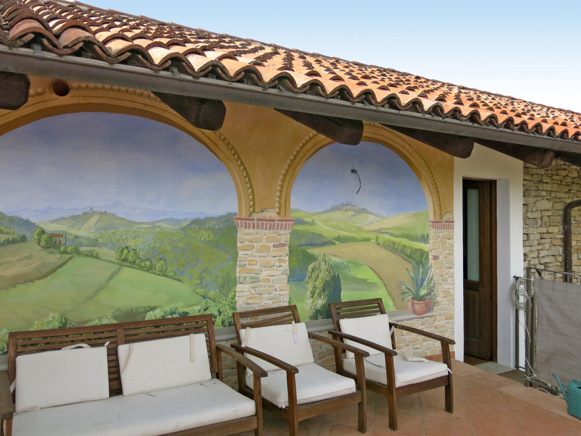 Huis "Casa Vacanza Cascina Lovera", 650 m boven zeeniveau, omgeven door weiden, velden en wijngaarden. 4 appartementen in de woning. 3 km van het centrum van Murazzano, 10 km van het centrum van Dogliani, 20 km van het centrum van Barolo, geïsoleerde ligging tegen een helling, 56 km van zee. Voor medegebruik: terrein 15.000 m2, tuin op verschillende niveaus (niet omheind) met gazon en planten, wilde tuin, openluchtzwembad (8 x 4 m, 140 cm diepte, seizoensgebonden beschikbaarheid: 01.Mei. - 03.Okt.). Buitendouche, terras, tuinmeubelen, aangelegde binnentuin onderhoud zwembad door de eigenaar/tuinman. In het huis: tafelvoetbal. Parkeerplaats bij het huis op het terrein. Oplaadstation. Winkel 3 km, supermarkt 10 km, bushalte 200 m, treinstation "Bra" 34 km. De eigenaar woont op hetzelfde terrein.