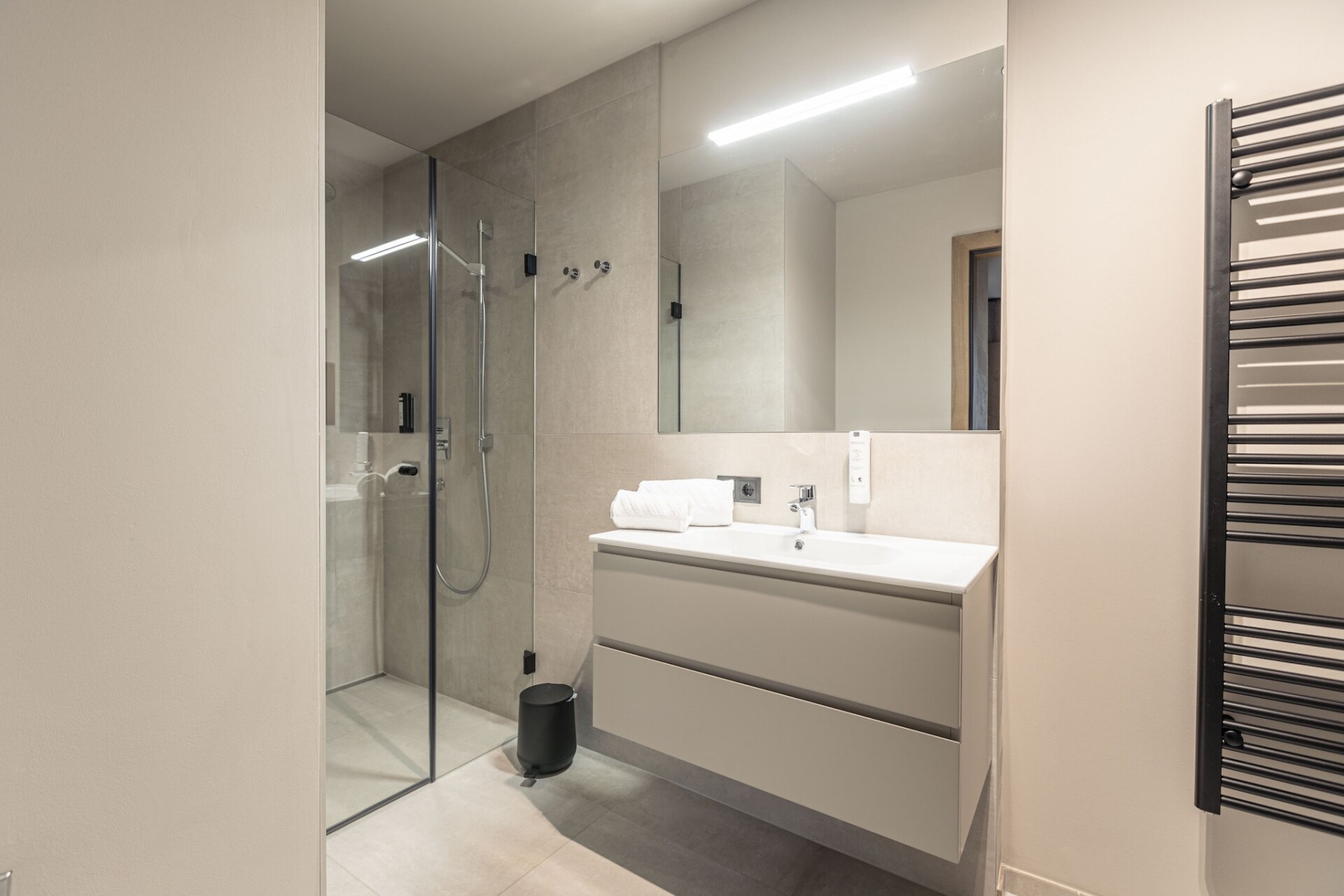 Het appartement met uitzicht op de bergen biedt 77 m² ruimte voor maximaal 4 personen. Het beschikt over 1 slaapkamer met een tweepersoonsbed, 1 slaapkamer met 2 eenpersoonsbedden, 2 badkamers met douches en een ruim terras van 60 m². De open keuken in dit Superior appartement is volledig uitgerust met alle benodigdheden: keukengerei en kookgerei, een keramische kookplaat, oven, vaatwasser, koelkast met vriezer, broodrooster, waterkoker en een filterkoffiezetapparaat. Een klein startpakket, inclusief vaatwastabletten, afwasmiddel (monster), spons, vuilniszakken, schoonmaakdoekjes en een theedoek, is aanwezig bij aankomst.