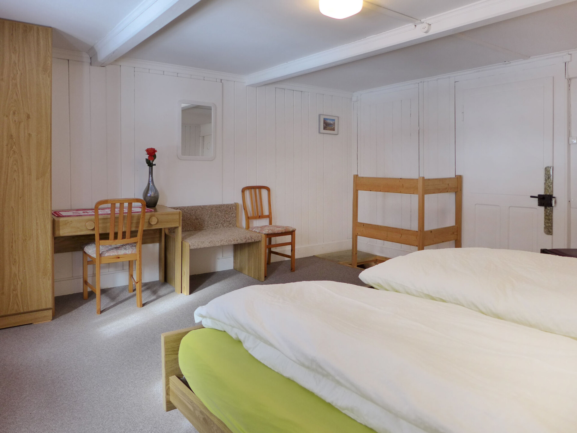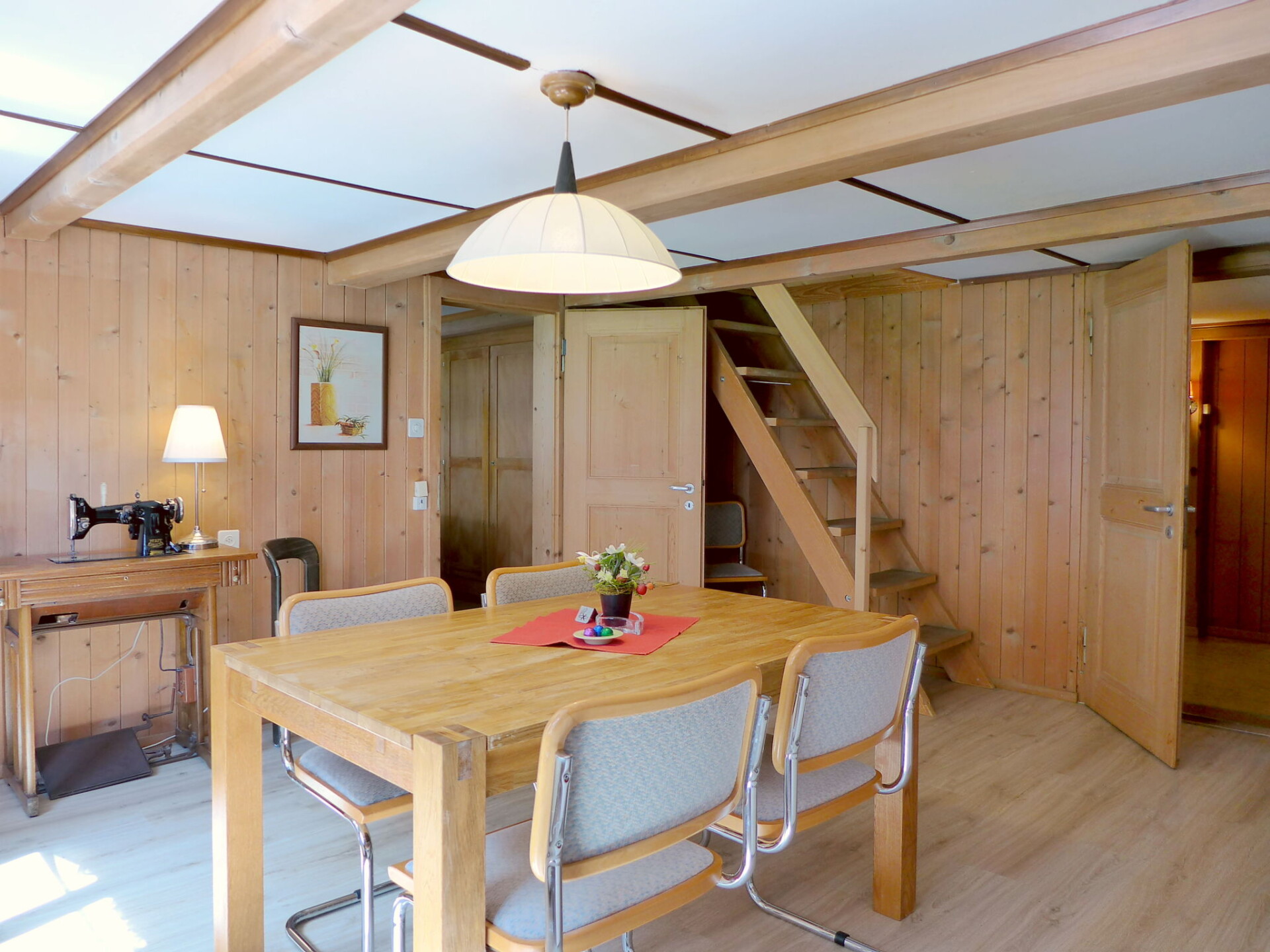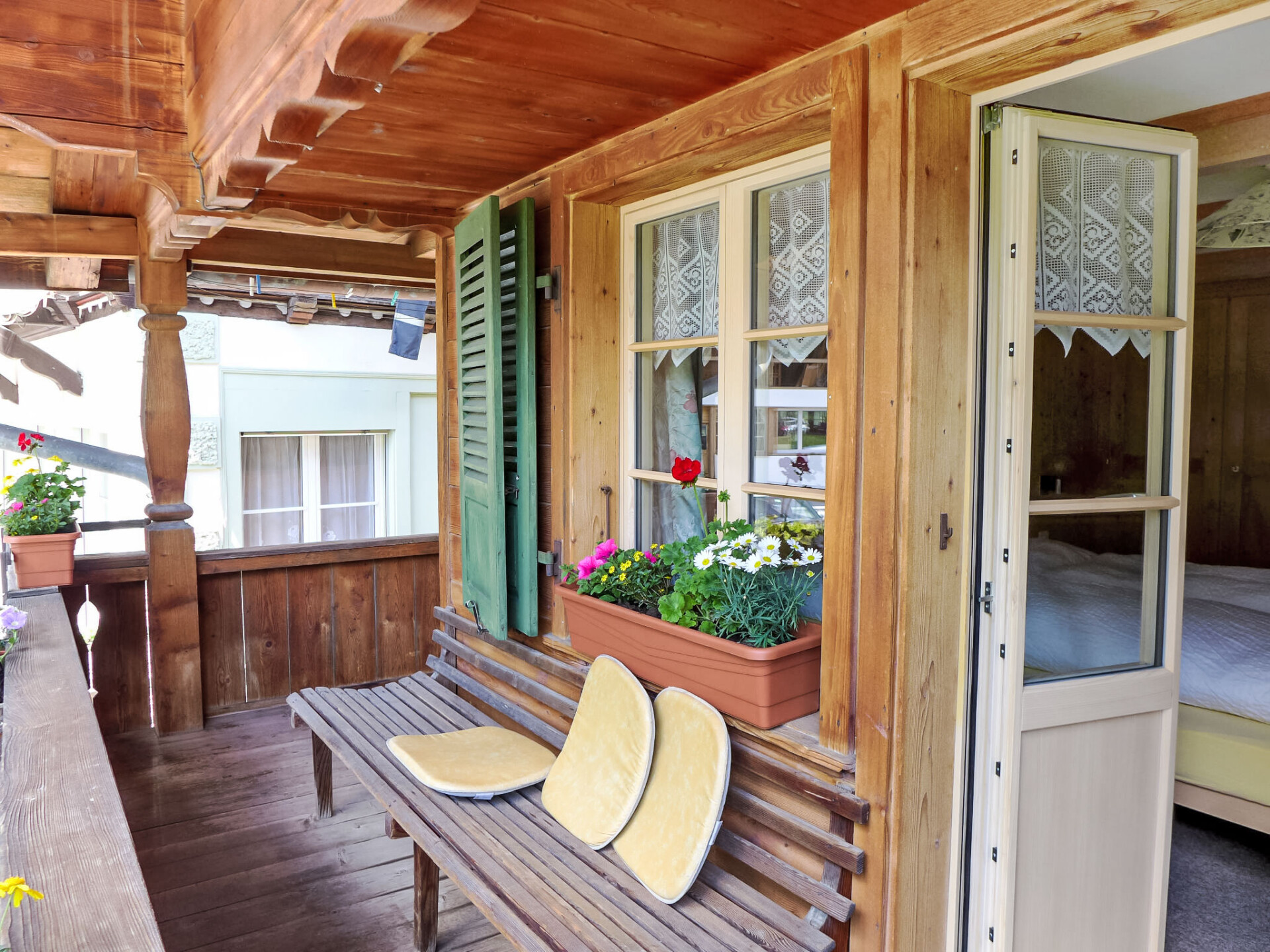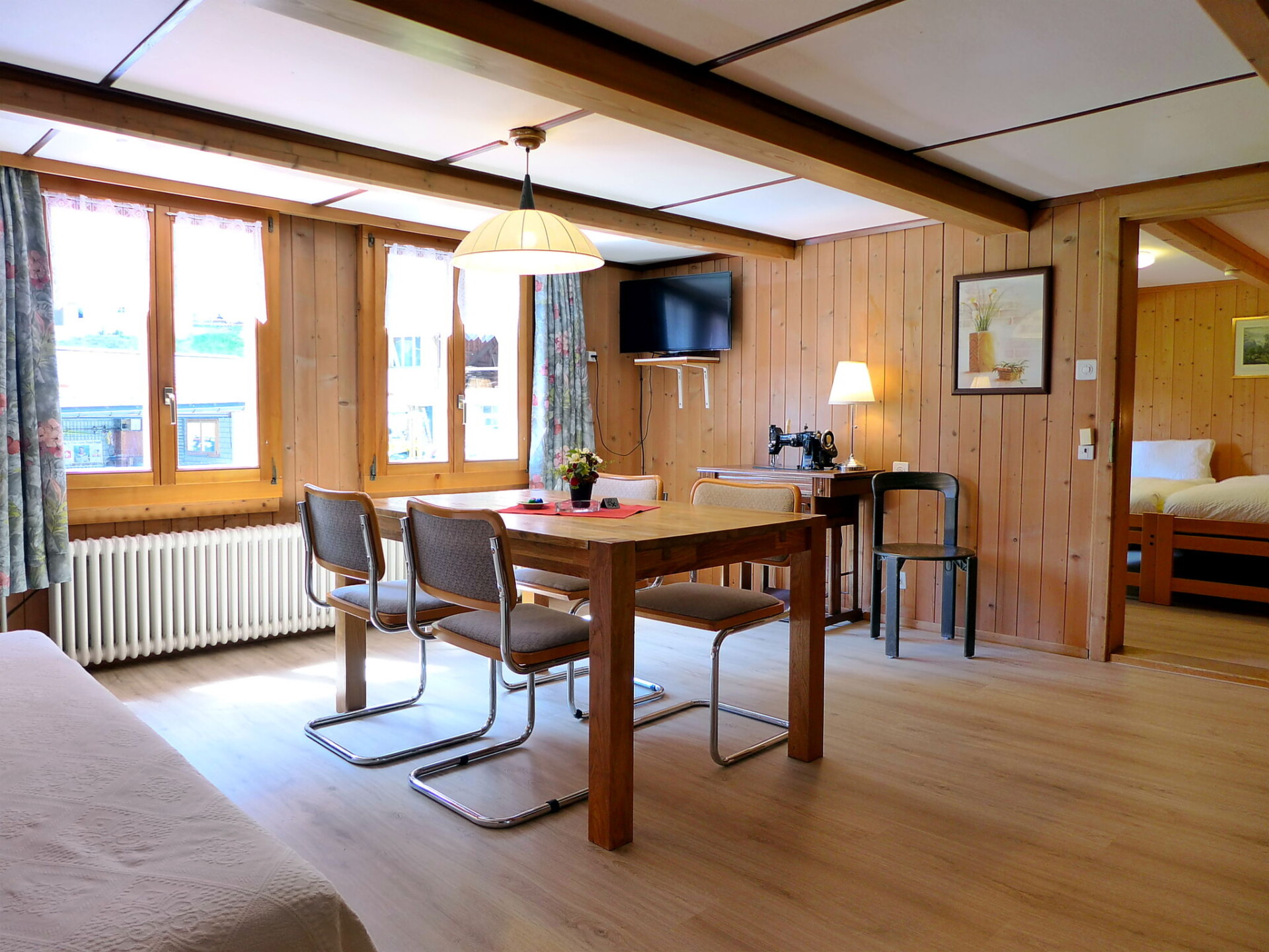 Appartement 3-kamers 80 m2 op 2 verdiepingen, op verhoogde begane grond. Ruim, gezellig en met veel hout ingericht: hoogte van het plafond 185 - 200 cm. Woon-/eetkamer met 1 divanbed, Sat-TV, Flatscreen TV en radio. 1 2-pers. kamer met 2 bedden (90 cm, lengte 200 cm). Uitgang naar het balkon. Open keuken (3-pits kookplaat, oven, afwasmachine, broodrooster, waterkoker, magnetron, elektrische koffiemachine, raclette oven, fondue Set (kaas)) met eettafel. Douche/WC. Bovenverdieping: (steile trap), 1 groot 2-pers. kamer met 2 bedden (90 cm, lengte 200 cm). Klein balkon. Balkonmeubilair, bergruimte. Mooi uitzicht op de bergen en de plaats. Ter beschikking: wasmachine, kinderbed tot 2 jaar (extra), haardroger. Internet (Internet (WiFi), gratis). Parkeerplaats. Niet rokers woning.