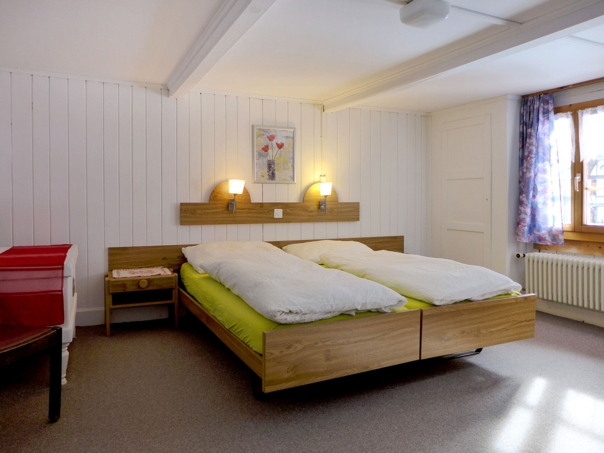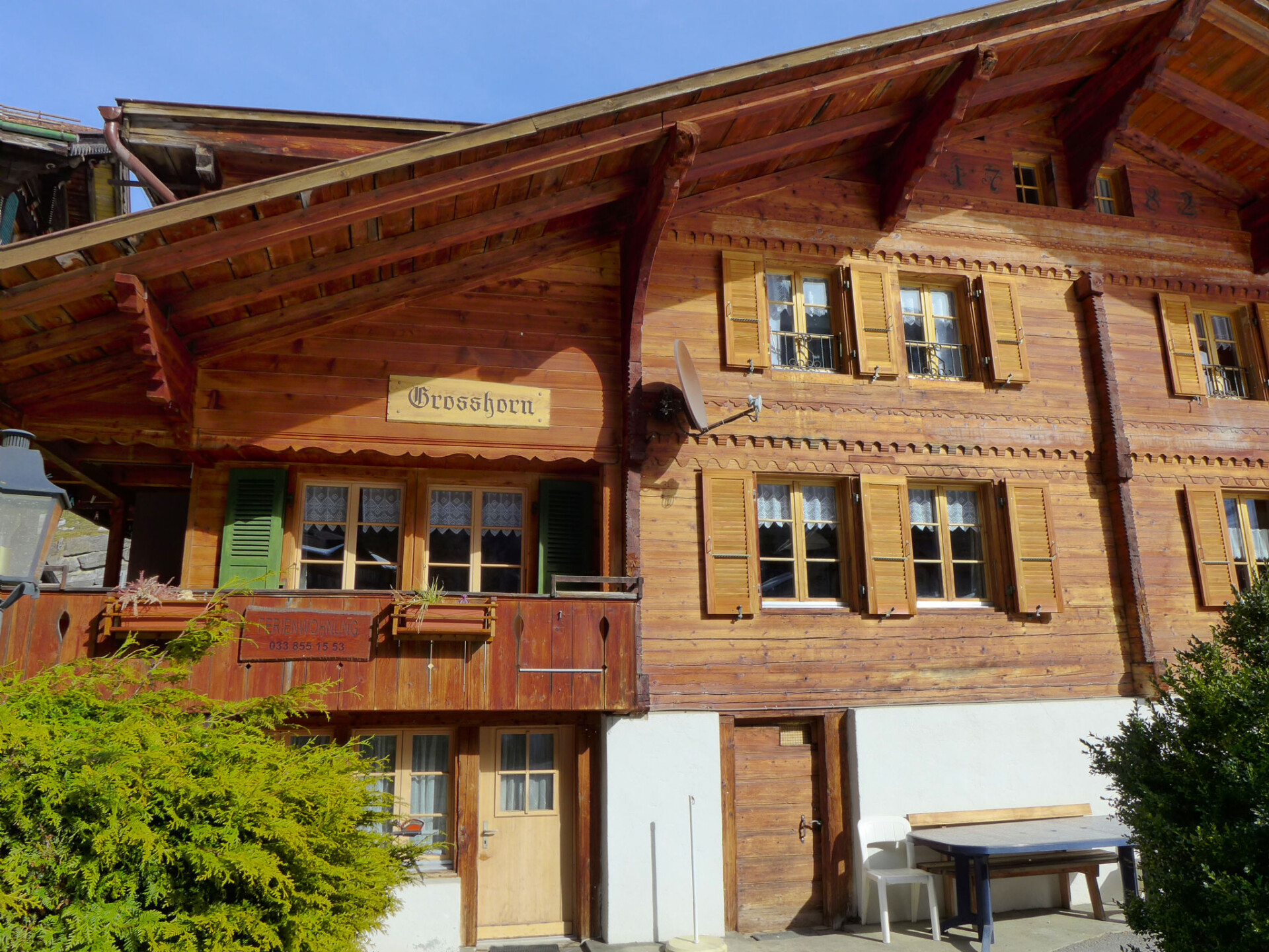 Lauterbrunnen: Rustieke, eenvoudig chalet "Grosshorn", van 2 verdiepingen. In de wijk Ey, zonnige ligging in een woonwijk, aan een weg. In het huis: bergruimte voor fietsen, berging voor ski's, centrale verwarming. Parkeerplaats. Winkel 300 m, levensmiddelenwinkel 500 m, supermarkt 600 m, restaurant 200 m, bushalte 50 m, treinstation 800 m, openluchtzwembad 800 m. Tennis 200 m, midgetgolf, wandelroutes 50 m vanaf het huis, kabelbaan 800 m, ski faciliteiten 4 km, skibushalte, langlaufloipe 200 m, ijsbaan. Attracties in de buurt: Trümmelbach Wasserfälle, Schilthorn Piz Gloria. Bekende skigebieden kunnen gemakkelijk worden bereikt: Mürren Schilthorn, Wengen - Kleine Scheidegg. Bekende meren kunnen gemakkelijk worden bereikt: Brienzersee, Thunersee 15 km. Wandelgebied UNESCO-Welterbe Jungfau-Aletsch, Mürren, Hinteres Lauterbrunnental. Gratis skibus. Gratis skibus naar het skigebied Mürren-Schilthorn. De eigenaar woont in hetzelfde huis. Uitzicht op de Staubbachwaterval.