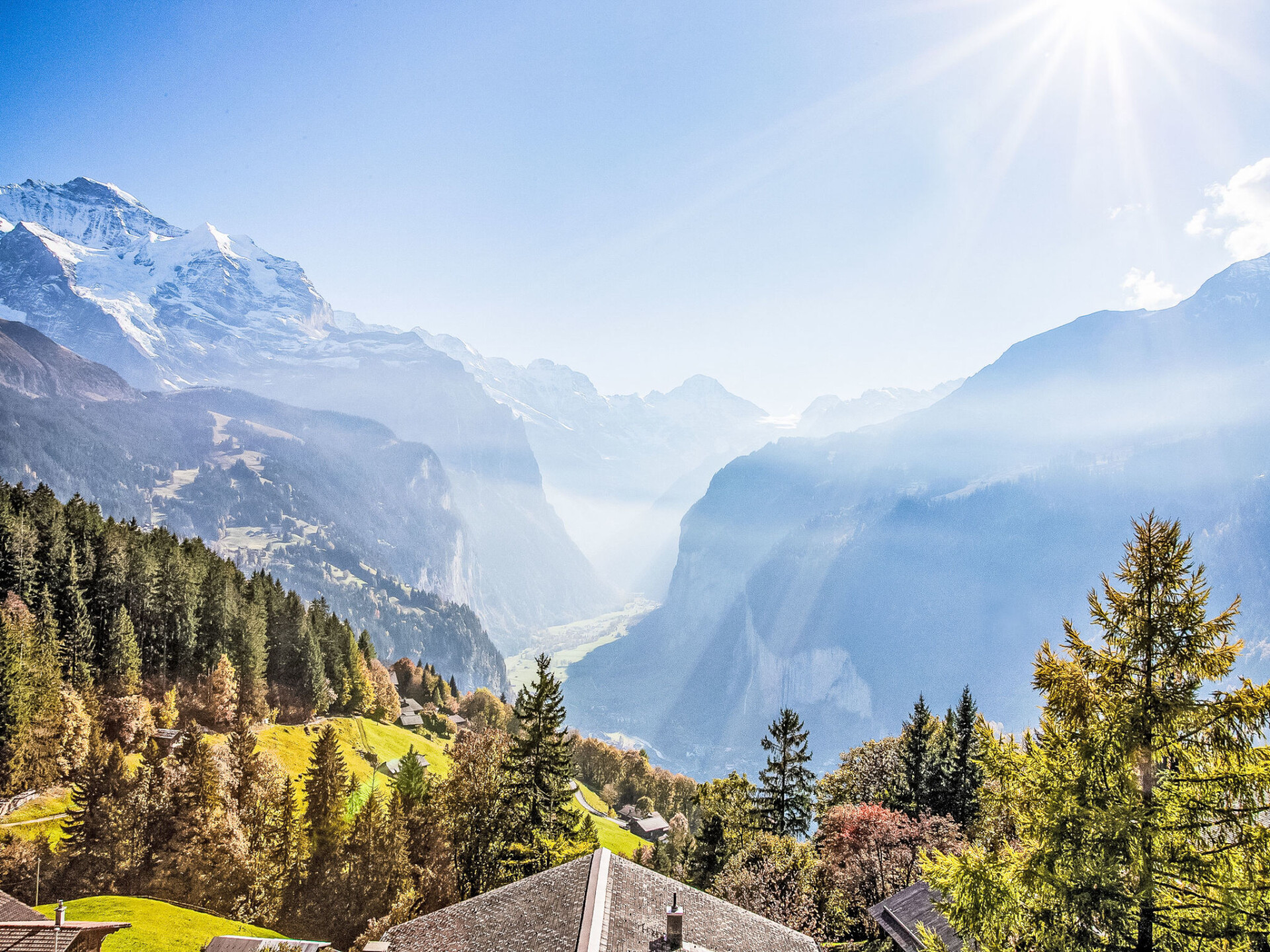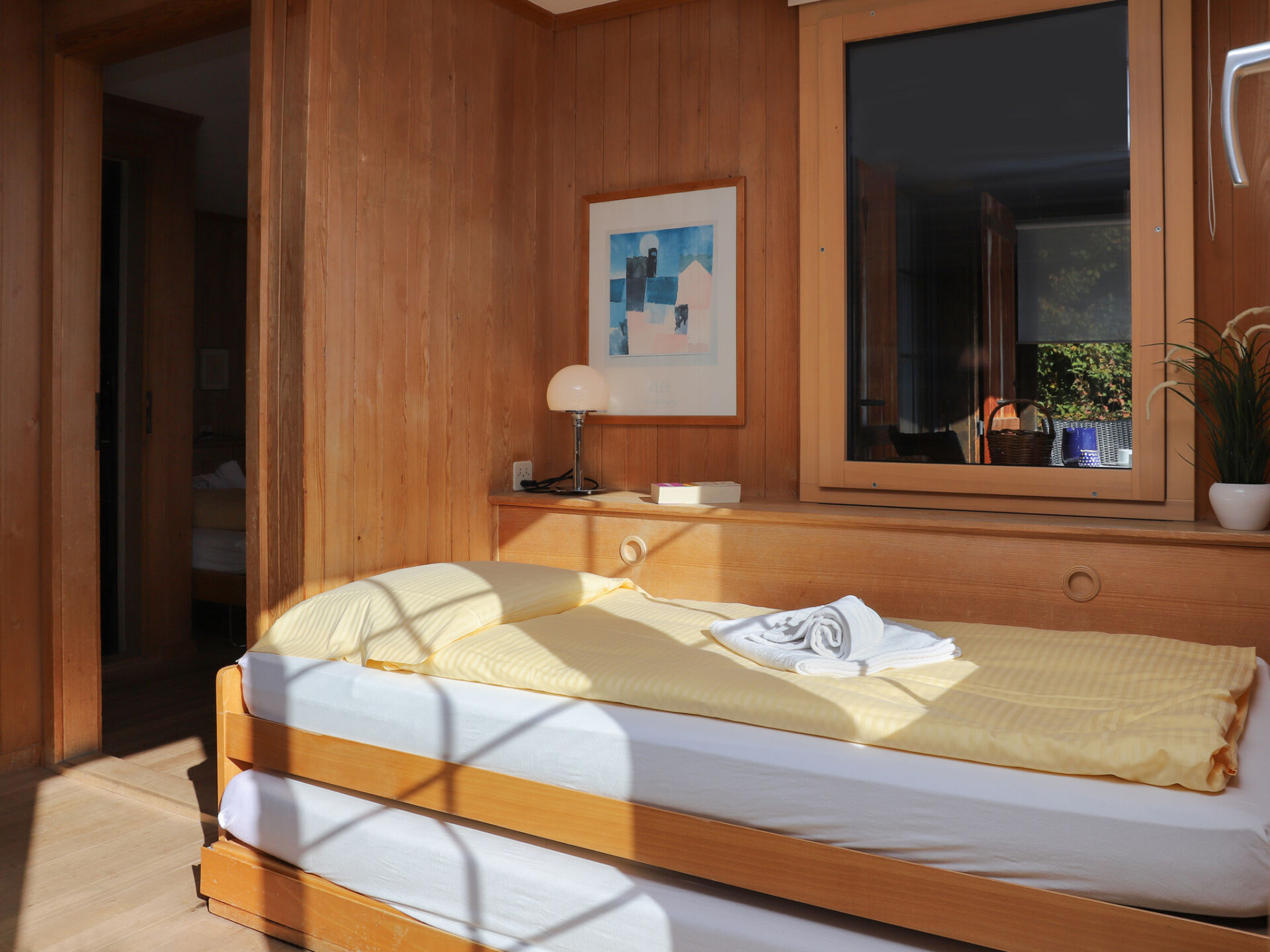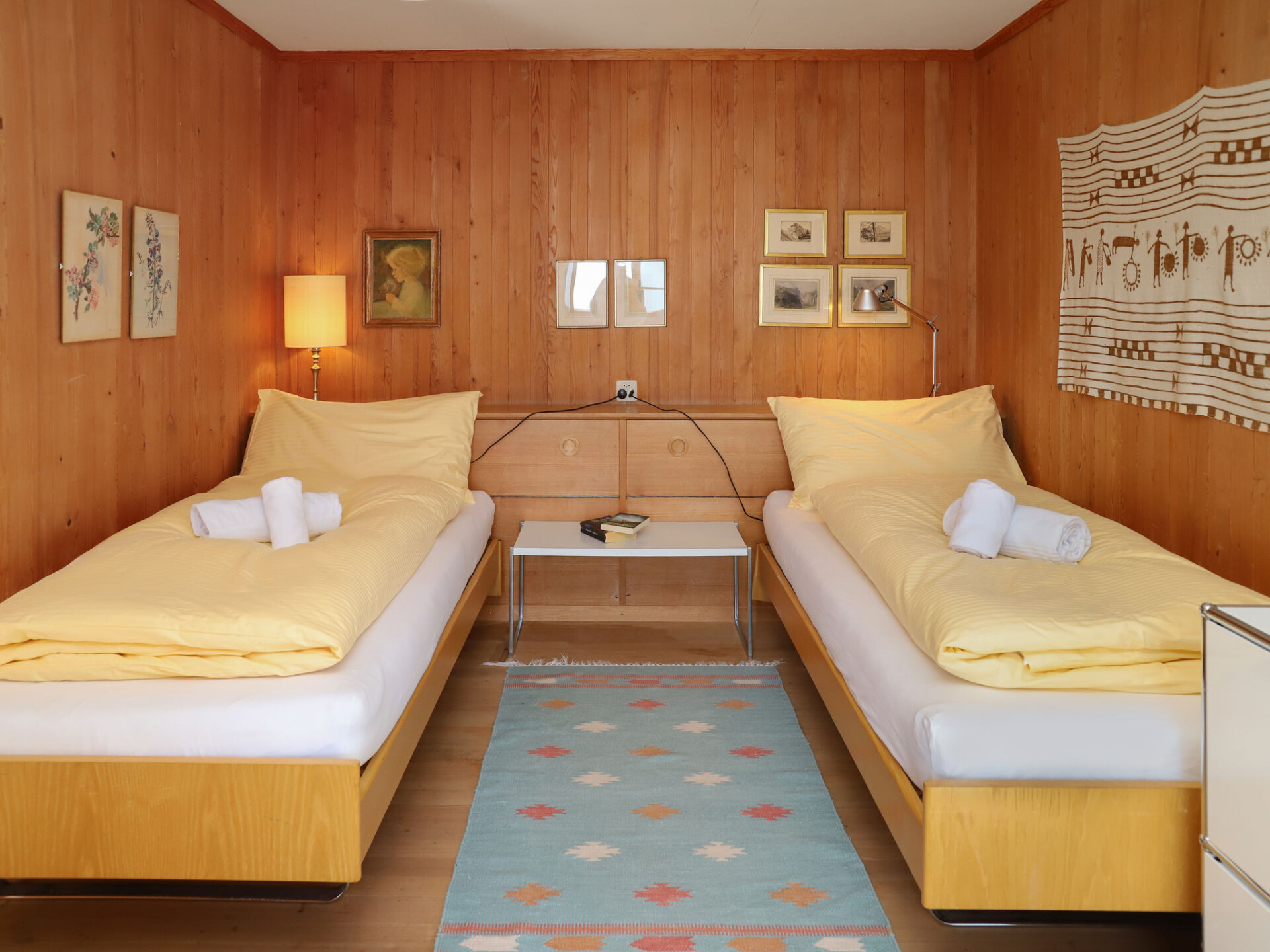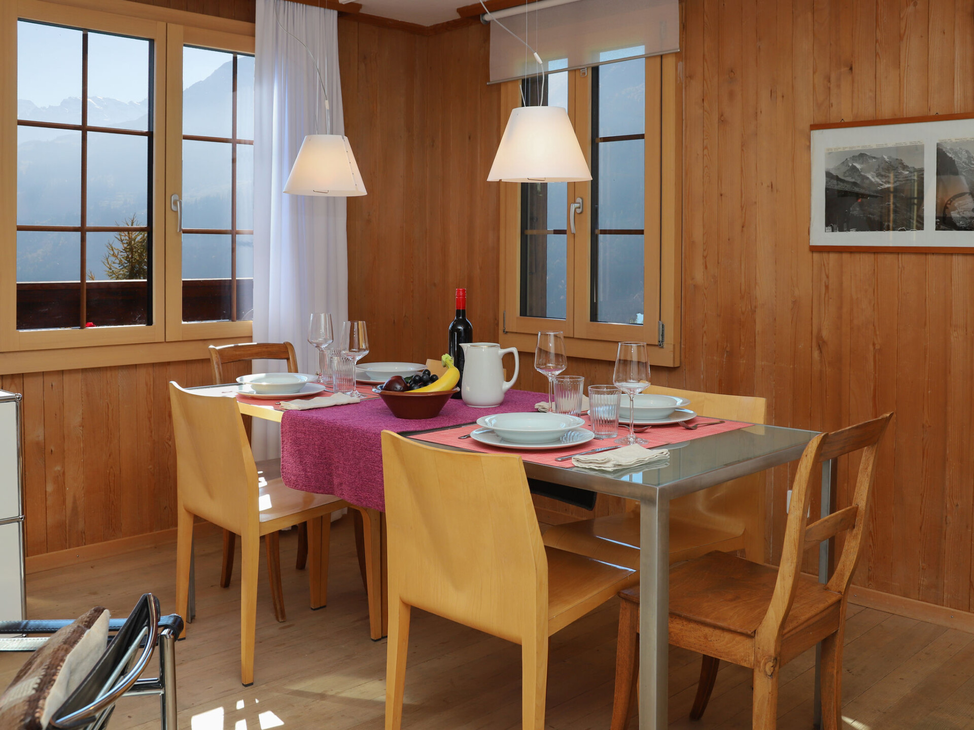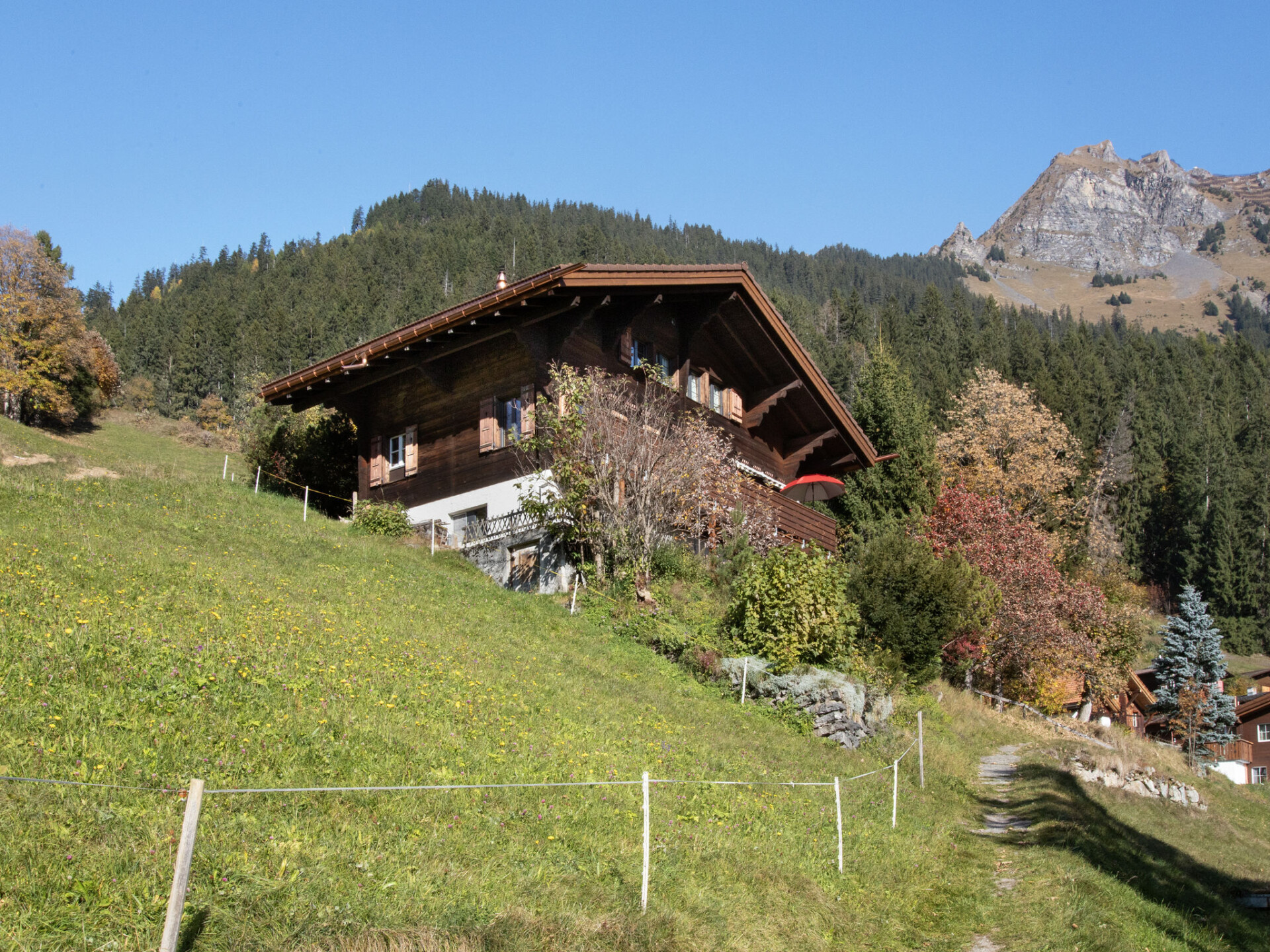 "Jungfrau a d Ledi", chalet 2-kamers 53 m2, op de bovenverdieping. Ruim, gedeeltelijk gerenoveerd, modern en smaakvol ingericht: woon-/eetkamer 30 m2 met 1 bed (90 cm, lengte 190 cm), eettafel, Kabel-TV en internationale TV-zenders (Flatscreen TV), radio en CD-speler. Uitgang naar het balkon. 1 kamer 14 m2 met 2 bedden (90 cm, lengte 190 cm). Open keuken (oven, afwasmachine, 4 keramische glas kookplaten, broodrooster, waterkoker, elektrische koffiemachine, pads voor de koffiemachine (Nespresso) extra). Douche/WC. Olie-verwarming. Balkon, op het zuiden gelegen, zithoek in de tuin. Balkonmeubilair, ligstoelen (2). Mooi panoramazicht op de bergen, het dal en Jungfrau. Ter beschikking: Internet (Internet (WiFi), gratis). Rookvrij huis. Maximaal 1 huisdier/hond toegestaan.