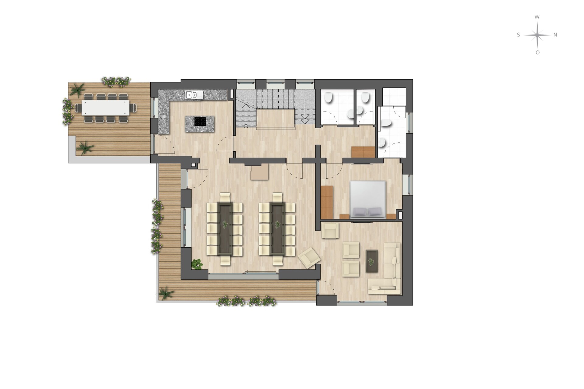 Het chalet beschikt over een grote woonkamer met een moderne open en volledig uitgeruste keuken en eethoek. Vanuit de woonkamer heeft u toegang tot het zonnige balkon en vanuit de keuken heeft u toegang tot het grote terras. Het chalet beschikt over 5 slaapkamers en 2 badkamers, evenals een wellnessruimte met sauna en een berging voor ski's en skiaccessoires. U kunt direct bij het chalet parkeren.