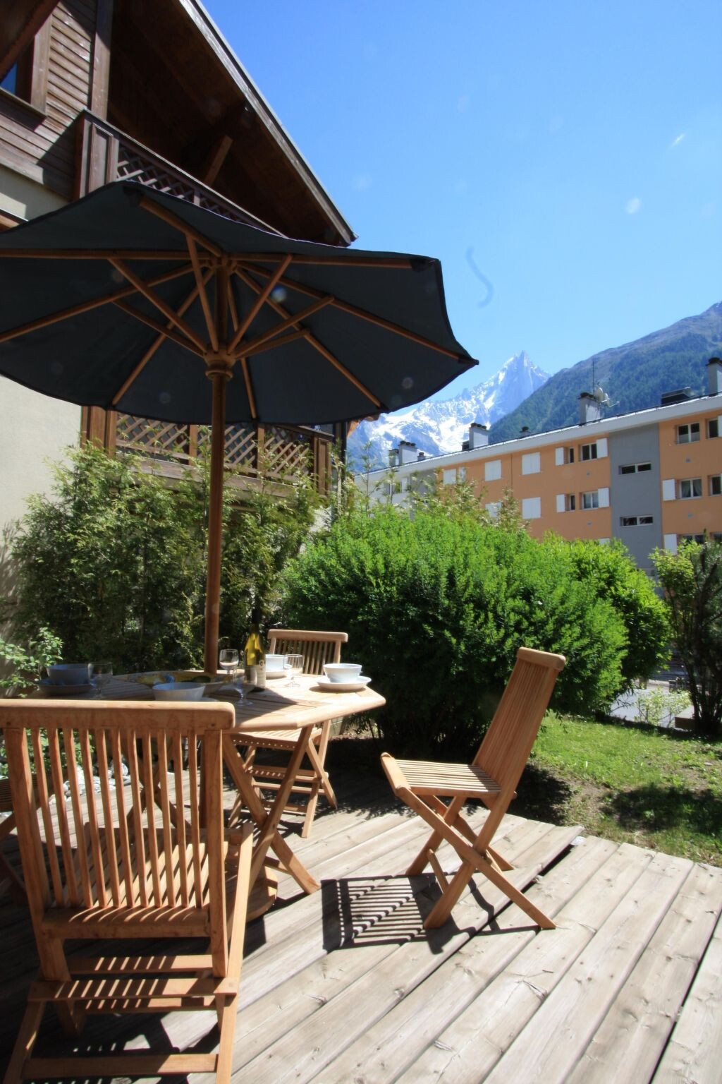 Sunny terrace with tables and chairs and views of Mont Blanc and Aiguille du Midi