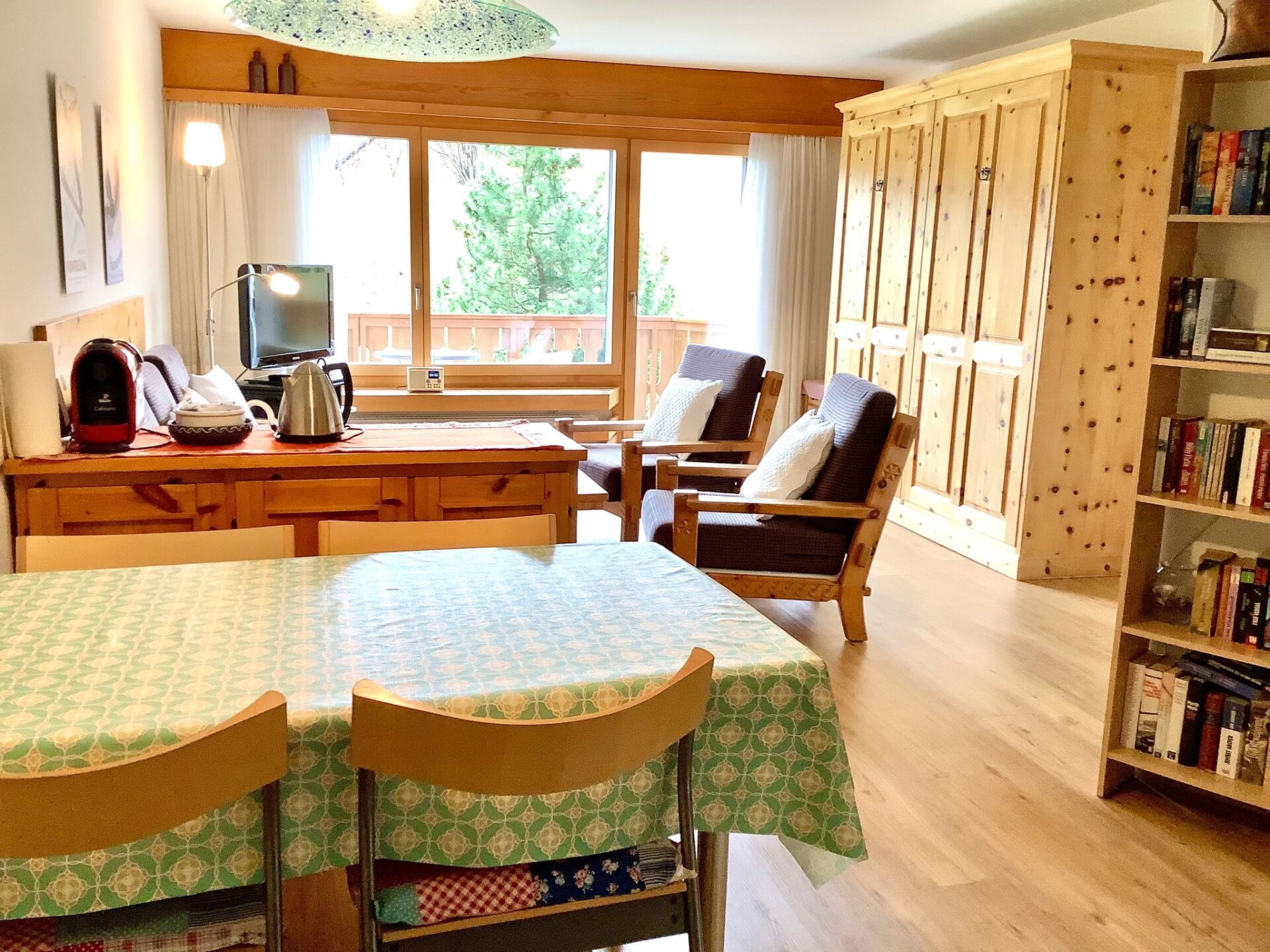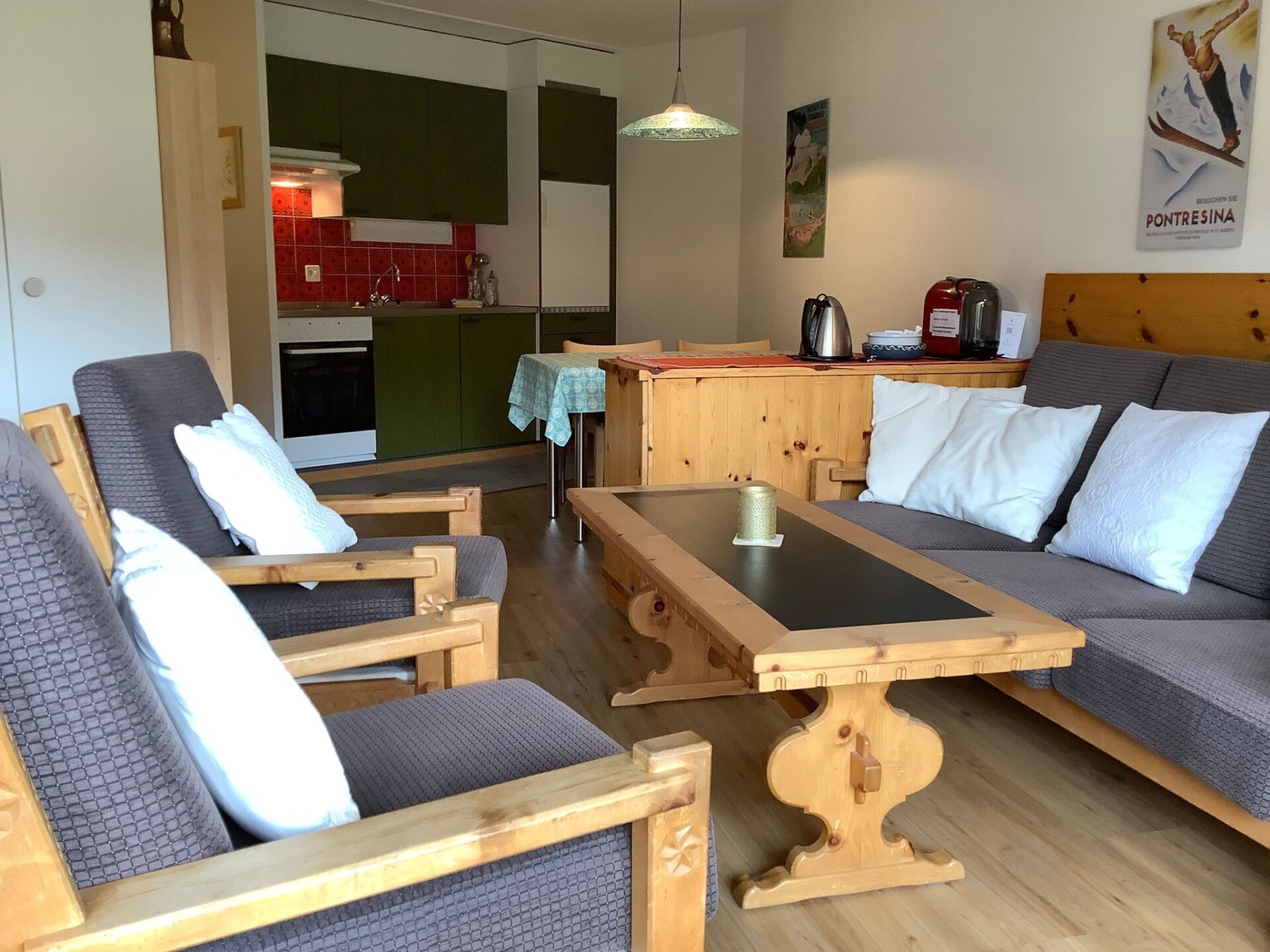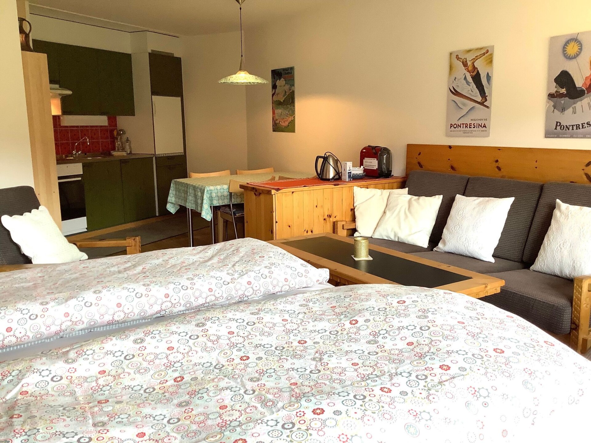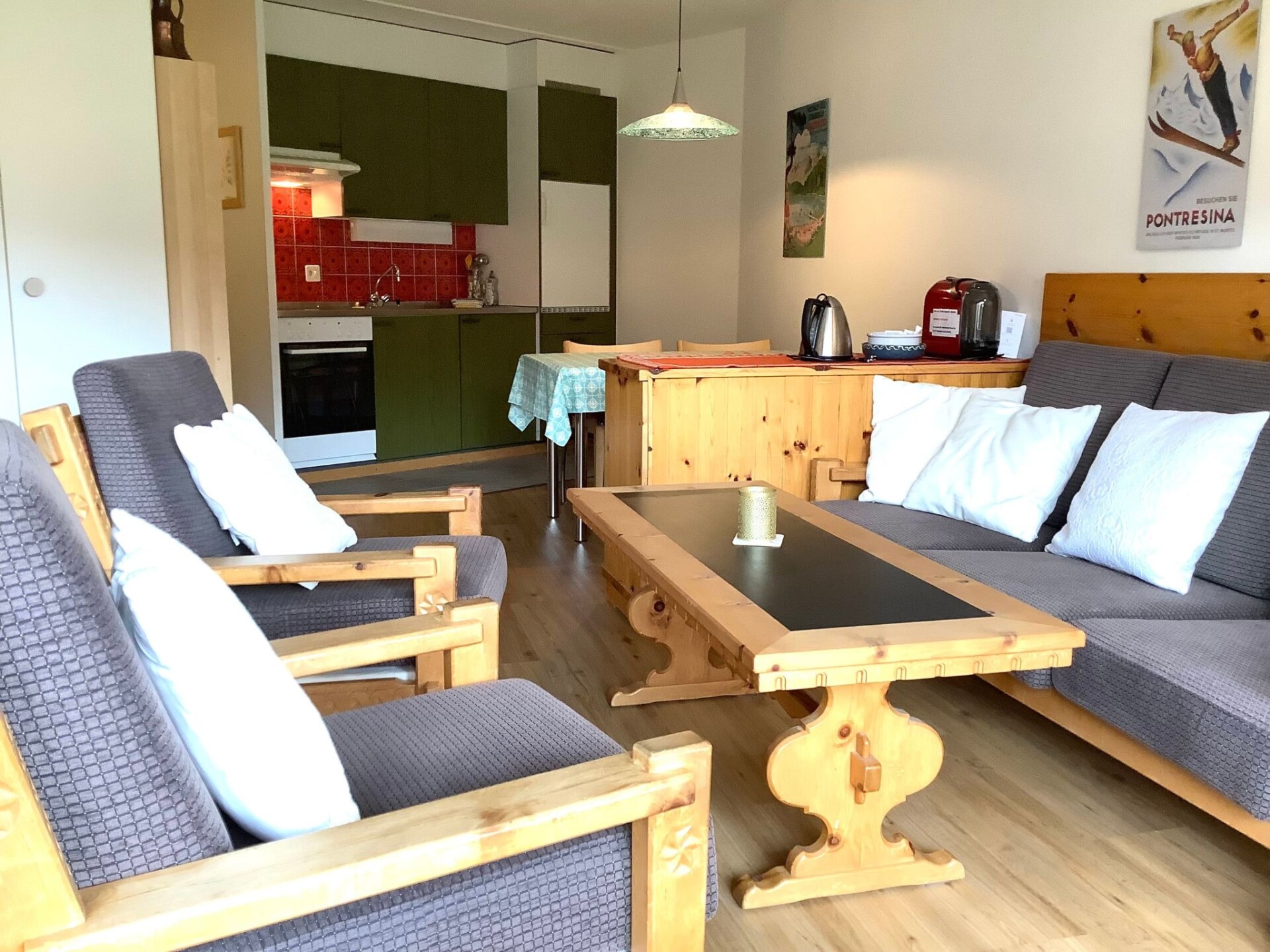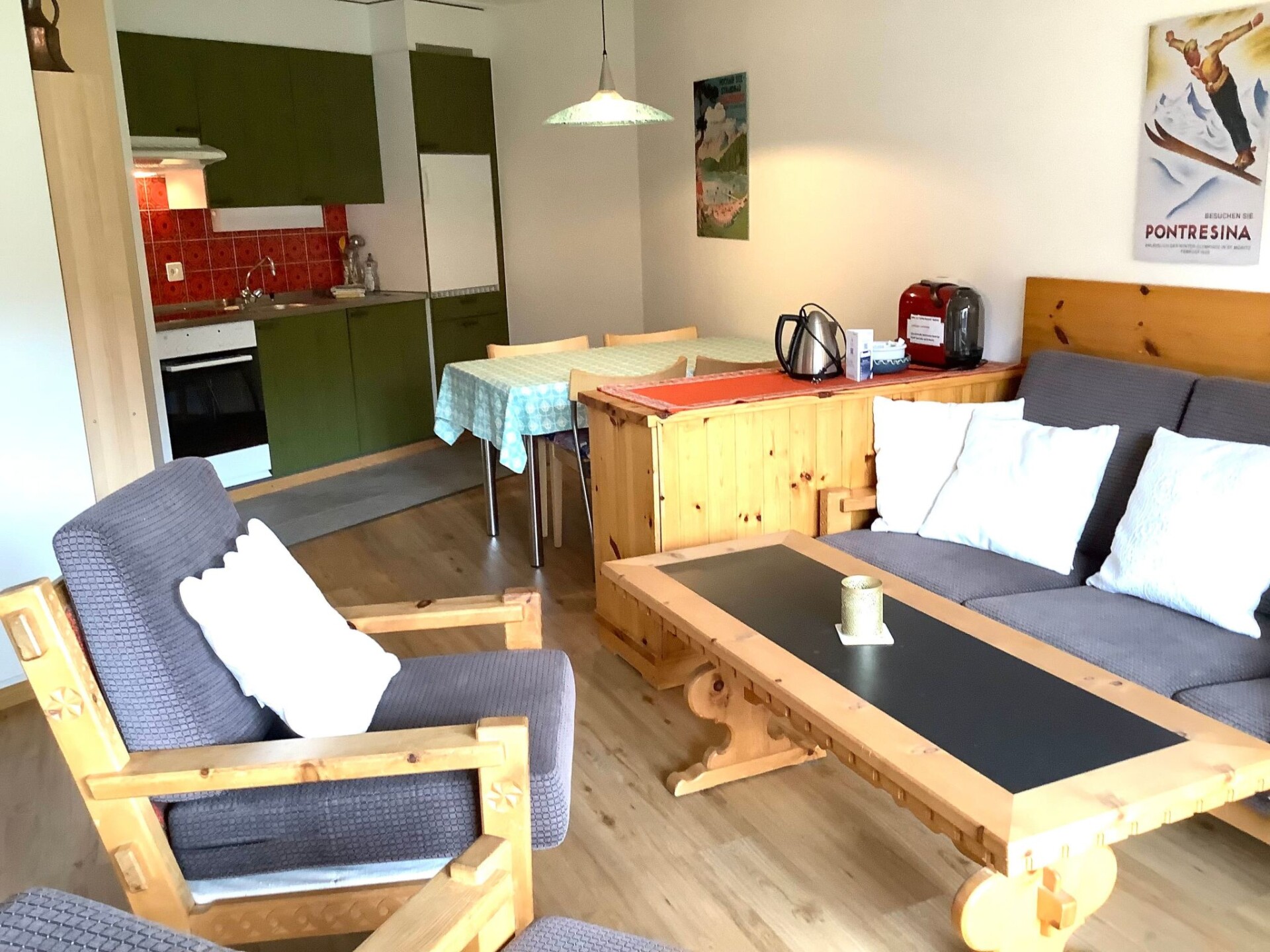 FREE PUBLIC TRANSPORT TICKETS FOR BUS AND TRAIN SUMMER AND WINTER SEASON. Beautiful, spacious 1 1/2 room flat (38m2) furnished with Swiss stone pine on the mezzanine floor, quiet location with little traffic. Living room with 2 foldaway beds SWISSCOM TV, Internet WLAN FREE furnished balcony with view of the mountains towards the Bernina Pass. Open kitchen with electric cooker (glass ceramic hob) with oven, fridge, coffee machine, toaster, kettle, fondue set. Bathroom/bathtub/WC. Washing machine, ski room, bicycle room in the house. An outdoor car park is available free of charge. Near bus station, cross-country ski run and hiking trails. Pets not allowed. Non-smoking flat. All bed linen, towels and kitchen linen included.A new bus line connects all three major ski areas directly from our bus stop. (3 min. walk)Biker friendly.Excursion possibilities: These mountains. These lakes. This light! On 580 kilometres of hiking trails across all mountains or by mountain bike on 400 kilometres of enjoyable trails: the Upper Engadine offers a first-class network of hiking trails and mountain bike trails in the midst of the pristine mountain world and the inspiring Upper Engadine lake district. The three flow trails on the Corviglia provide the right flow. The lakes of the Upper Engadin are also popular with sports enthusiasts. Kitesurfing, sailing, windsurfing, stand-up paddling: the possibilities are almost endless. The expanse of the inspiring high valley can be experienced in a particularly impressive way on the two 18-hole golf courses in Samedan and Zuoz. And in addition to the wide range of sporting activities on offer, there are also first-class cultural attractions such as a visit to the museum or the numerous art galleries in the various villages.In winter, 350 kilometres of the finest pistes in the Corviglia, Corvatsch and Diavolezza ski areas and the family-friendly Zuoz invite you to enjoy true skiing and snowboarding fun. Cross-country skiers will find over 220 kilometres of groomed trails in the Upper Engadine and the side valleys. The winter hiking trails and cross-country ski trails on the frozen lakes of the Upper Engadine sparkle with light, sunshine and vastness in the midst of an inspiring mountain world. Those who want to enjoy the tranquillity and beauty of the snow-covered forests can hike along the 150 km of winter hiking trails in the side valleys of Val Roseg, Val Fex or Val Bever, while those who prefer an overview can enjoy breathtaking views on the panoramic hiking trails high above the lakes on Muottas Muragl.Families can enjoy the Engadin sunshine on a carriage ride into Val Roseg or Val Fex, or toboggan down into the valley on the 4.2 km long, winding Muottas Muragl toboggan run.Welcome to Engadin St. Moritz.Other kitchen equipment (Kitchen1): Fondue crockery, kettle, pressure cookerSports facilities in the area: fishing, basketball, mountaineering, football pitch, ice skating, golf course, canoeing, climbing, mountain biking, paragliding, bike tours, rafting, riding boxes (guests), indoor riding arena, riding arena / riding facilities, tobogganing, rowing, skiing (alpine), skiing (cross-country), sports centre, squash, surfing, diving, tennis, sailingLocation description: Pontresina - The fine pleasures of the high Alps Old Engadine houses and stylish hotel buildings from the Belle Epoque characterise the sunny, sheltered high-altitude health resort. Nestled against a breathtaking backdrop of majestic mountain peaks, above all Piz Bernina, the highest peak in the Eastern Alps, Pontresina is the starting point for alpinists, hikers and climbers in both summer and winter. But culture lovers, romantics and connoisseurs will also find real gems in and around Pontresina, for example a horse-drawn carriage ride into the contrasting Val Roseg or the Bernina Express to the south. In winter, countless inspiring cross-country skiing routes and picturesque winter hiking trails through the enchanting landscape are a treat for the senses. The Diavolezza ski area, which is particularly popular with freeriders, is just a stone's throw away. In summer, the largest colony of ibex in Switzerland delights explorers, while the new "Bernina-Glaciers" adventure area brings the fascination of glaciers in the Bernina region to life.