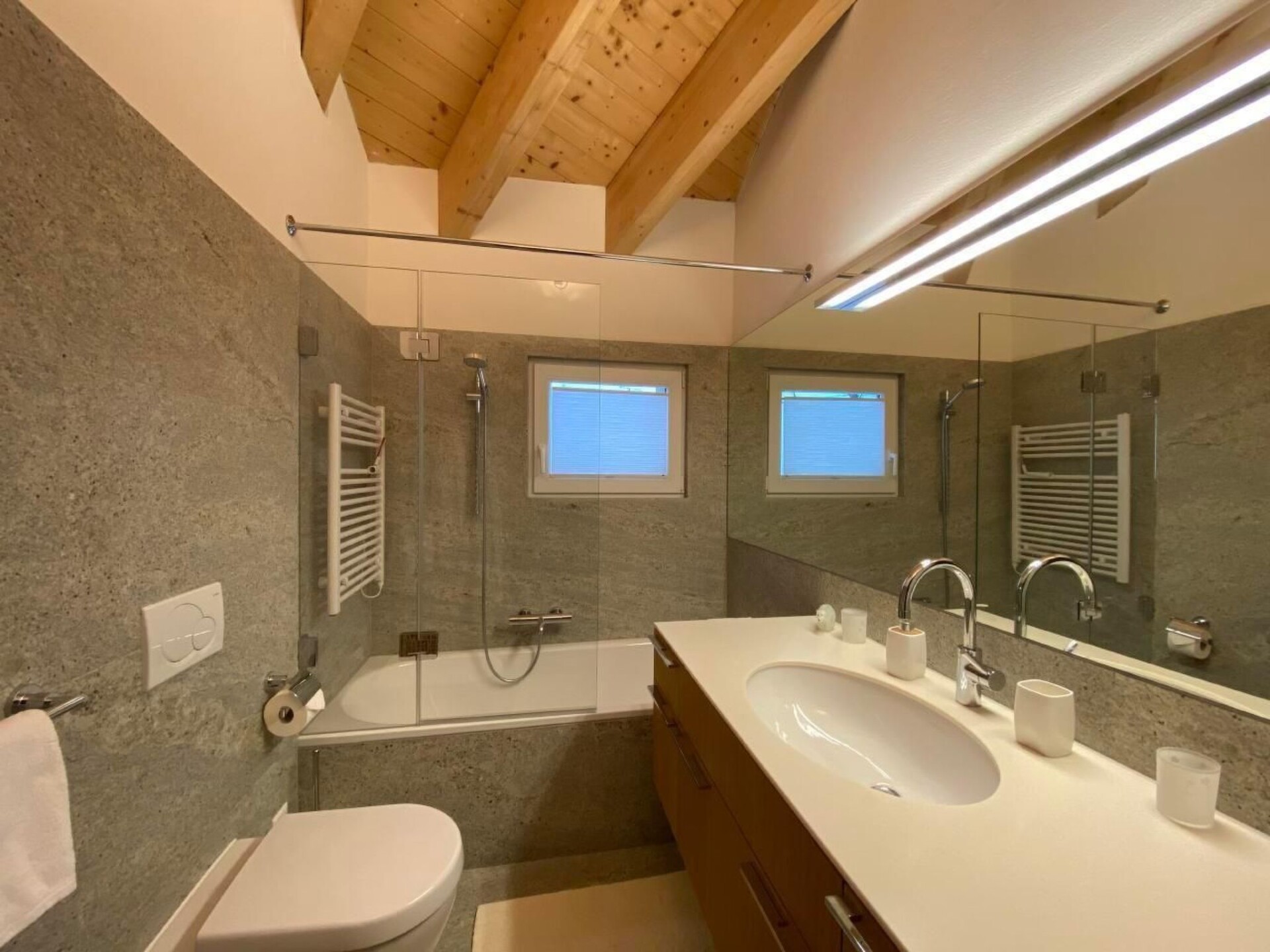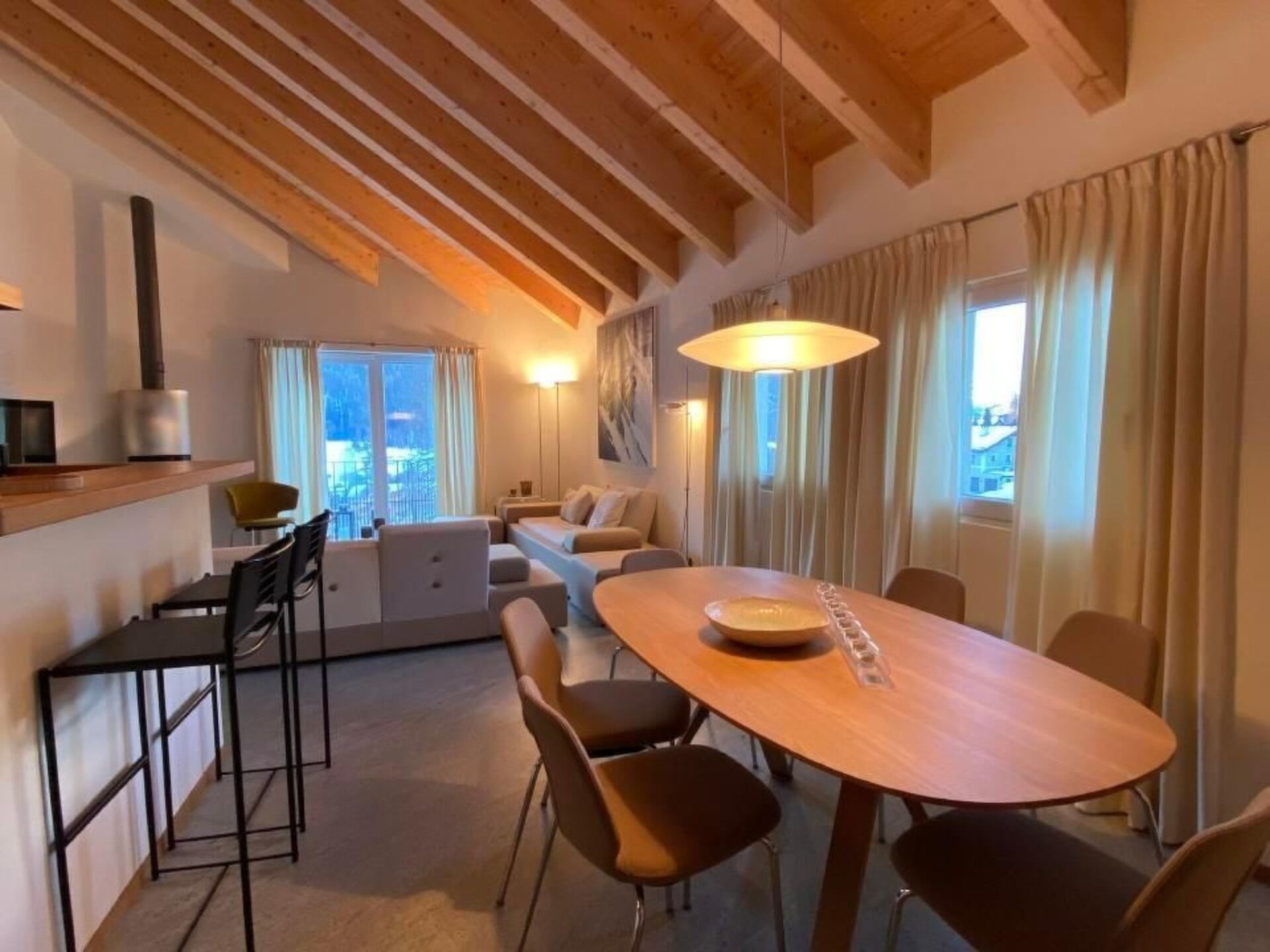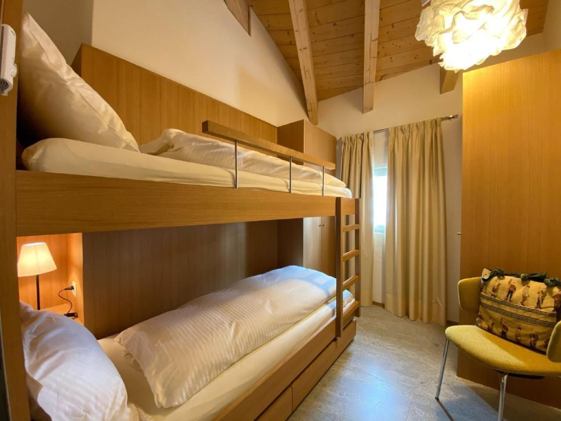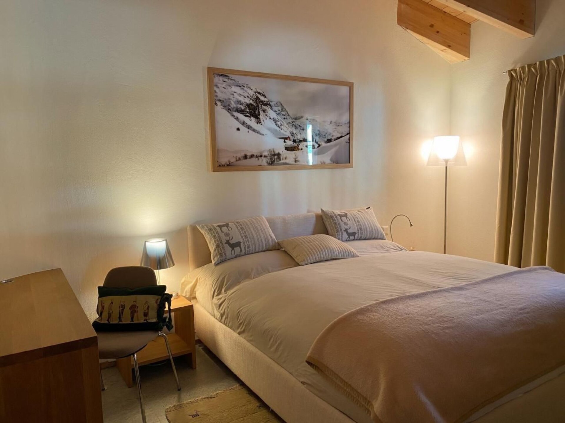 A sunny, modern 4 1/2 room apartment, 110 m² on the third floor of a house with a fantastic view over the valley and Chamues. The house is 330 m from the La-Punt Chamues train station, cross-country skiing trails, the Müsella ski lift can be reached in approx. 10 walking minutes, the next restaurant in approx. 2 minutes.The apartment can be reached by elevator from the underground car park and the house has also a laundry room (washing machine and dryer), a ski room, and a bike room. Two parking places are in the rental price included. The living room is modern and comfortably furnished with a flat screen TV. The adjoining dining room has an oval table with 6 chairs. In the entrance, there is a cloakroom and a large mirror. The master room has a double bed (180x200), its own bathroom with a bathtub and shower, toilet, and a dressing room. The second room also has a double bed (180x200) and a built-in wardrobe. It shares a bathroom with a shower and toilet with the third room, which is furnished with a bunk bed and two smaller built-in wardrobes. The kitchen has a dishwasher, stove, oven and all the utensils you need for cooking.Not suitable for children.Excursion possibilities: What mountains. What lakes. What light! Whether on the 580km (360 miles) of hiking paths strewn over all the mountains or by mountain bike along 400km (250 miles) of fabulous trails: the Upper Engadin offers a superb network of paths and trails amidst an unspoilt Alpine landscape and the inspiring lake plateau. Four flow trails on the Corviglia guarantee a perfect flow. Equally popular among sports enthusiasts are the Upper Engadin lakes; kiting, sailing, windsurfing, stand up paddling – the possibilities are virtually endless. The expanse of the inspiring high-lying valley can be experienced in a particularly striking way on the two 18-hole golf courses in Samedan and Zuoz. And besides the wide range of sporting options, visitors can take advantage of the first-class cultural activities on offer, such as a visit to a museum or to one of the numerous art galleries in the various villages.   In winter, the ski areas of Corviglia, Corvatsch, Diavolezza and family friendly Zuoz invite ski and snowboard enthusiasts to revel in 350 kilometres (218 miles) of the finest powder snow. Cross-country skiers will find over 220km (137 miles) of perfectly groomed trails in the Upper Engadin and the side valleys. The winter hiking paths and cross-country ski trails on the frozen Upper Engadin lakes are characterised by their light, sunshine and space amidst inspiring Alpine scenery. Those who would like to enjoy the tranquillity and beauty of the snow-covered forests can explore the side valleys of Val Roseg, Val Fex or Val Bever on 150 kilometres (90 miles) of winter hiking paths. Visitors who prefer to have everything in view, meanwhile, will delight in the breathtaking vistas on the panorama hiking trails high above the lakes on Muottas Muragl.   Families can bask in the Engadin sun during a ride in a horse-drawn carriage into the Val Roseg or Val Fex, or race down the mountainside into the valley on the winding, 4.2km (2.6 mile) long toboggan run on Muottas Muragl.  Welcome to the EngadinOther living room features (Living room1): Dining area with dining table and 6 chairs / 3 bar stoolsOther bedroom furniture (Bedroom1): Closet 4m², Bathroom  4m²Other kitchen equipment (Kitchen1): Nespresso coffee machine, cheese fondue, raclette...Nearby sports facilities: Ice skating, Golf course, Climbing, Mountainbiking, Paragliding, Bike tours, Horse stalls (guests), Indoor riding arena, Riding possibilities, Skiing (alpin), Cross-country skiing, Tennis, Sailing