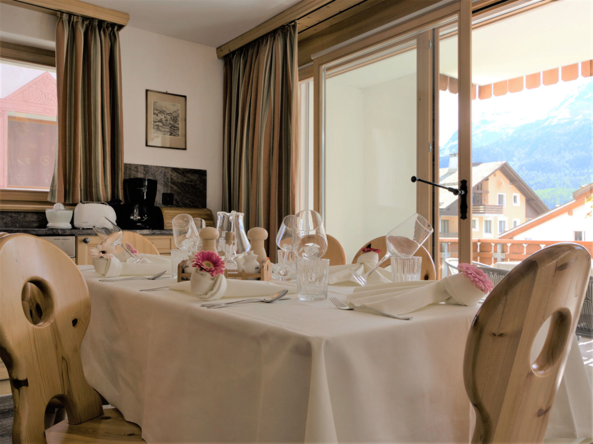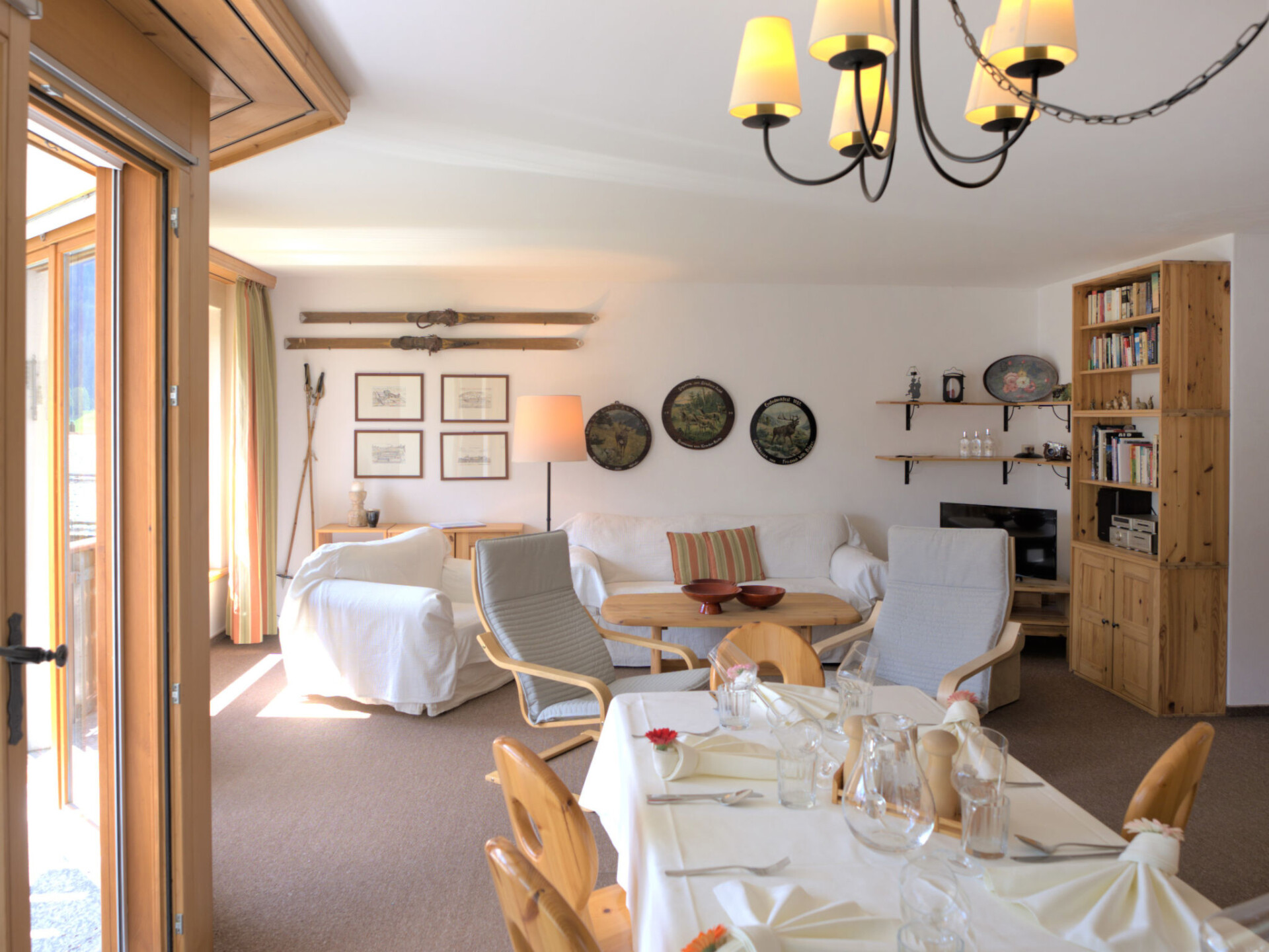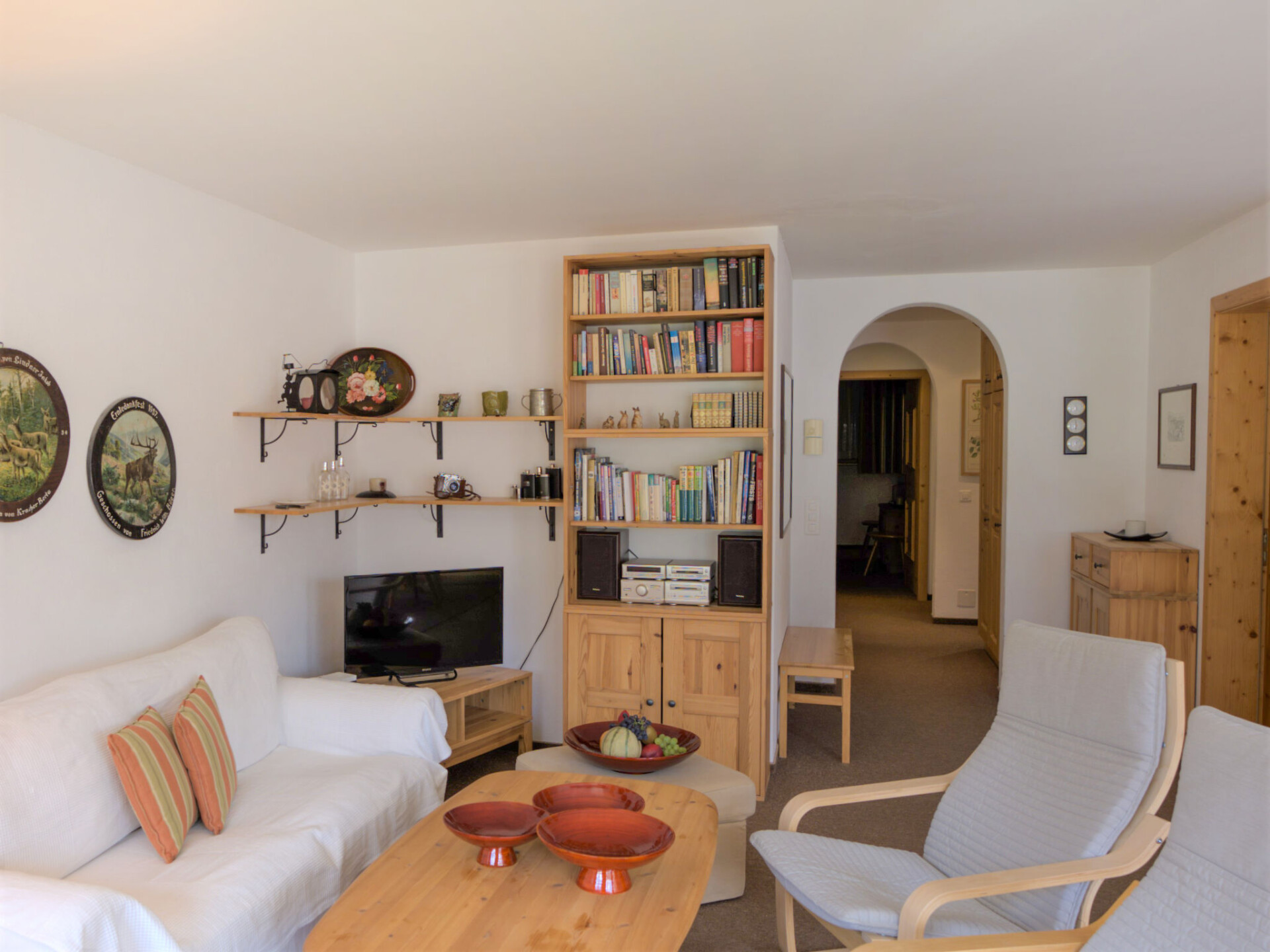"Chesa Dal Luf B5", appartement 4-kamers 90 m2 op de 1e verdieping. Smaakvol en gezellig ingericht: woon-/eetkamer met TV en DVD. Uitgang naar het balkon, op het zuidoosten. 1 kleine kamer met 1 bed (80 cm, lengte 190 cm), 1 uitschuifbaar bed (lengte 180 cm). 1 kamer met 1 x 2 stapelbedden (80 cm, lengte 200 cm). 1 2-pers. kamer met 1 2-pers bed (2 x 80 cm, lengte 200 cm), bad/bidet/WC. Open keuken (afwasmachine, 3 keramische glas kookplaten, 1 inductiekookplaten, broodrooster, waterkoker, magnetron, elektrische koffiemachine, pads voor de koffiemachine (Nespresso) extra, raclette oven, fondue Set (kaas)) met eettafel. Douche/bidet/WC. Vloerverwarming. Groot balkon. Mooi uitzicht op de bergen. Ter beschikking: strijkijzer, haardroger. Internet (Internet (WiFi), gratis). Garage nr. 9, hoogte 250 cm, breedte 230 cm.
