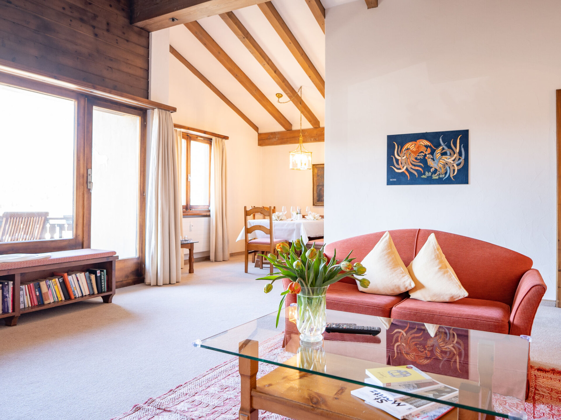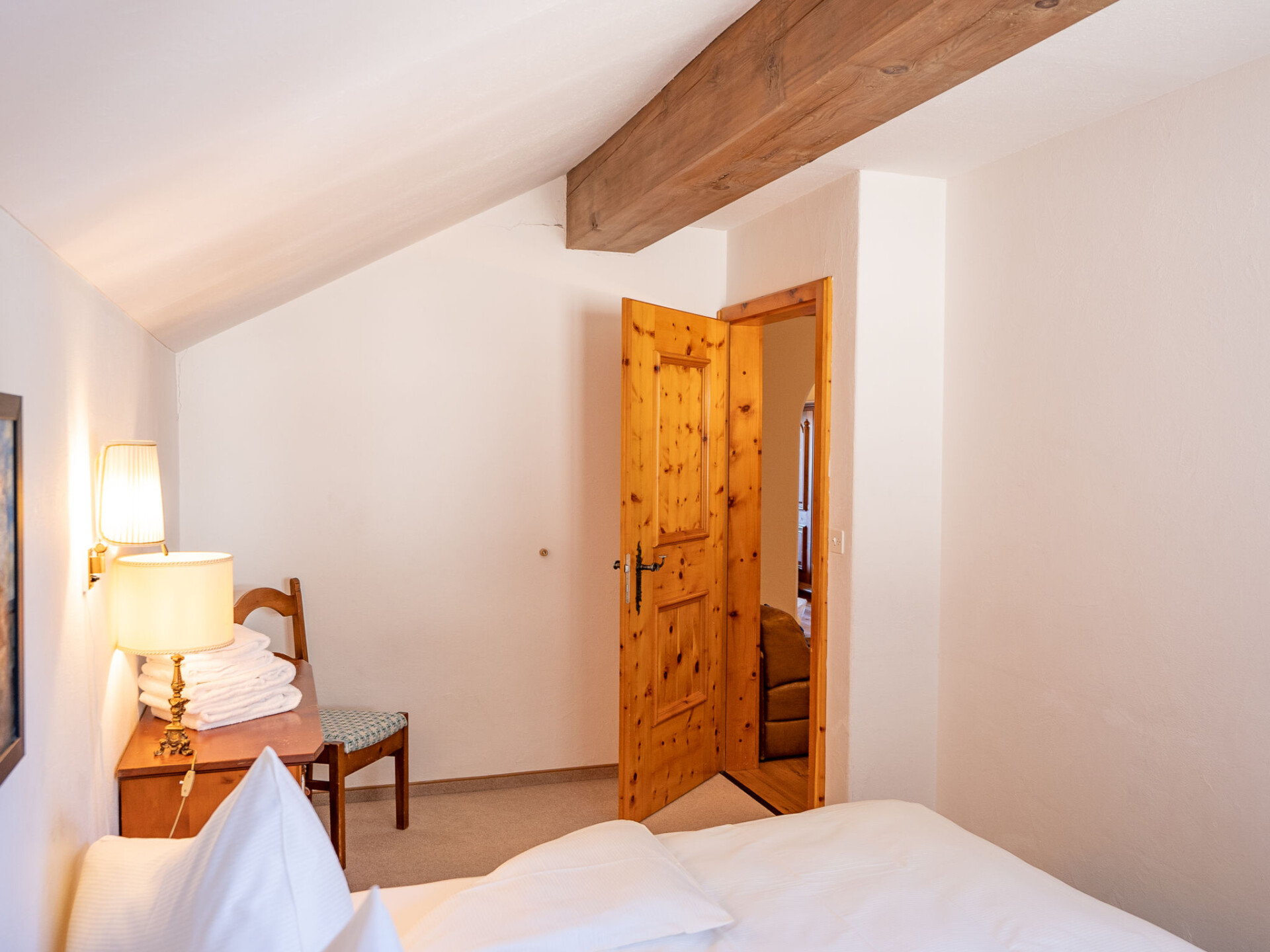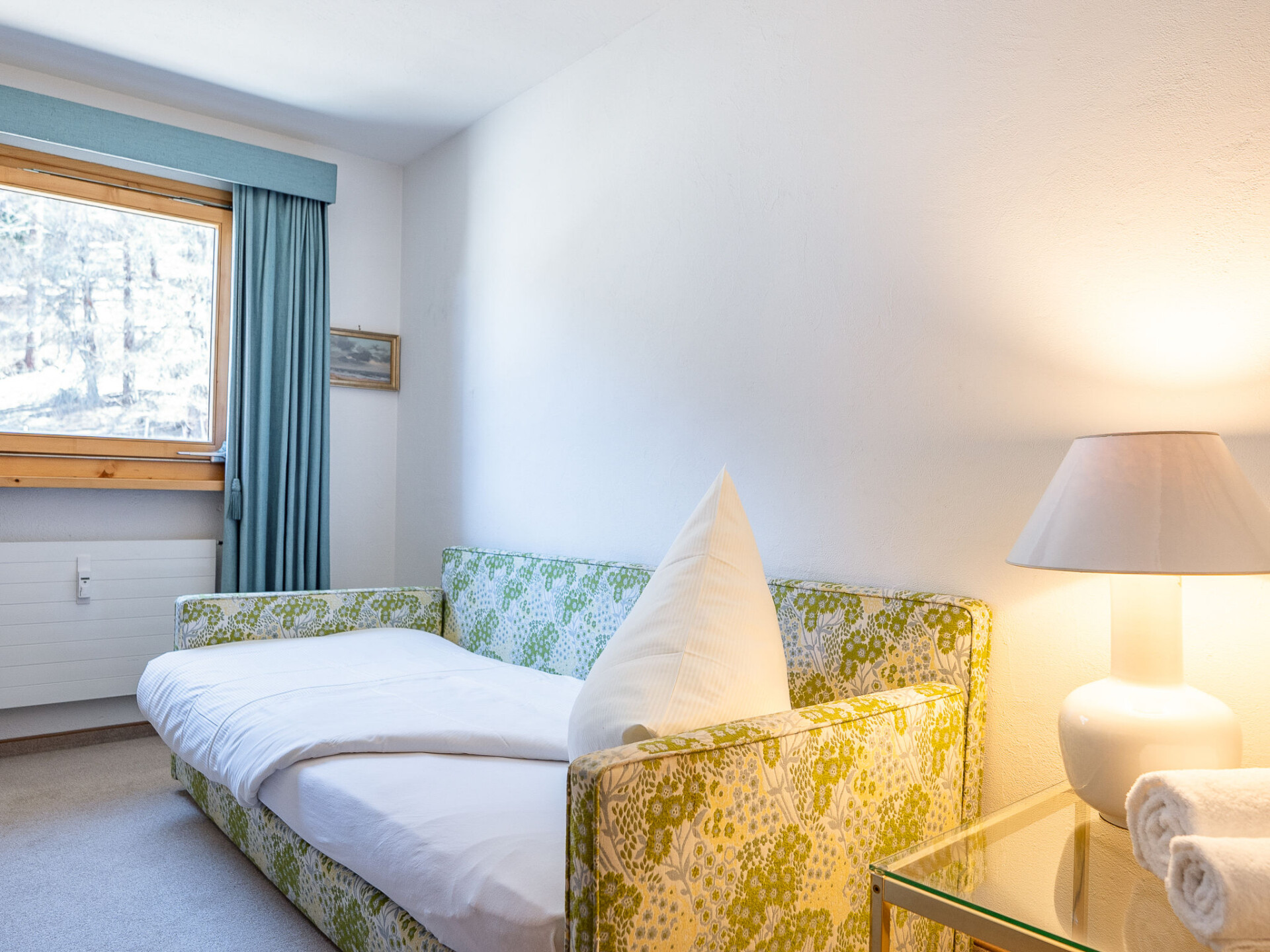 "Chesa La Sajetta 12", appartement 4-kamers 100 m2, op de bovenste verdieping. Woon-/eetkamer met open haard (alleen decoratie), TV, stereo-installatie en DVD. Uitgang naar het balkon, op het westen. 1 kamer met 2 bedden (100 cm, lengte 195 cm). 1 kamer met 1 bed (90 cm, lengte 195 cm), douche/WC. 1 kamer met 1 2-pers bed (2 x 110 cm, lengte 195 cm). Keuken (oven, afwasmachine, 4 keramische glas kookplaten, broodrooster, waterkoker, elektrische koffiemachine, pads voor de koffiemachine (Nespresso) extra, fondue Set (chinese, kaas)) met doorgeefluik. Bad/bidet/WC. Verwarming. Klein balkon. Mooi uitzicht op de bergen. Ter beschikking: strijkijzer, haardroger. Internet (Internet (WiFi), gratis). Garage nr. W 12, hoogte 210 cm, breedte 225 cm. Geen lift. De open haard mag niet worden gebruikt.