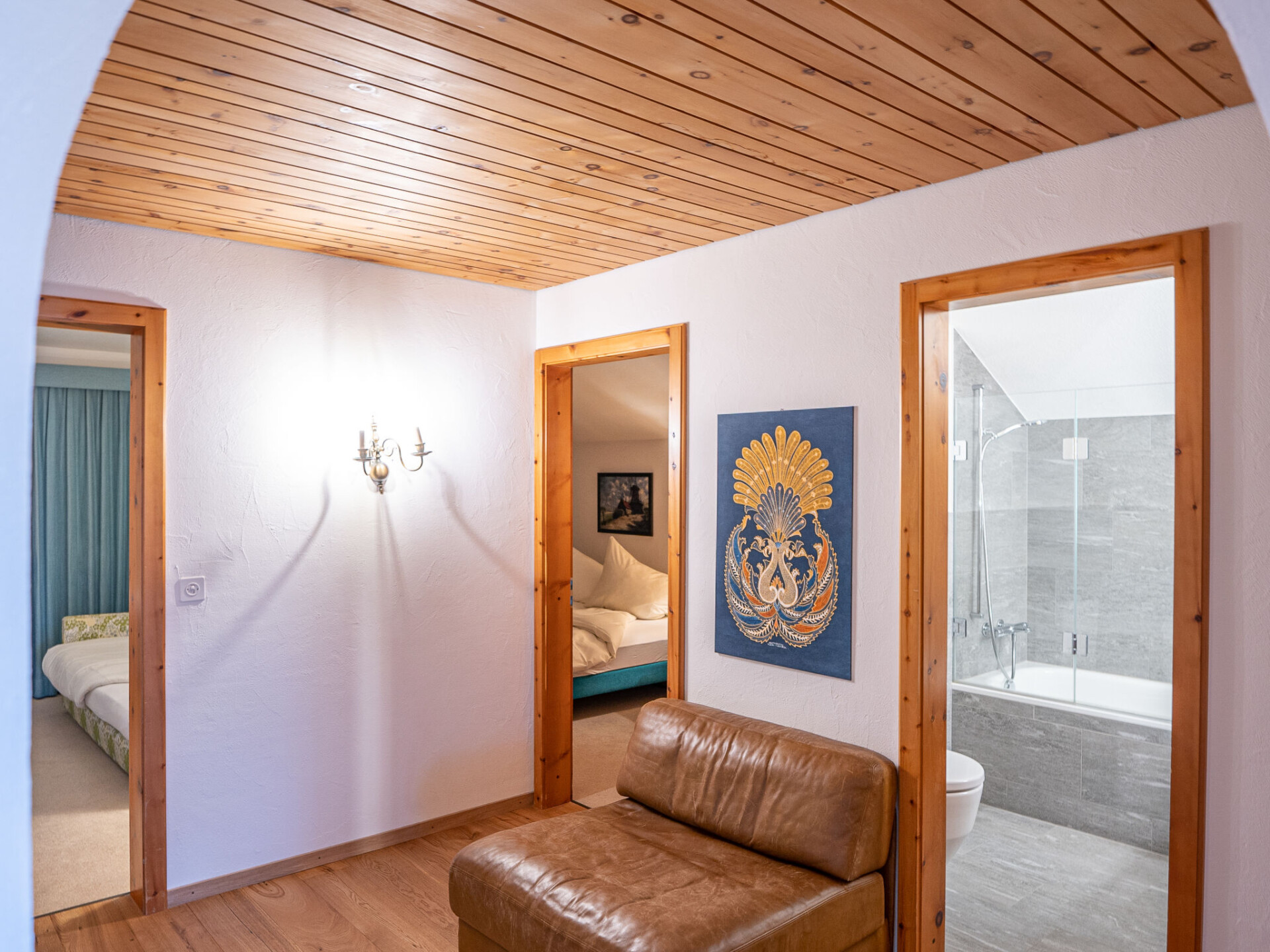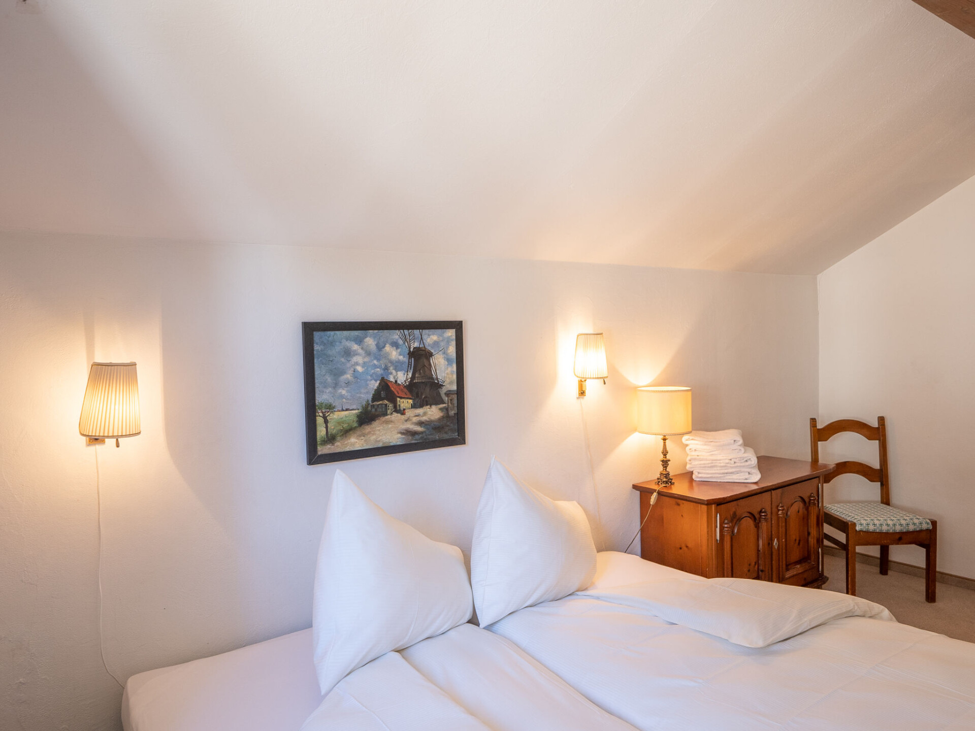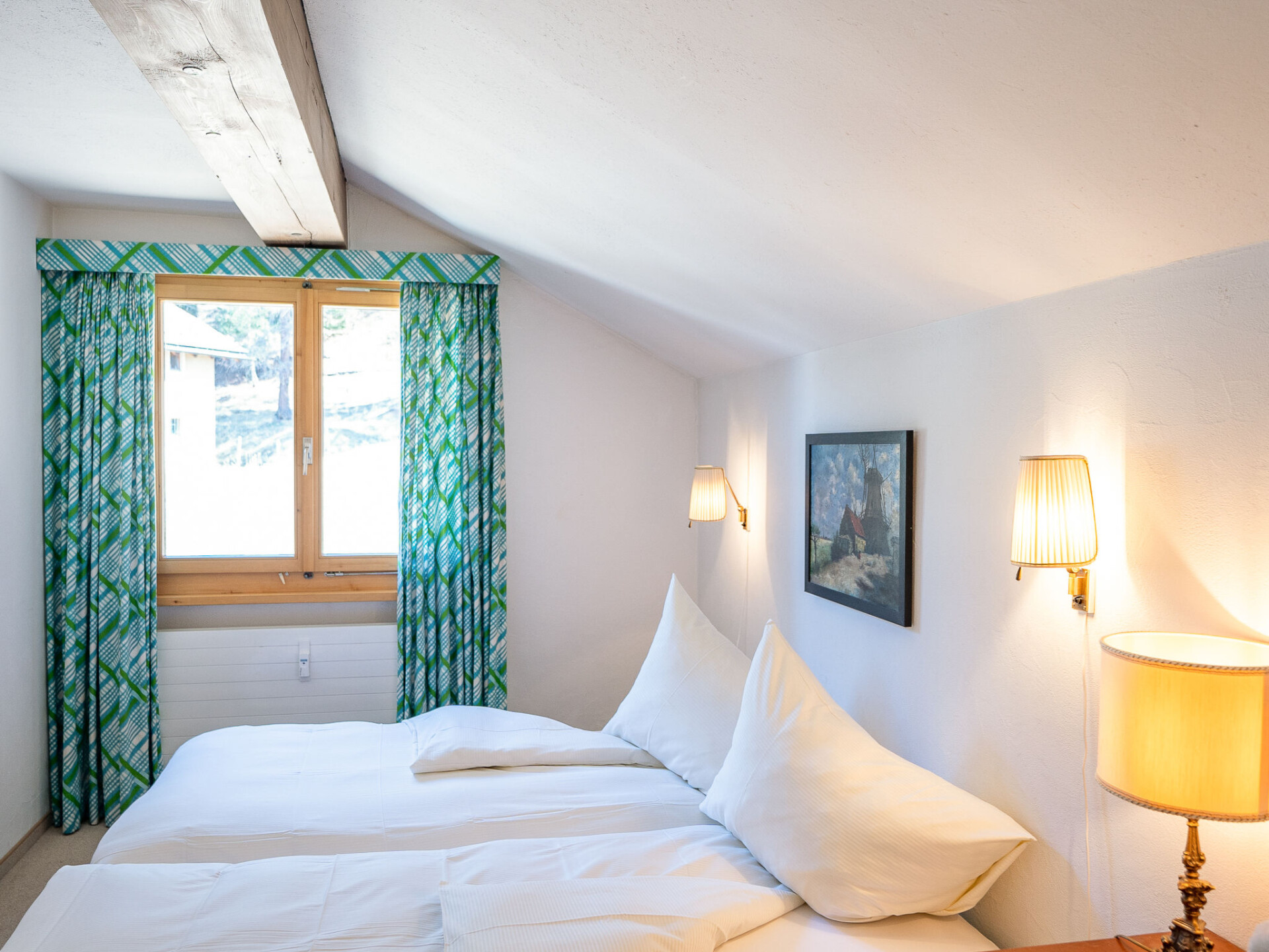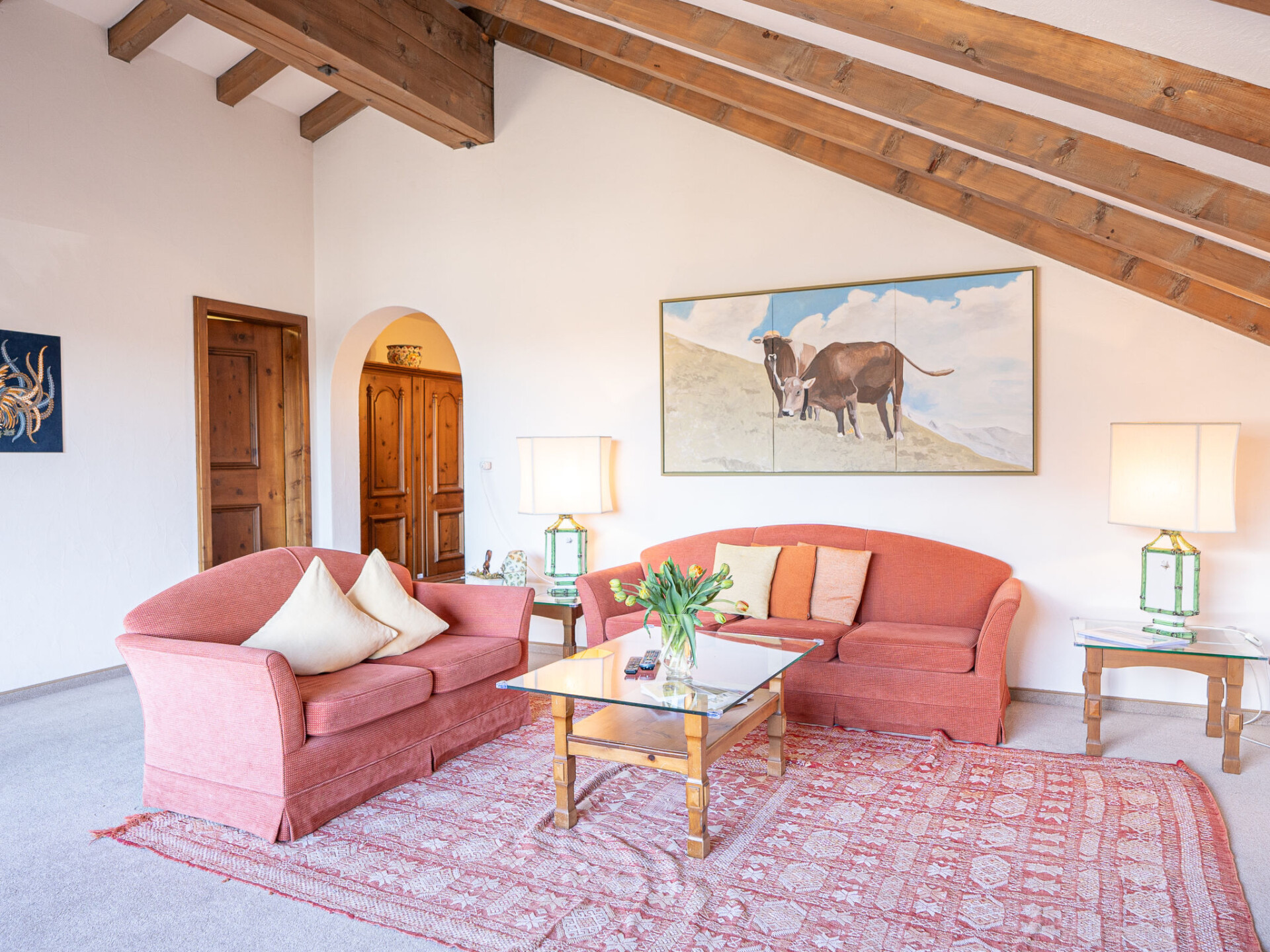 "Chesa La Sajetta 12", appartement 4-kamers 100 m2, op de bovenste verdieping. Woon-/eetkamer met open haard (alleen decoratie), TV, stereo-installatie en DVD. Uitgang naar het balkon, op het westen. 1 kamer met 2 bedden (100 cm, lengte 195 cm). 1 kamer met 1 bed (90 cm, lengte 195 cm), douche/WC. 1 kamer met 1 2-pers bed (2 x 110 cm, lengte 195 cm). Keuken (oven, afwasmachine, 4 keramische glas kookplaten, broodrooster, waterkoker, elektrische koffiemachine, pads voor de koffiemachine (Nespresso) extra, fondue Set (chinese, kaas)) met doorgeefluik. Bad/bidet/WC. Verwarming. Klein balkon. Mooi uitzicht op de bergen. Ter beschikking: strijkijzer, haardroger. Internet (Internet (WiFi), gratis). Garage nr. W 12, hoogte 210 cm, breedte 225 cm. Geen lift. De open haard mag niet worden gebruikt.